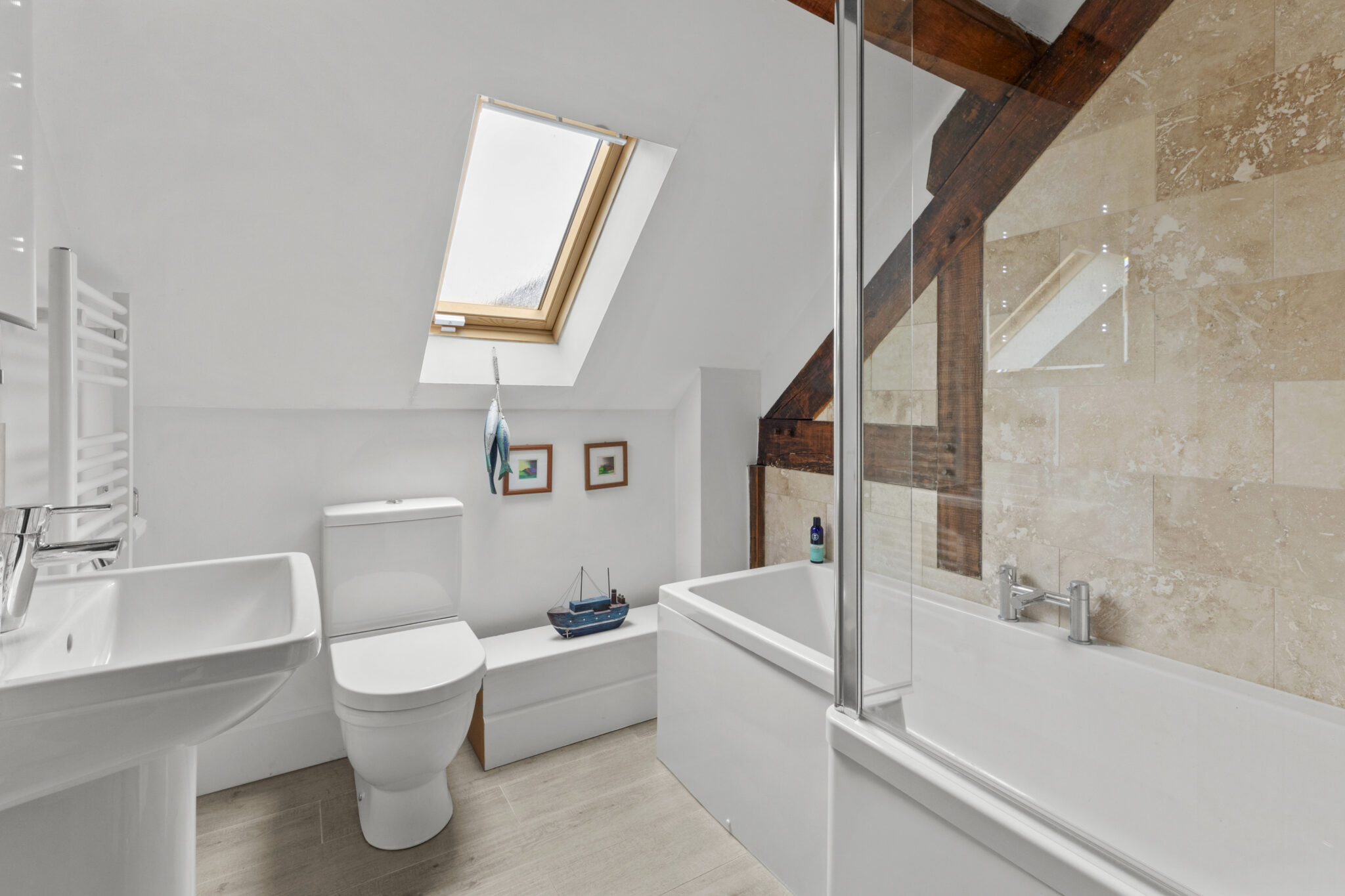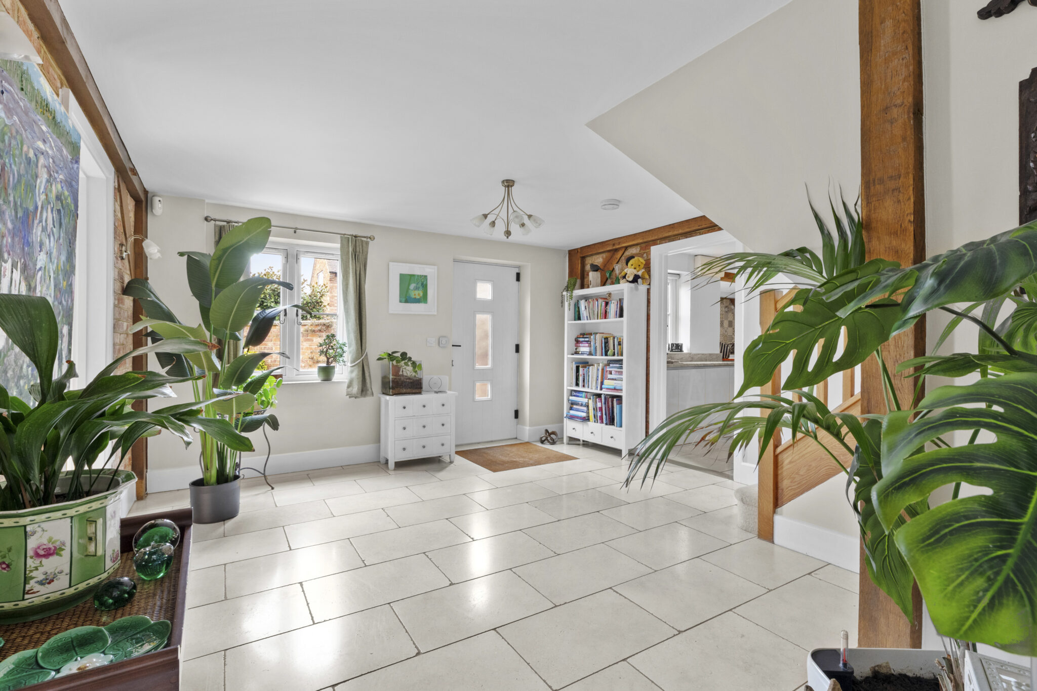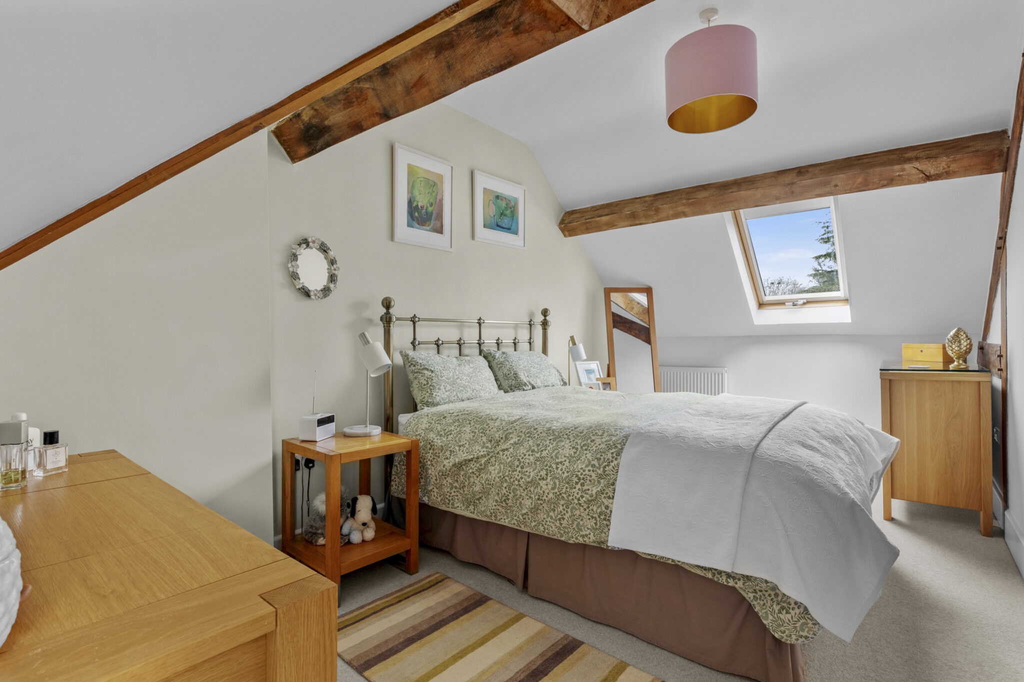 A bespoke oak staircase rises to a spacious first floor, where the property’s contemporary finish is complemented by beautiful exposed beams throughout. The principal suite is particularly impressive, featuring a walk-through dressing area and a luxurious dual-aspect en-suite with a freestanding bath and walk-in double shower. Two further generous double bedrooms, both with fitted wardrobes, are served by a stylish family bathroom fitted with a modern white suite.