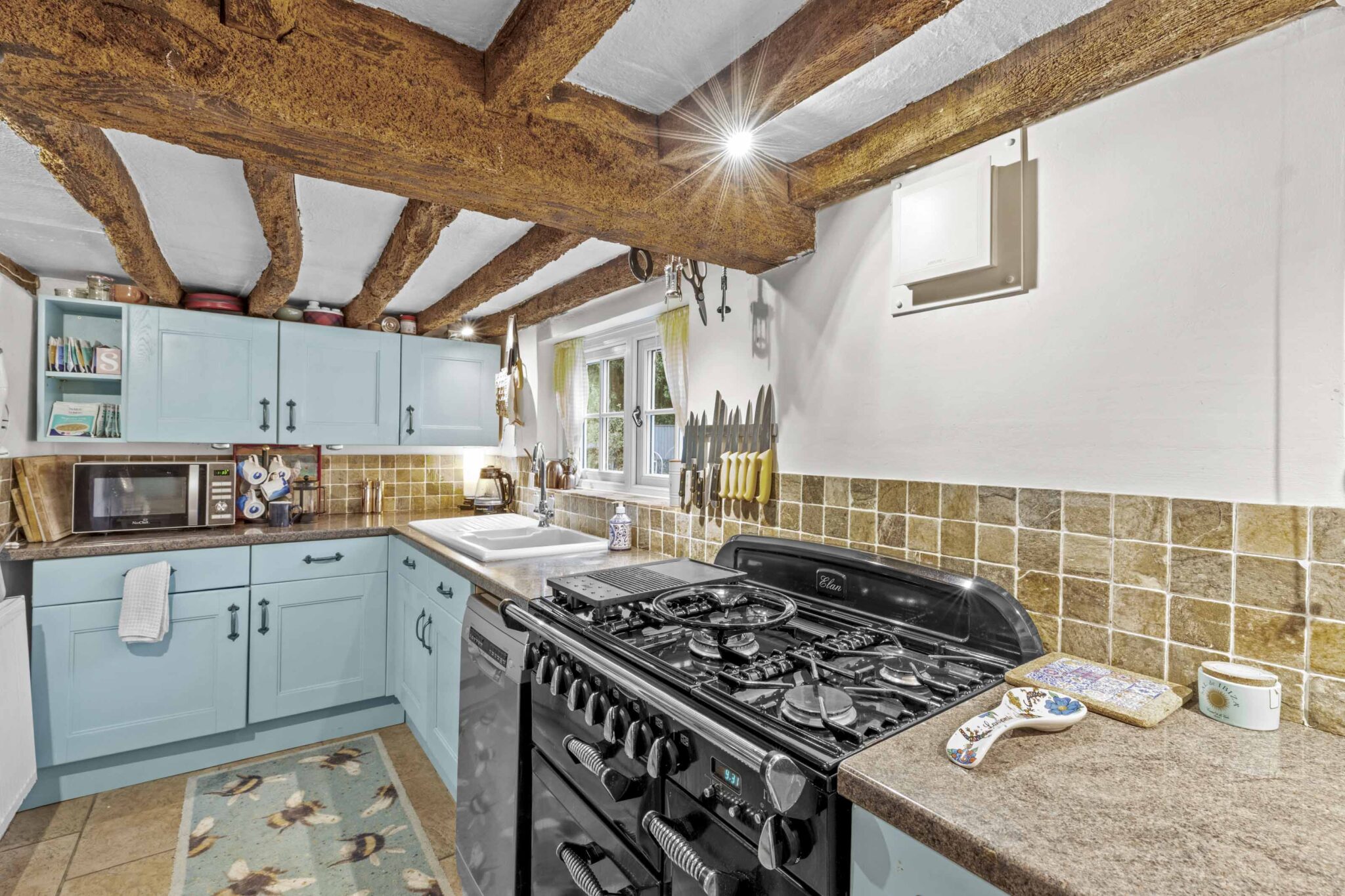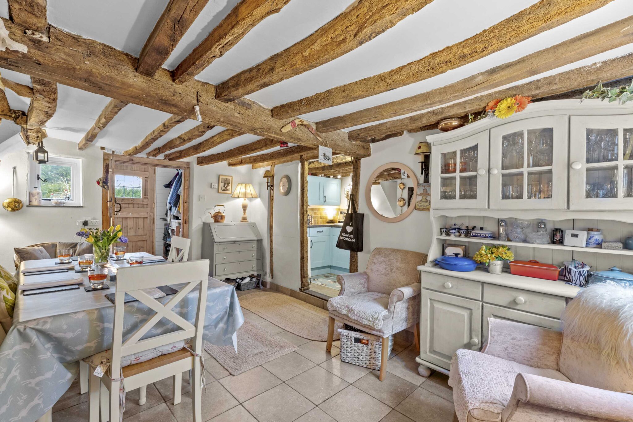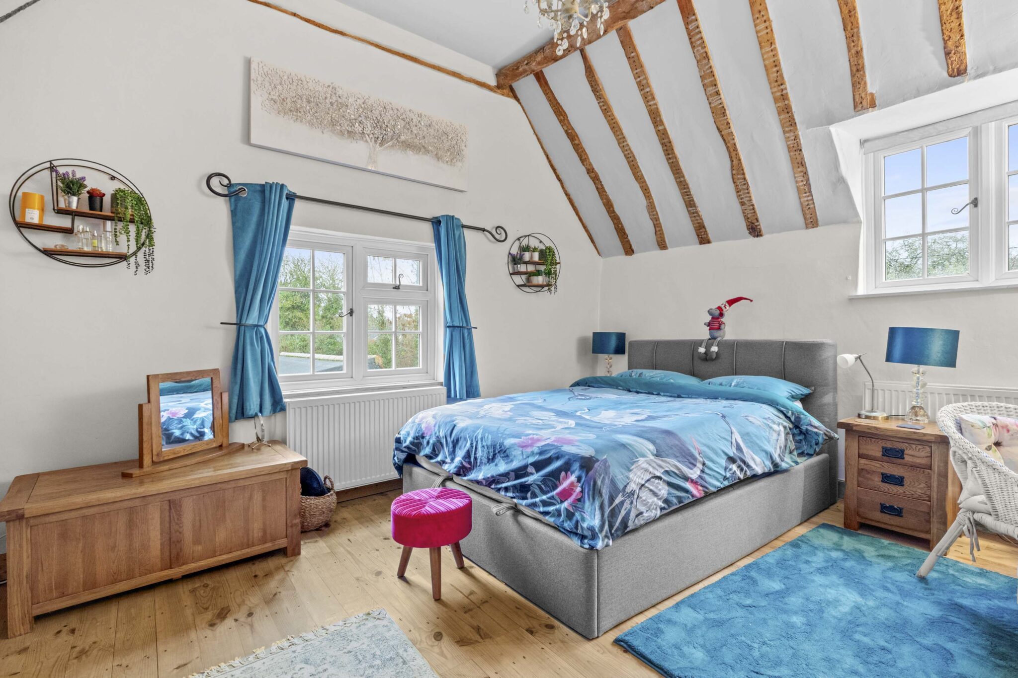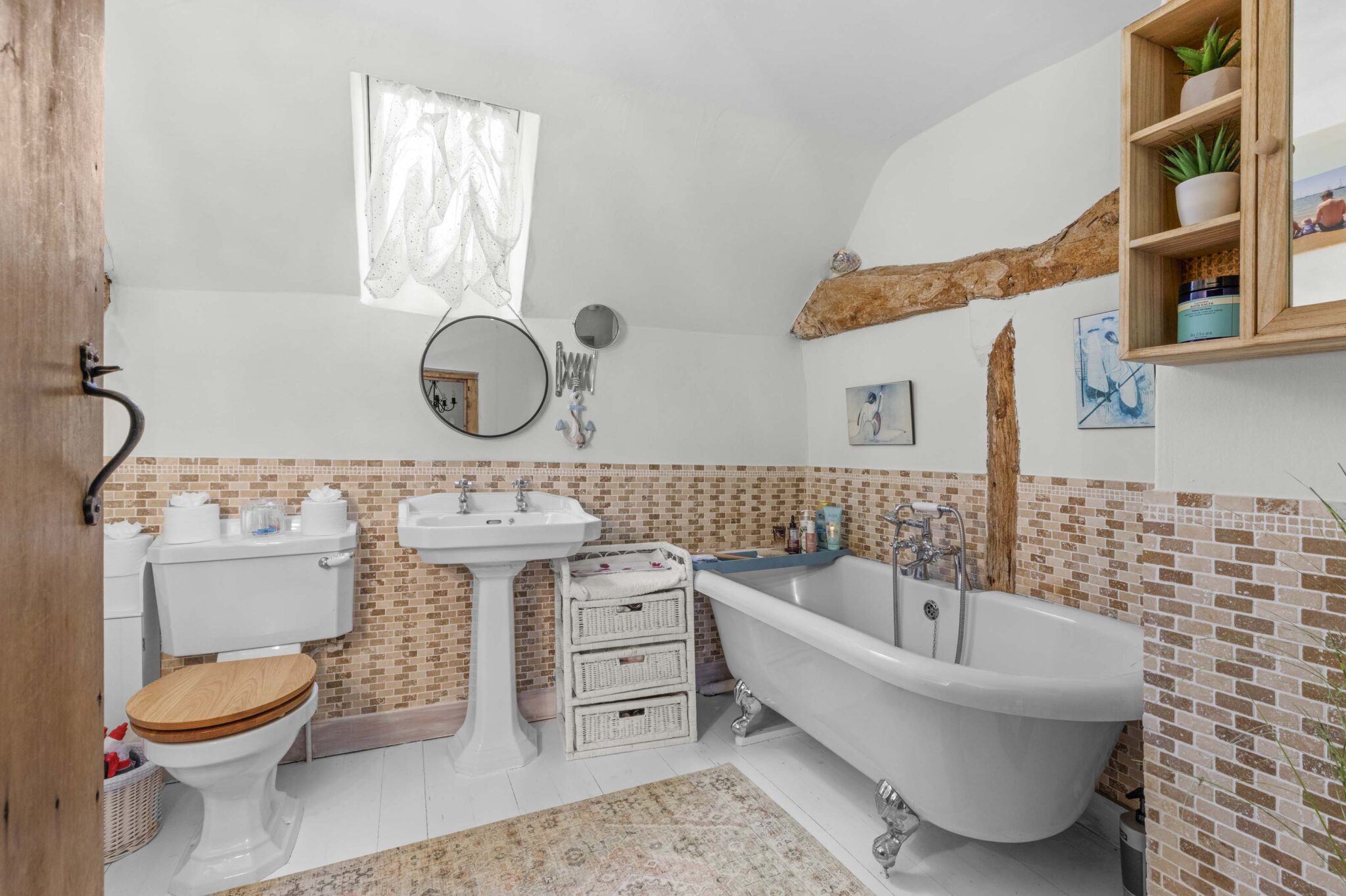 Upstairs are two generous double bedrooms, both with vaulted ceilings and exposed beams, with the principal bedroom enjoying a dual aspect. The bathroom is well appointed with a freestanding roll-top bath, complementing the home’s period charm.