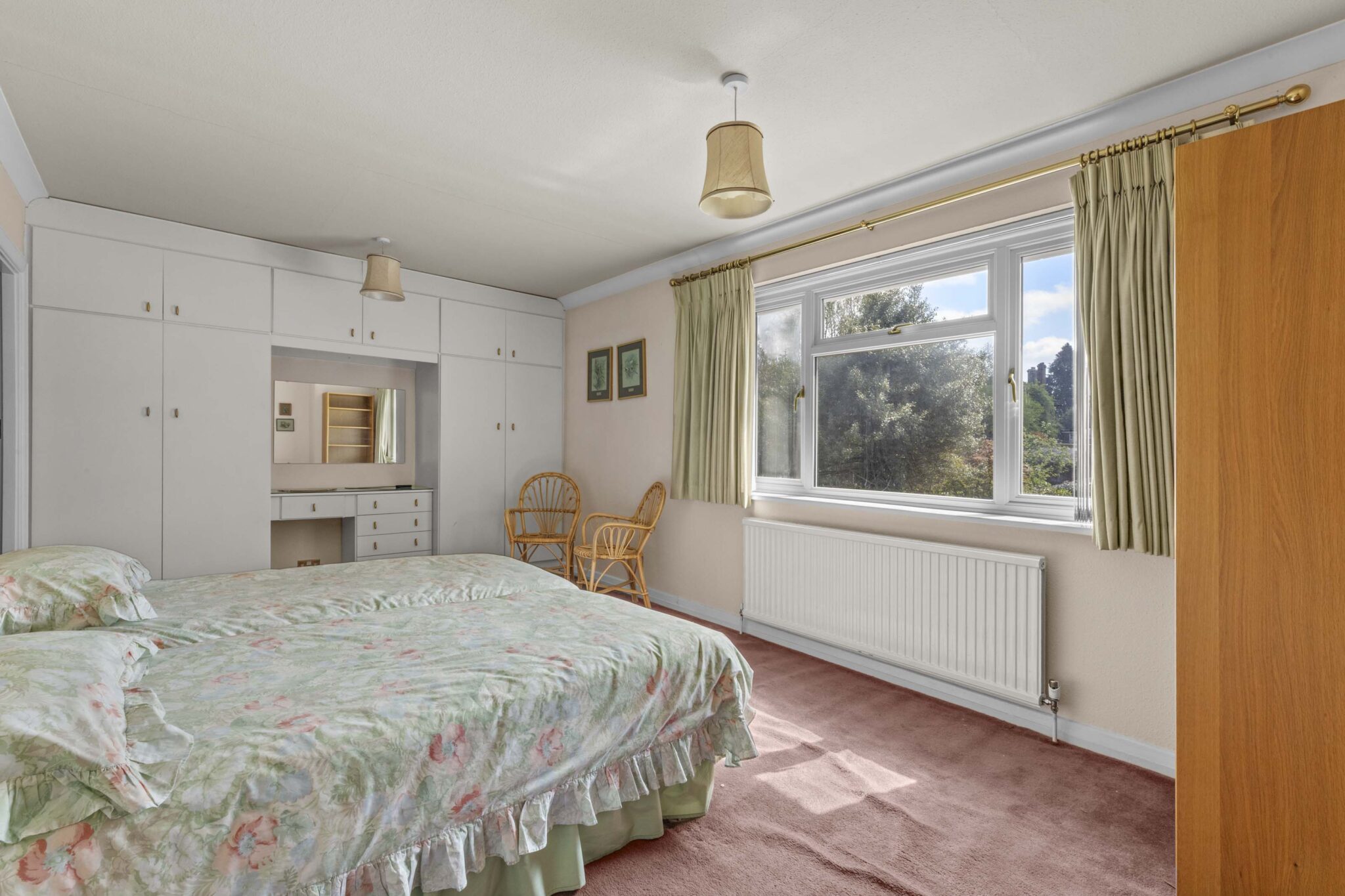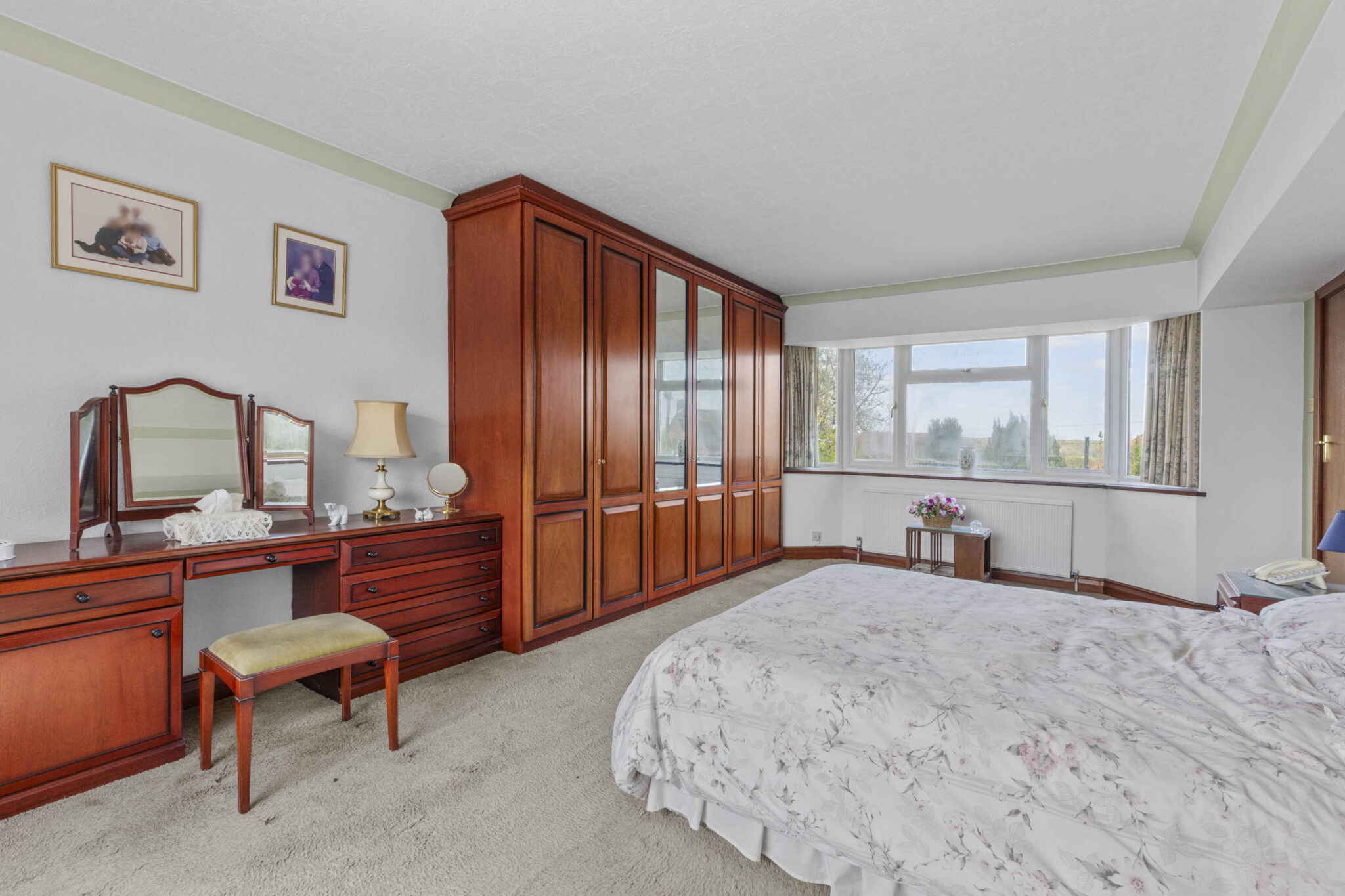 Upstairs, a galleried landing leads to the principal bedroom, which benefits from fitted wardrobes and a private ensuite bathroom, creating a tranquil retreat. Two further double bedrooms, both with fitted cupboards, are served by a spacious family bathroom, ensuring ample accommodation for family or guests.