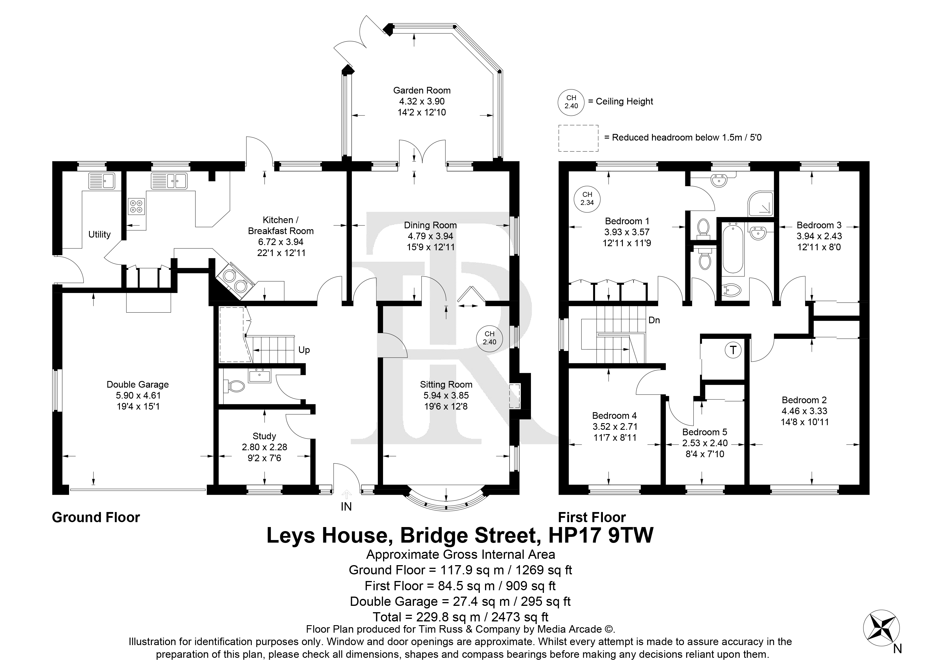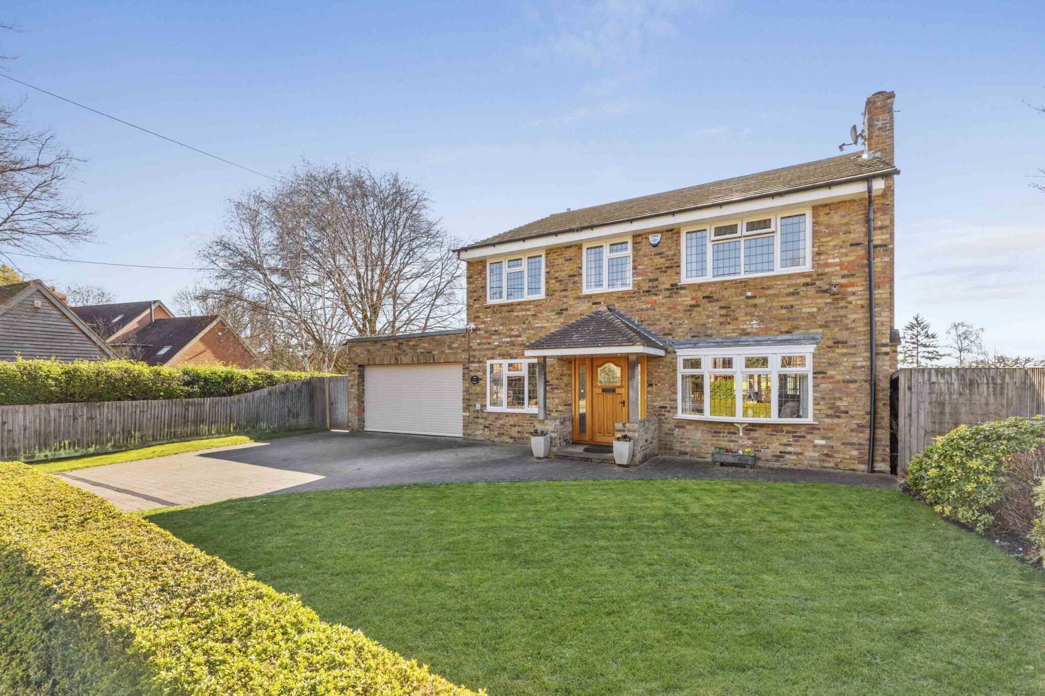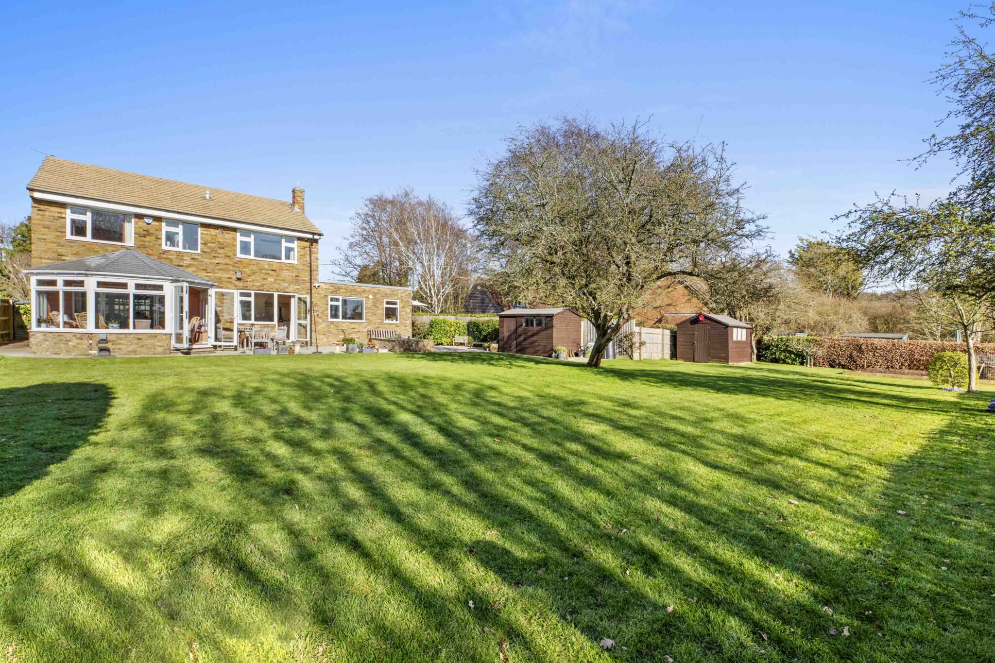 Upstairs, the principal bedroom benefits from fitted wardrobes and a three-piece en suite shower room. There are four further bedrooms, served by a family bathroom and an additional first-floor W/C.