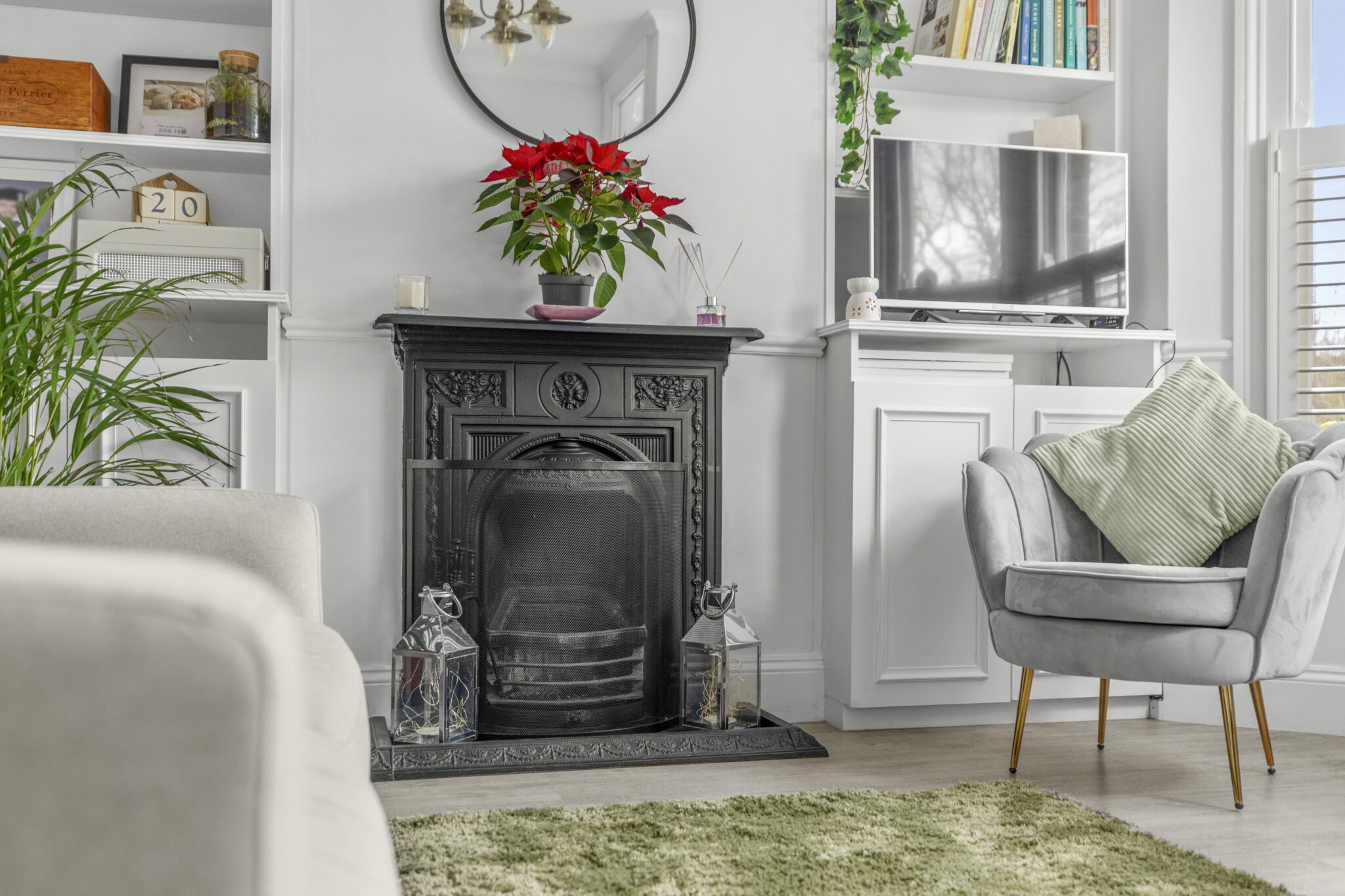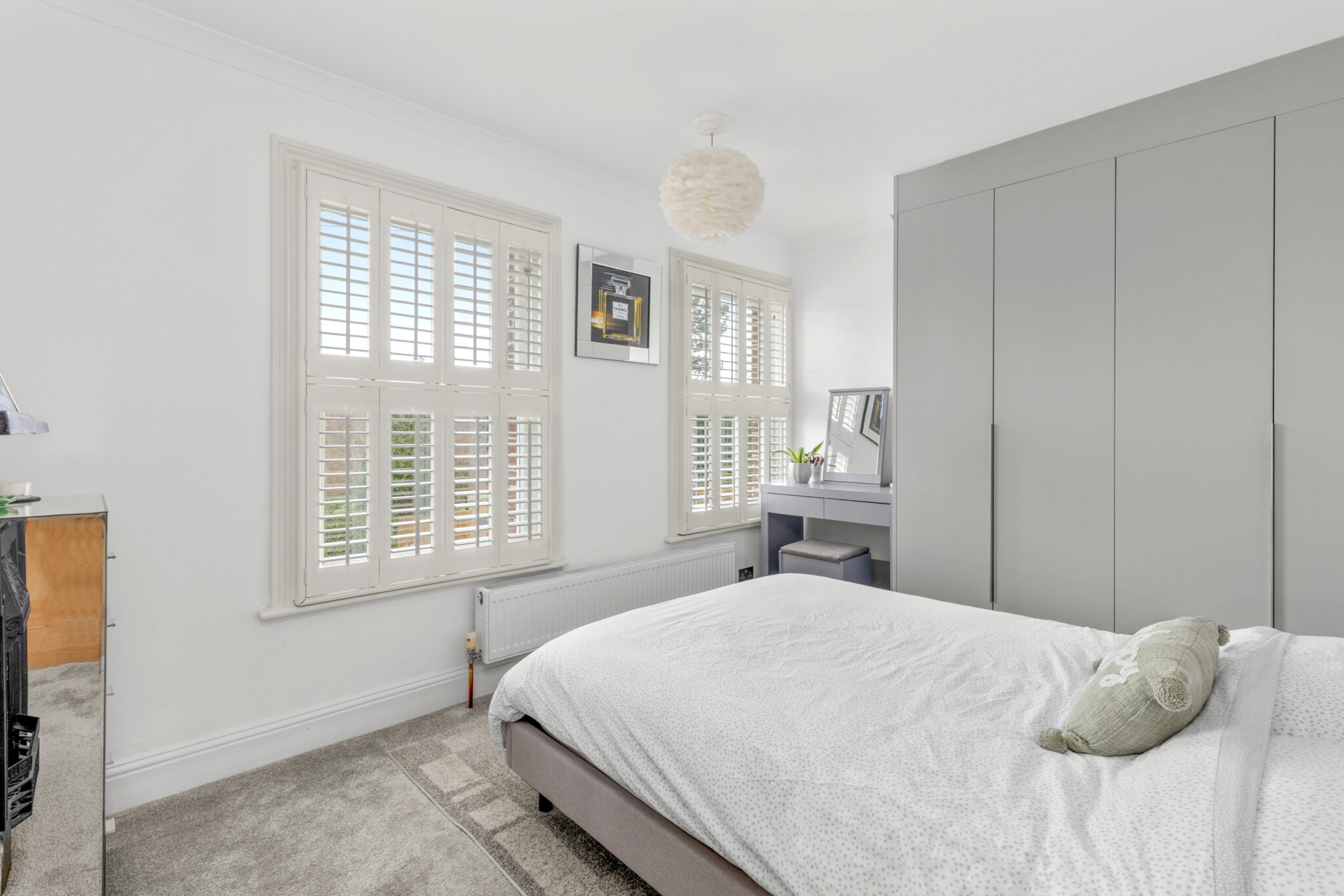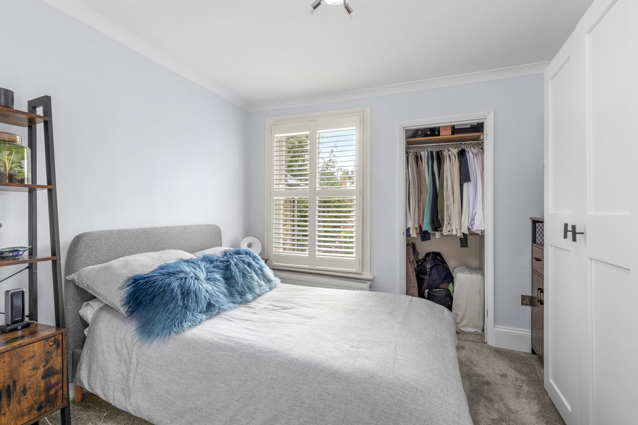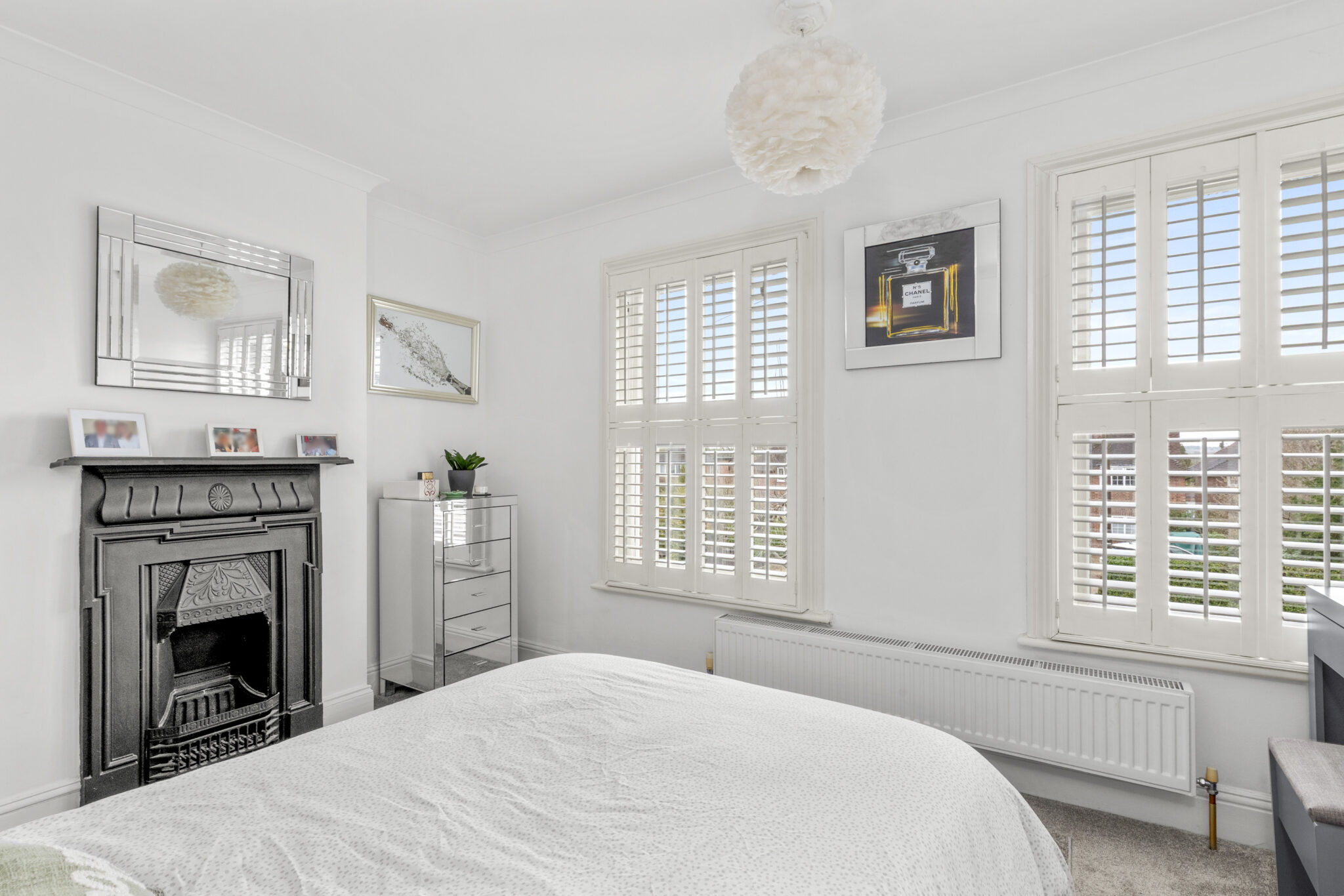 Inside, the welcoming front reception room features a large bay window with plantation shutters, an original cast iron fireplace and bespoke fitted storage.