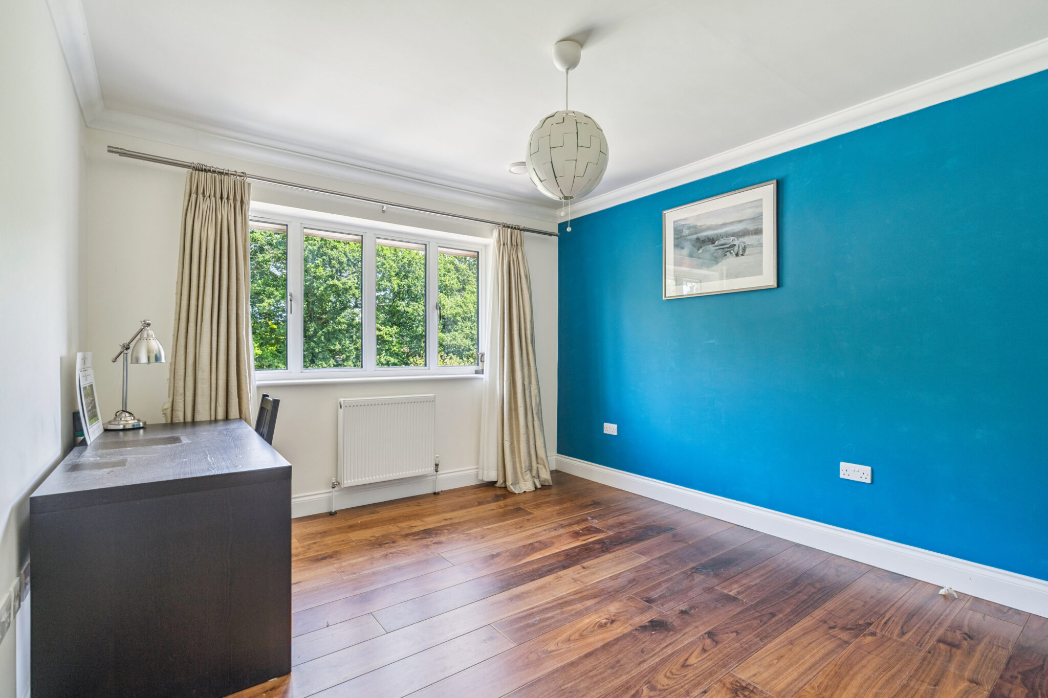 Built in 2015, this impressive 3,500 sq ft residence combines contemporary luxury with tranquil wellness living across three beautifully planned floors. Behind electric gates, the home offers premium walnut flooring, triple glazing, and sophisticated air circulation throughout.