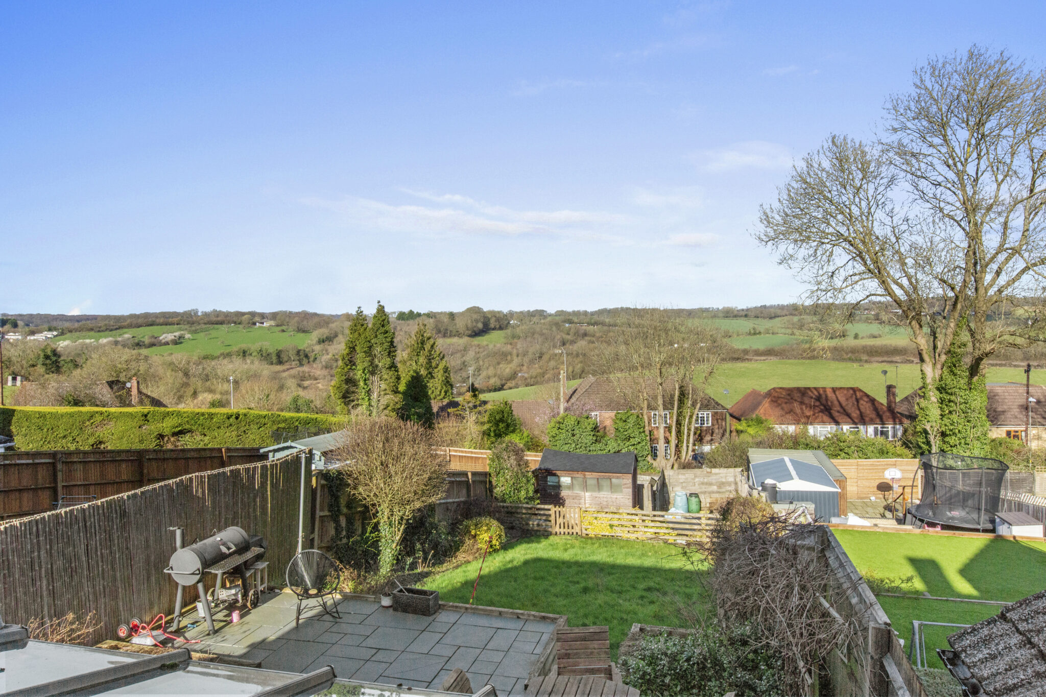 The rear garden is a splendid feature of the property having been thoughtfully landscaped to maximise enjoyment of the spectacular view. There is a large paved terrace with ample seating and dining space with steps down to a level lawned area with various shrub/floral borders. There is a further enclosed area to the rear with workshop/shed. This area offers potential to site a spacious garden room/office and to create on-site parking given there is a dropped curve (and turning) off Holtspur Top Lane.
