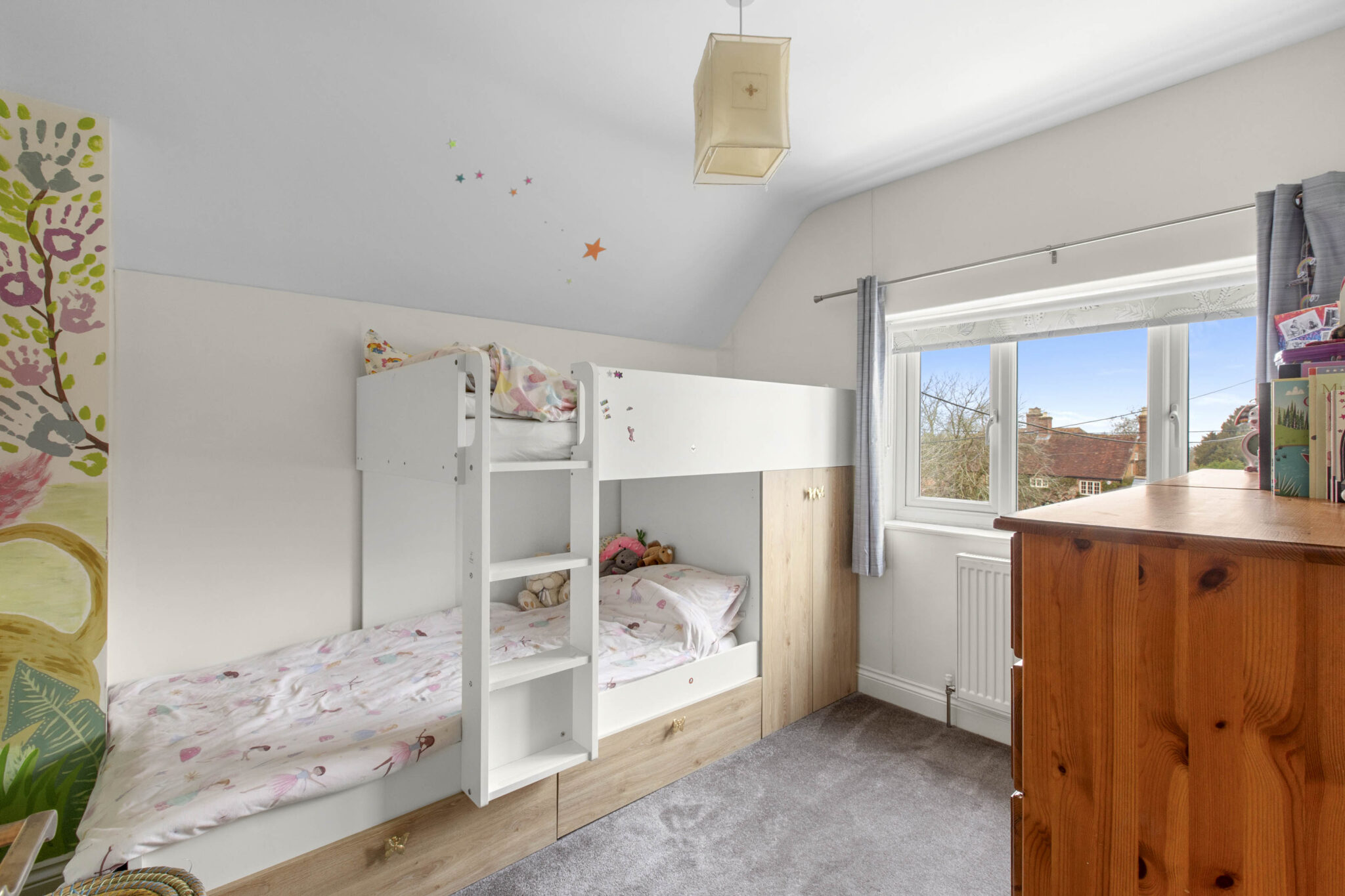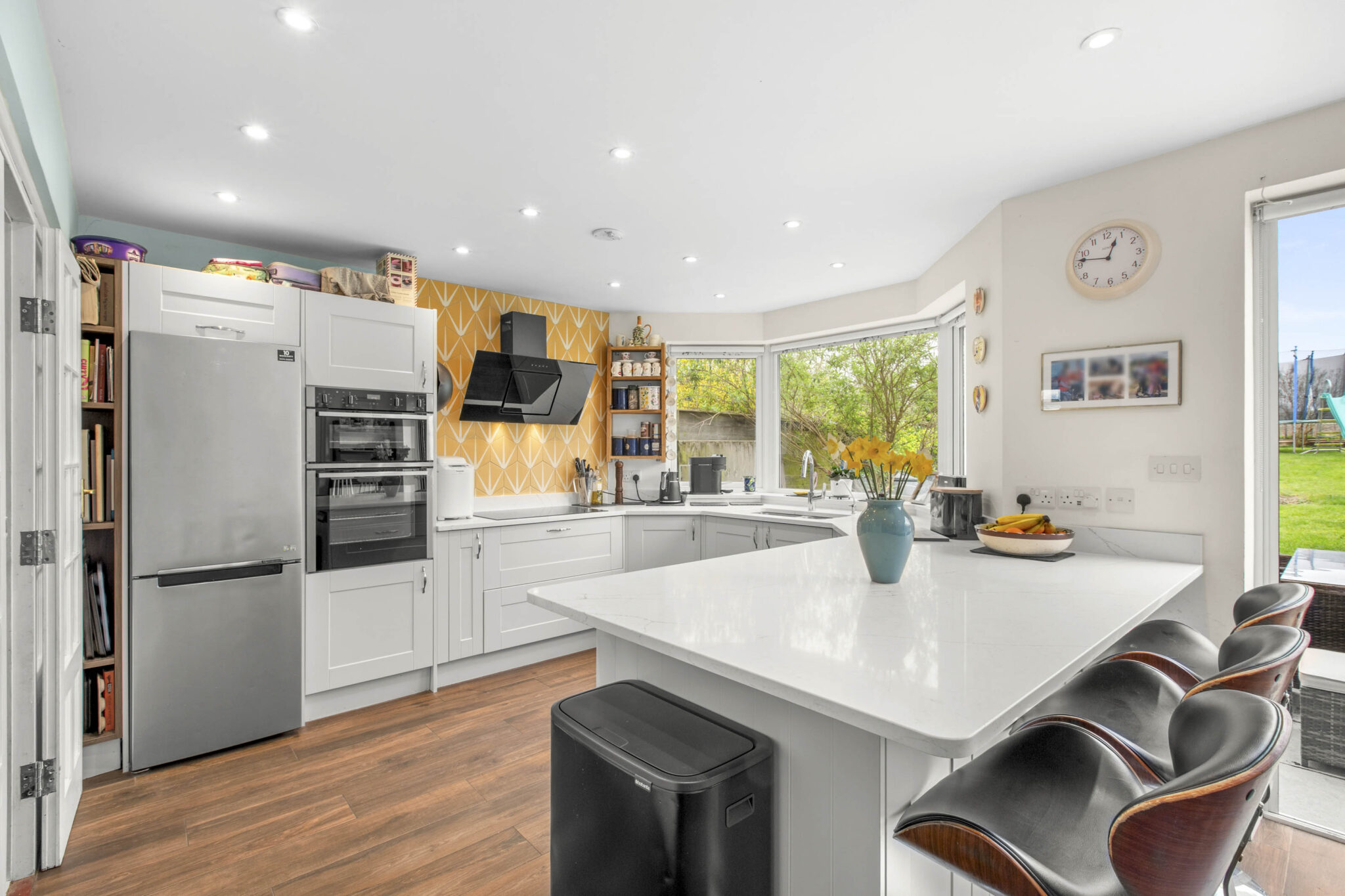 Upstairs are four well-proportioned bedrooms, including a principal bedroom with bespoke fitted wardrobes and lovely views over the surrounding hills, along with a contemporary family bathroom finished to a high standard.