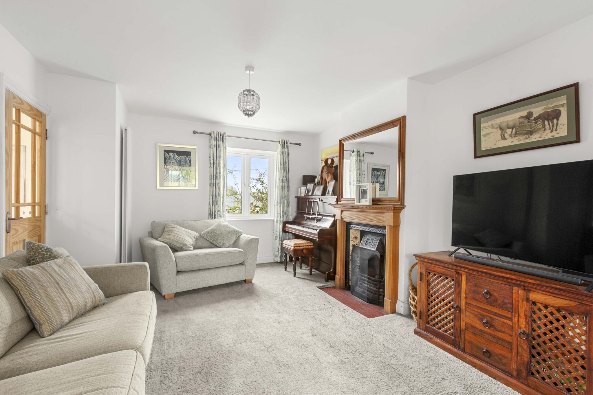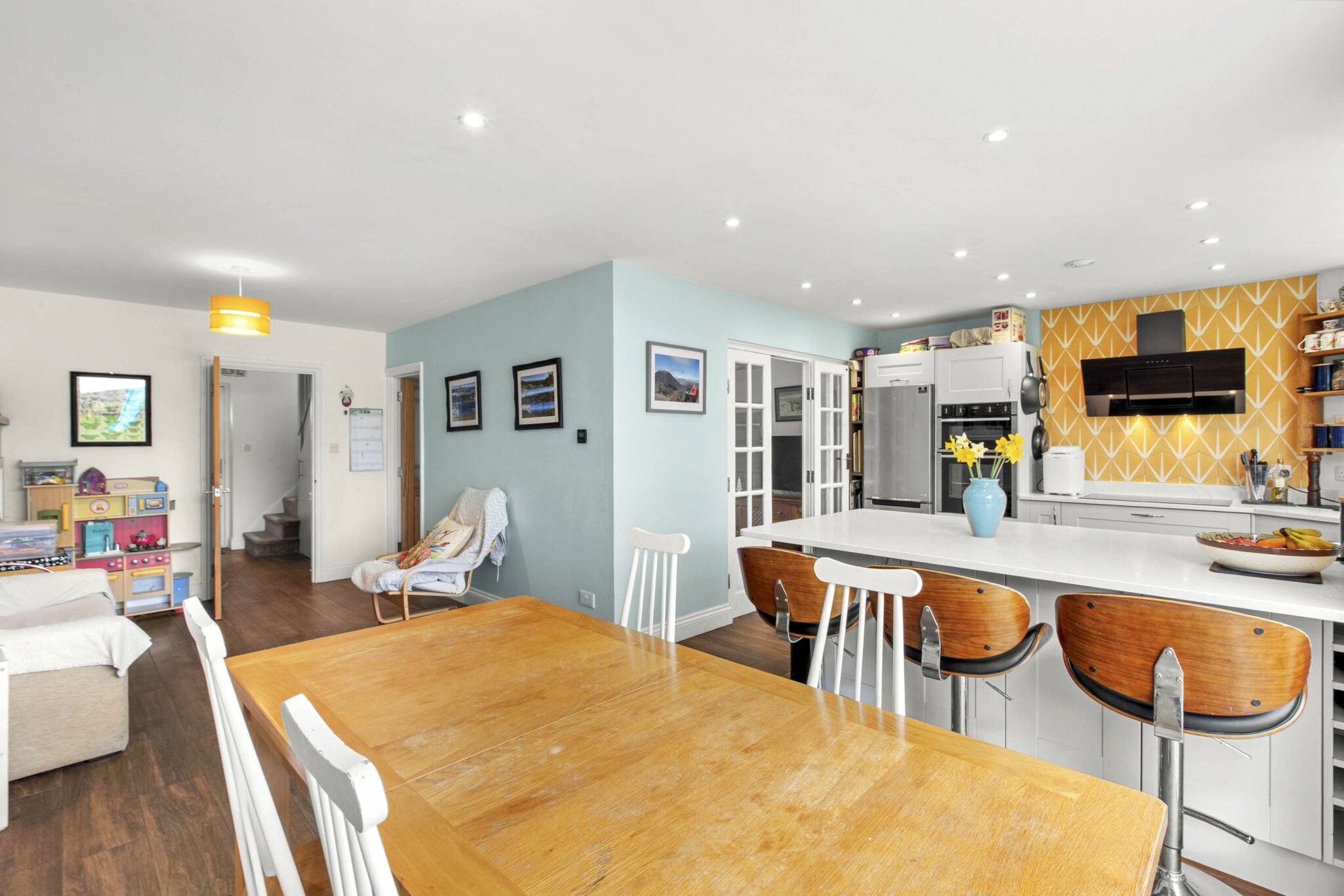 The ground floor features a welcoming entrance hall leading into a bright open-plan kitchen/dining area, thoughtfully designed with French-style units, a breakfast bar, and generous storage. This light-filled space also offers room for a snug or play area, making it ideal for modern family life and entertaining. A separate living room provides a cosy retreat, complete with an original cast iron fireplace and double doors opening into the kitchen. A useful utility area is located within the garage.