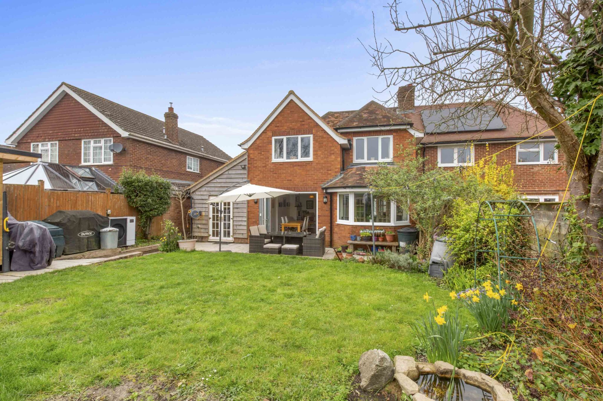 Renovated four-bed semi in Bledlow with countryside views, open-plan kitchen, garage, south-facing garden, outbuilding, air-source heating, and easy access to Chiltern walks and local amenities.