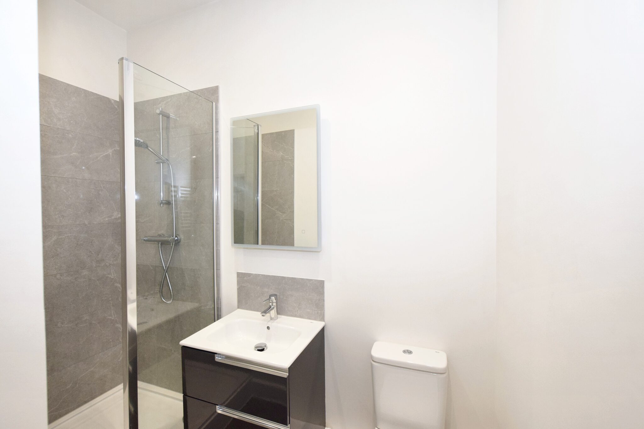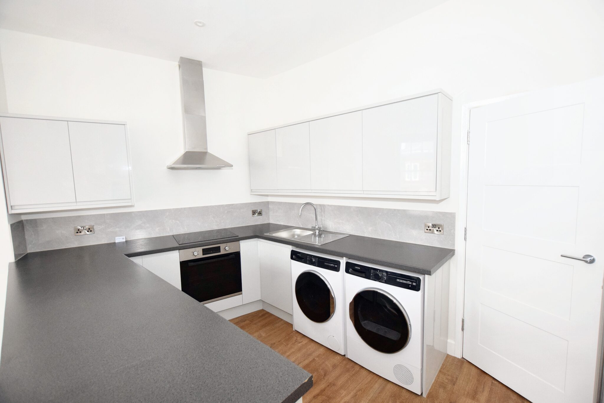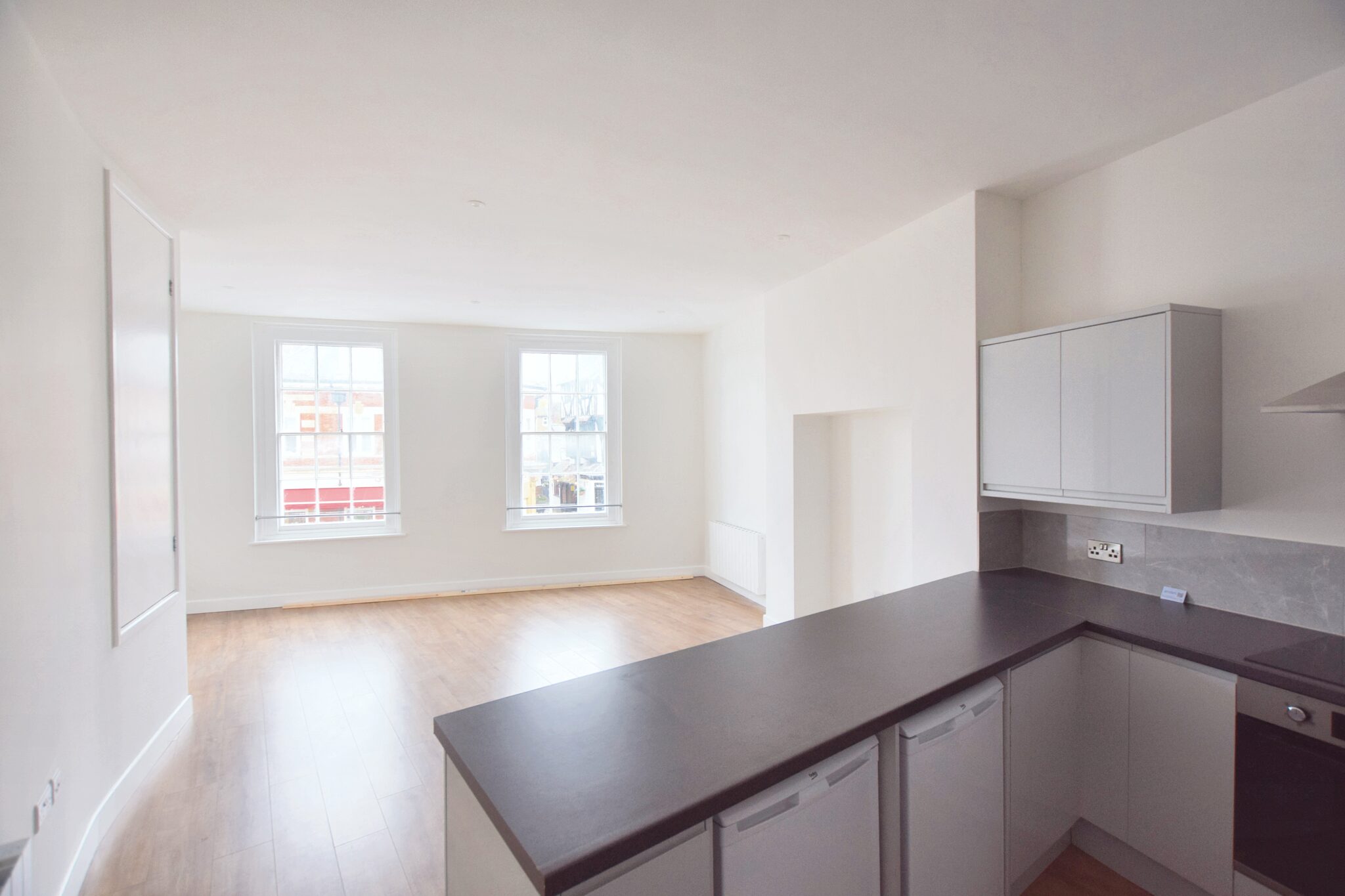 A first first floor apartment with high ceilings and flooded with light. The accommodation comprises: entrance hall leading to an open plan living / dining kitchen which comes supplied with fridge freezer, washing machine and tumble dryer along with a cooker, hob and extractor. The double bedroom has a fitted wardrobe and the shower room is fitted with a white suite. There is bike storage and street parking space at the rear of the building.