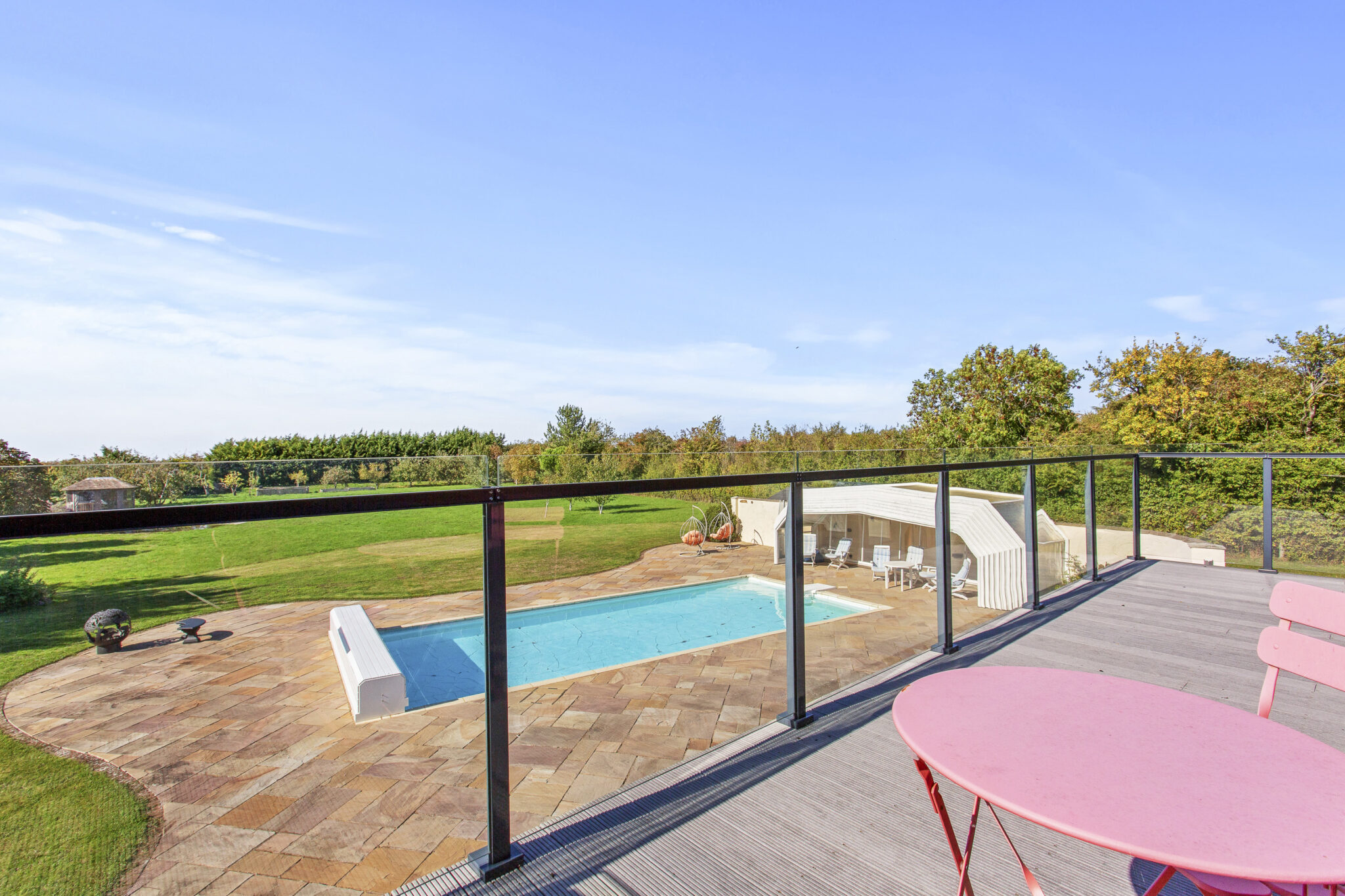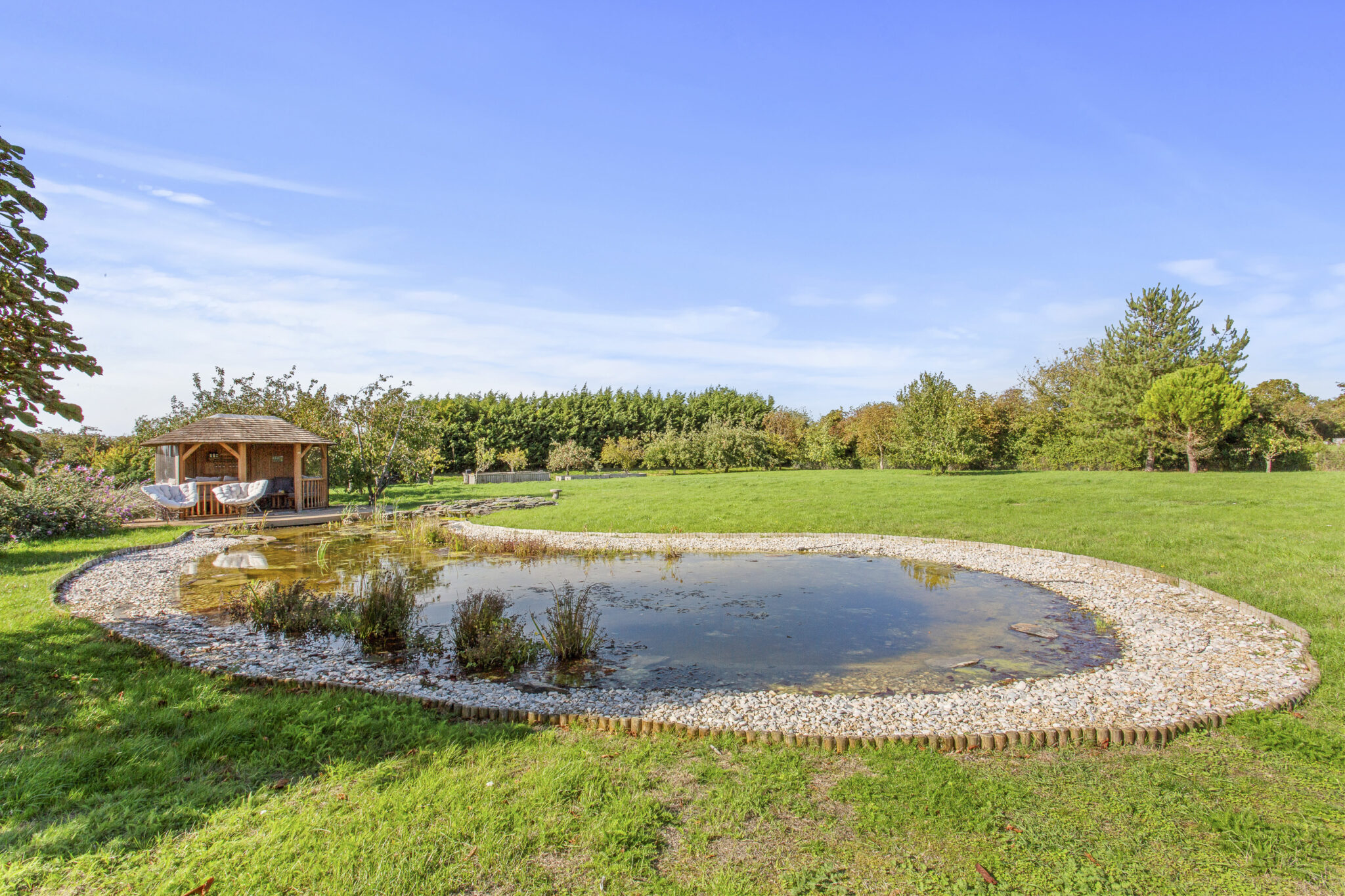 The property is approached via electric gates leading to a generous circular driveway provides ample parking for numerous cars; the driveway continues on round to the triple garage. Directly behind the house there is a large area of decking leading to an extensive paved terrace up to and around the pool, perfect for outdoor entertaining. The gardens enjoy a lovely south westerly aspect with a wide expanse of lawn interspersed with mature bushes, shrubs, trees and hedging on the boundaries, providing plenty of privacy. A feature of the large garden is the large pond and adjacent summerhouse, proving a lovely tranquil setting. There is also a greenhouse and vegetable plots.
