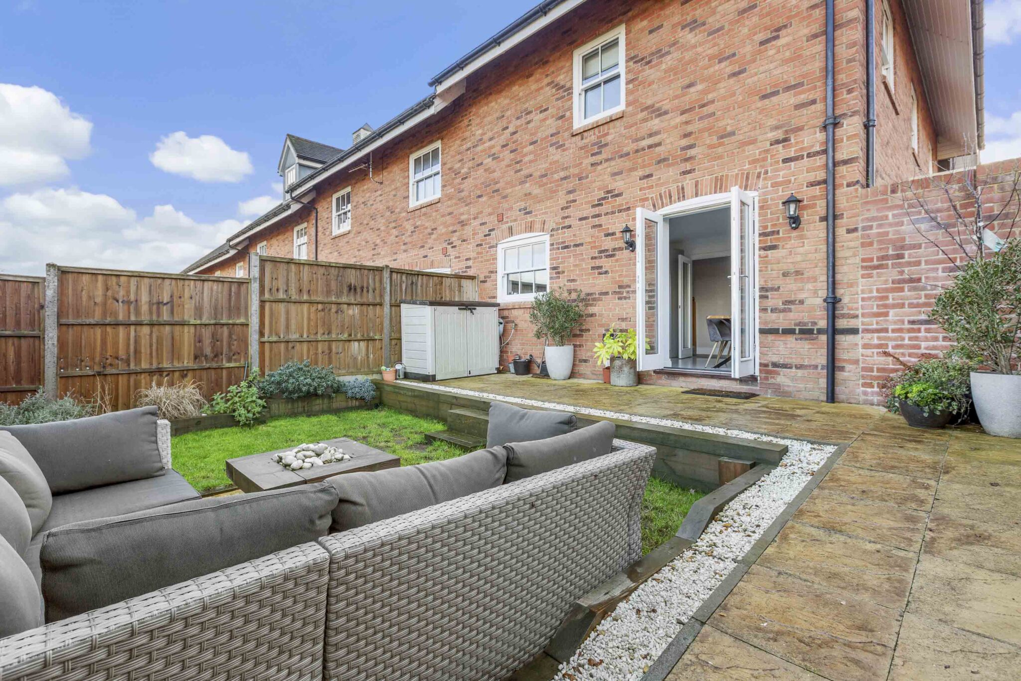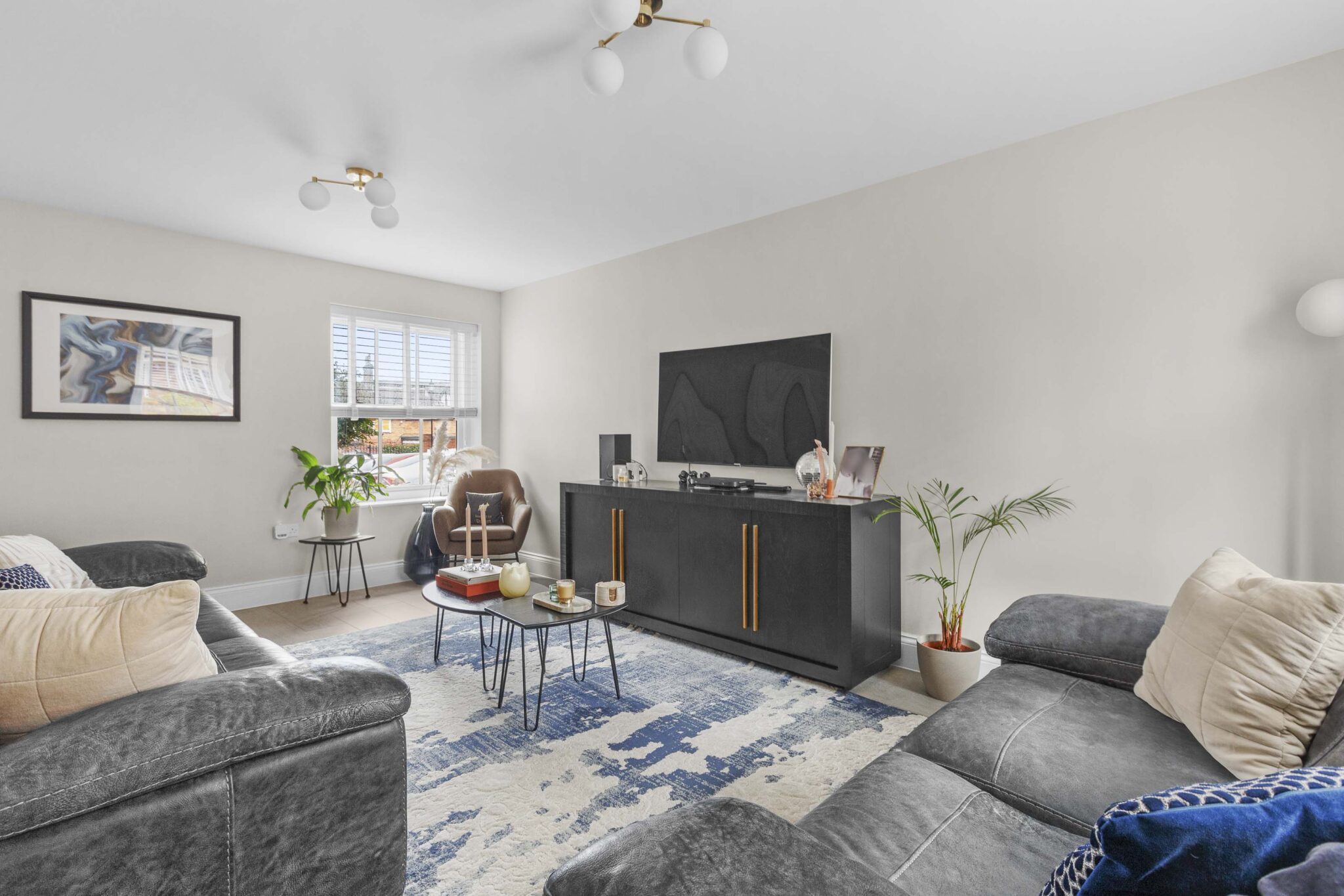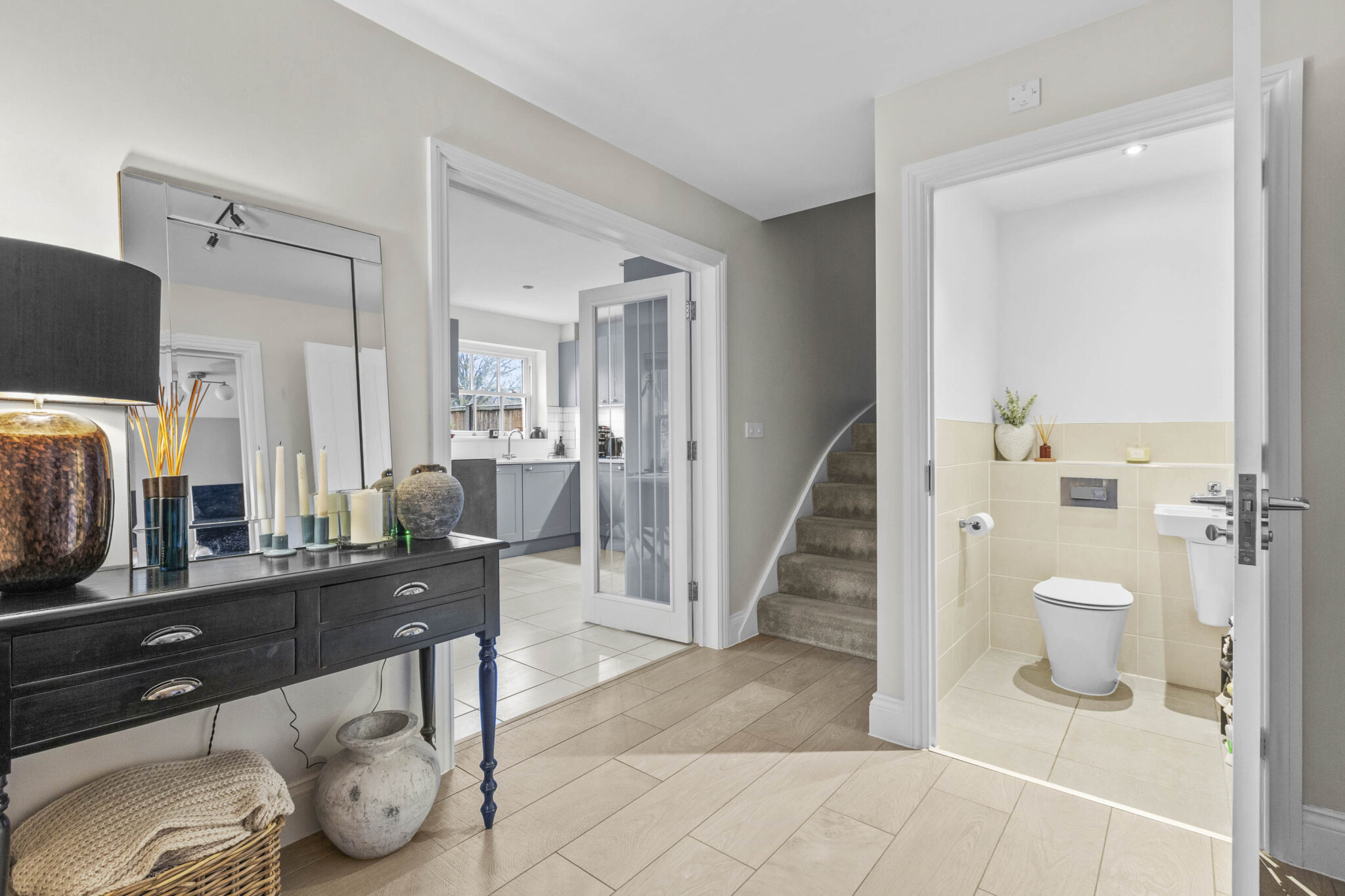The sitting room is generous in size and benefits from a double aspect, making it feel airy and inviting. There is a large storage cupboard to help keep things tidy, and the same beautiful flooring continues here. Upstairs, the principal bedroom is a real treat. It’s a luxury size, with space for fitted cupboards for plenty of storage and a generous ensuite for added privacy. The guest bedroom also has its own ensuite shower room, while the third double bedroom is served by a beautifully appointed family bathroom.