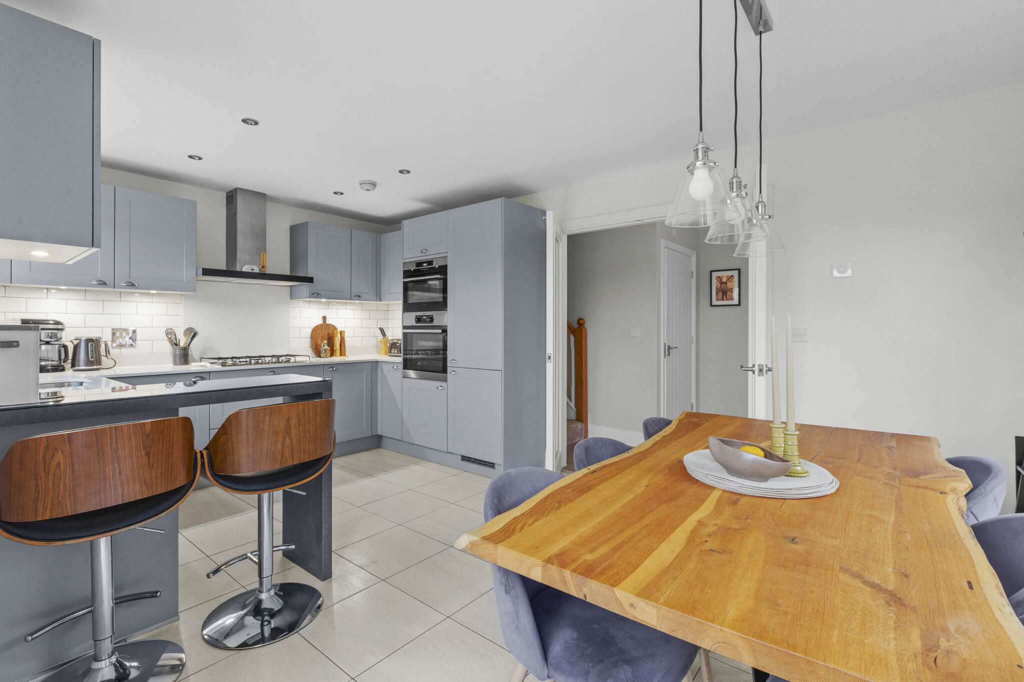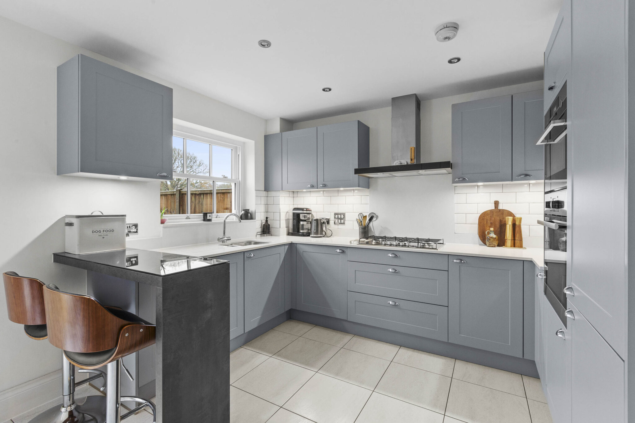 Step inside and you will find a spacious and welcoming entrance hall, featuring grey wood effect porcelain tiles from Porcelanosa that runs through much of the ground floor. There is a handy downstairs cloakroom, perfect for guests. The heart of this home is the bright and spacious 17x11ft shaker style kitchen, which flows seamlessly into the breakfast and dining area. This space is ideal for family meals or entertaining friends. The kitchen is well equipped and finished to a high standard, with patio doors that let in plenty of natural light.