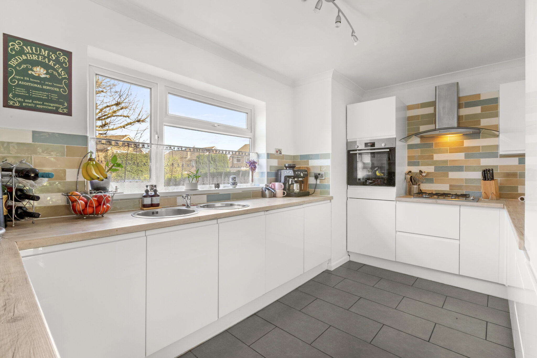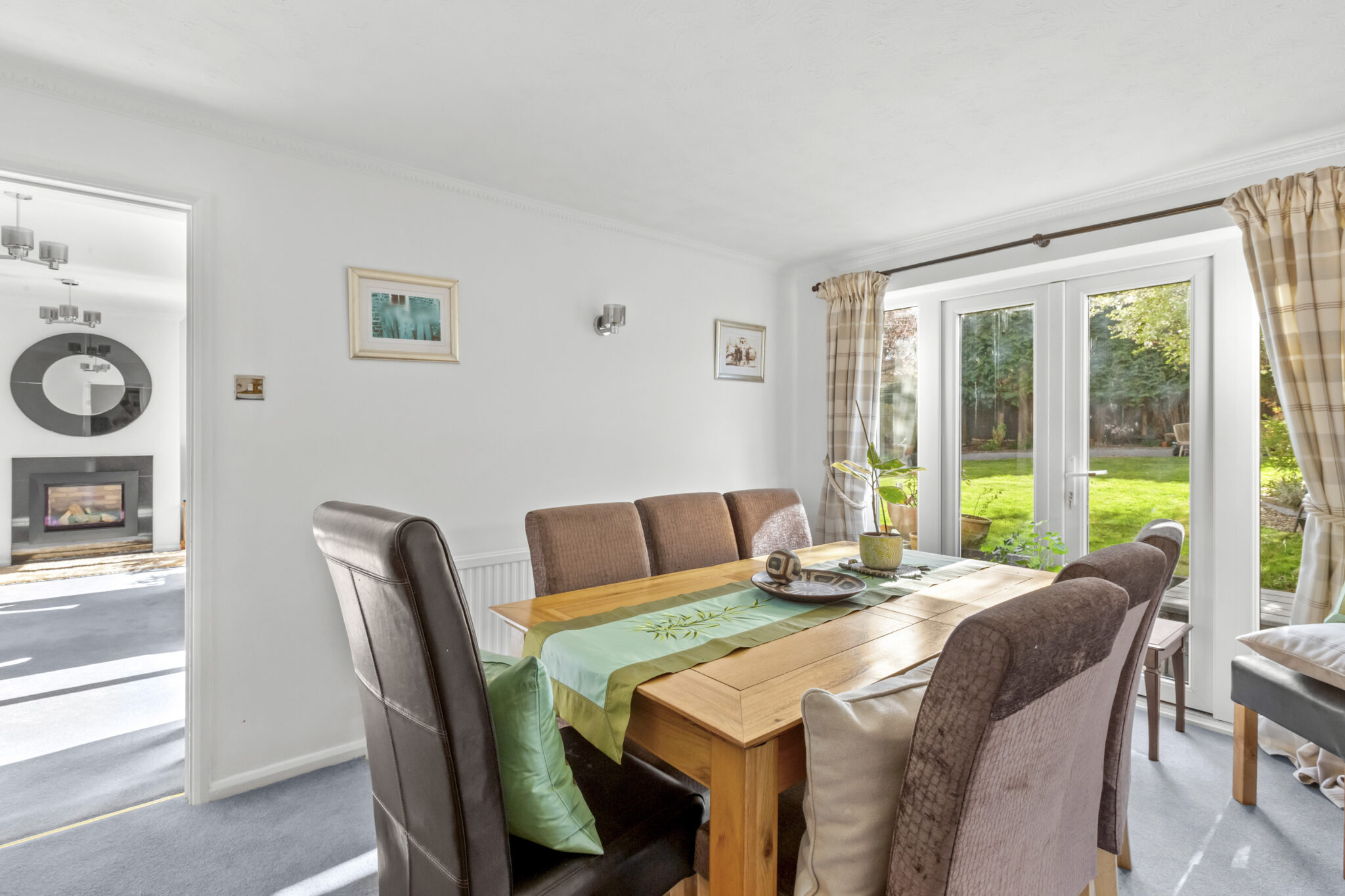 The property is entered via a welcoming entrance hall, which leads to a spacious sitting room featuring an attractive fireplace and sliding doors opening onto the paved terrace and rear garden. From the sitting room there is access to both the dining room and a well-appointed kitchen fitted with a range of base and wall units.