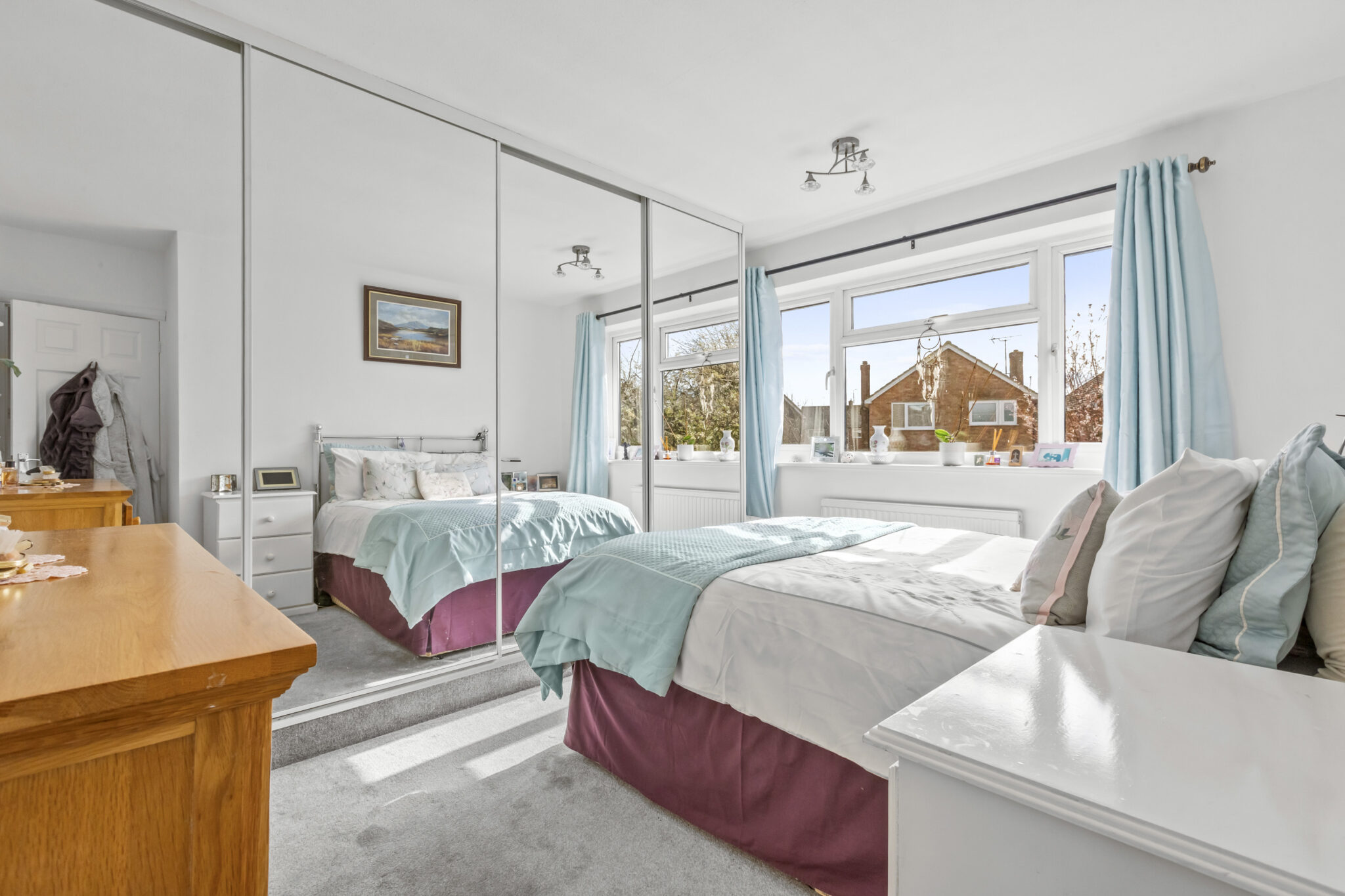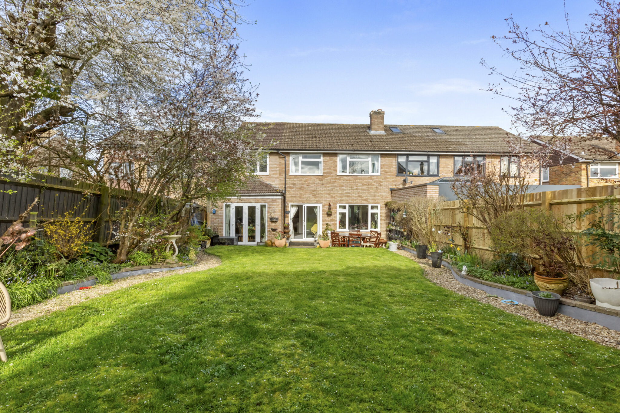 Outside, the property benefits from driveway parking for several motor vehicles. The front garden is attractively laid to lawn with well-stocked borders and a striking specimen tree. To the rear, the south-facing garden is a particularly appealing feature, offering a generous lawn, beautifully planted borders and a large paved terrace, perfect for outdoor dining and entertaining.