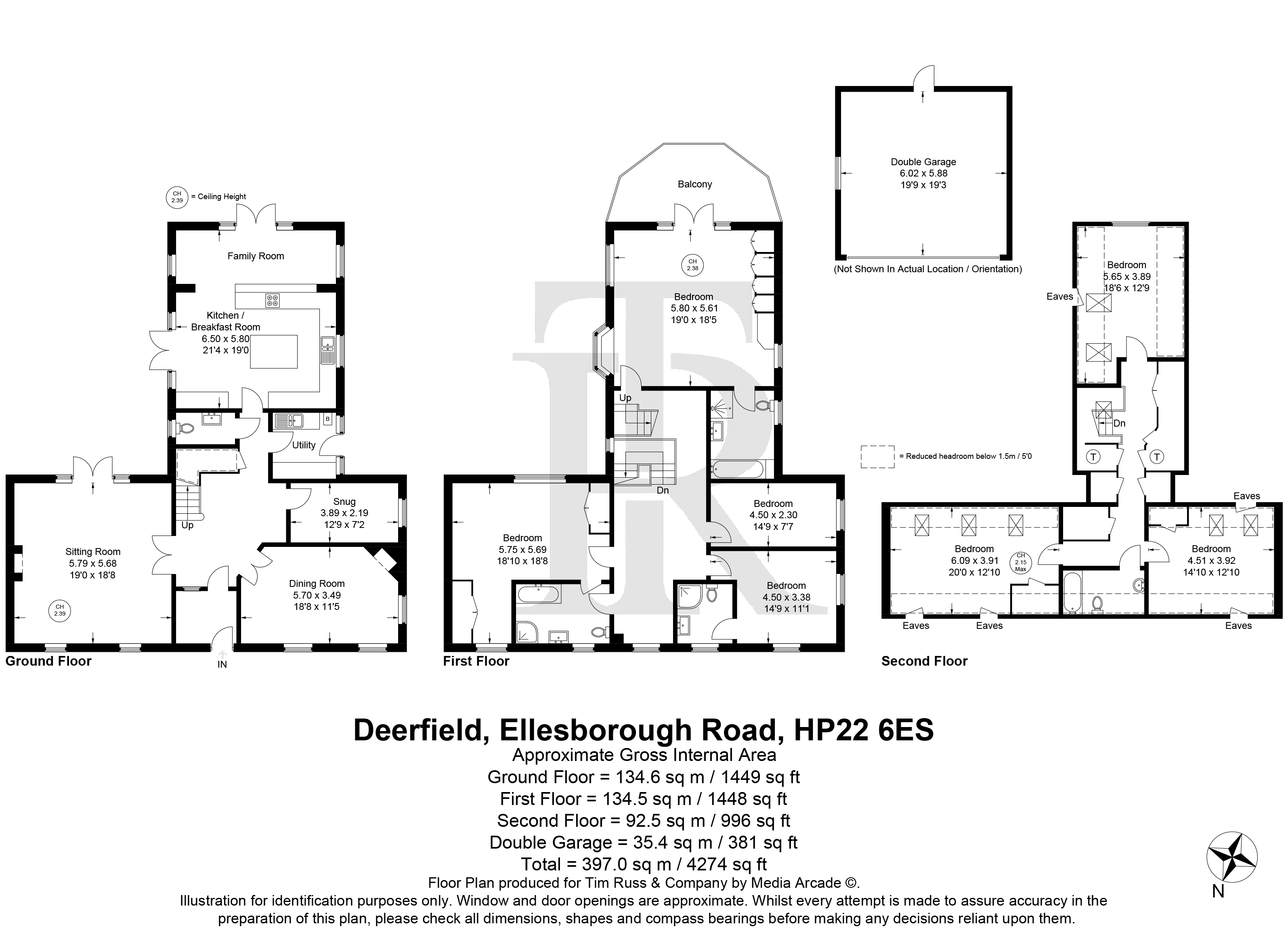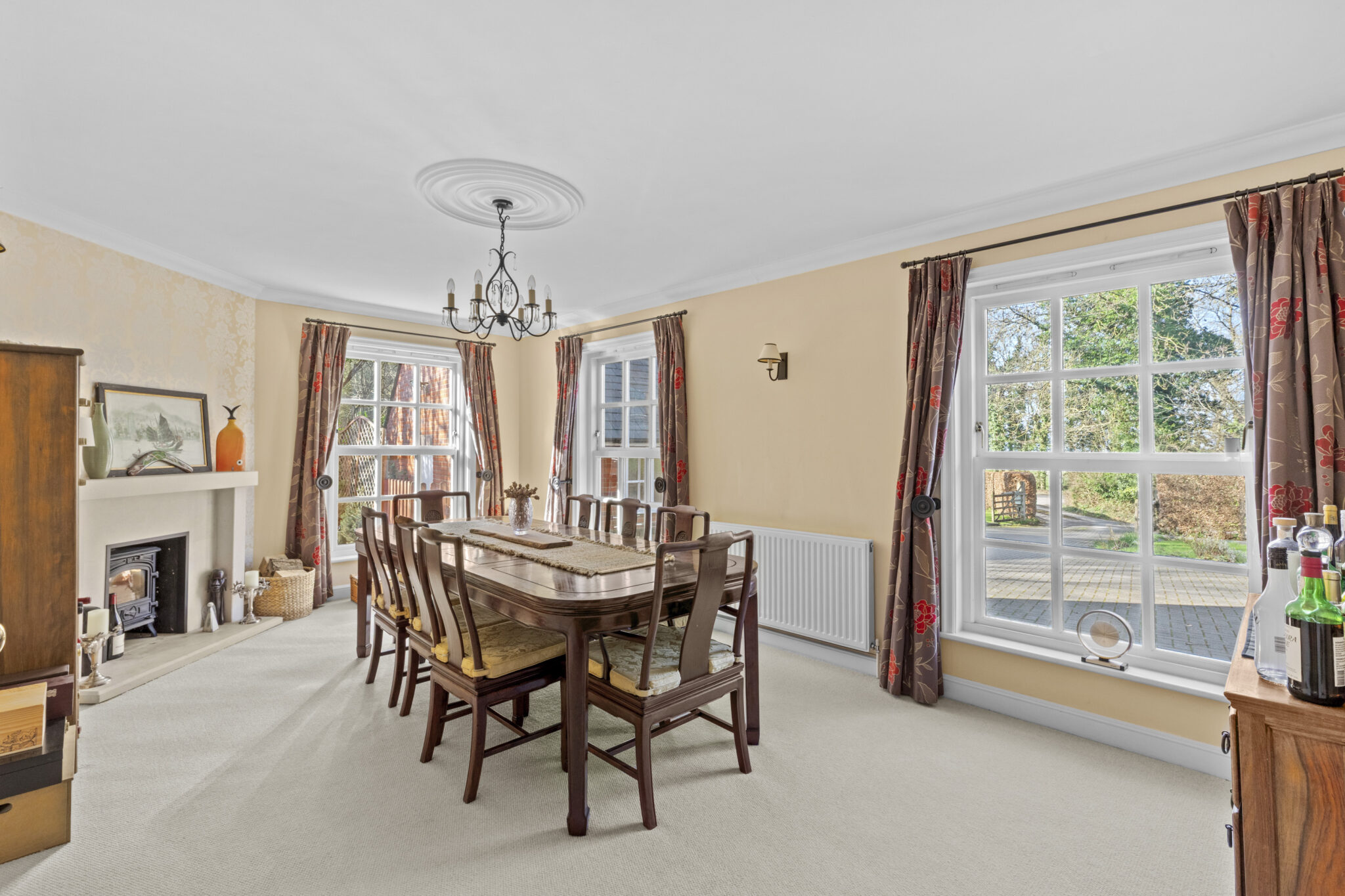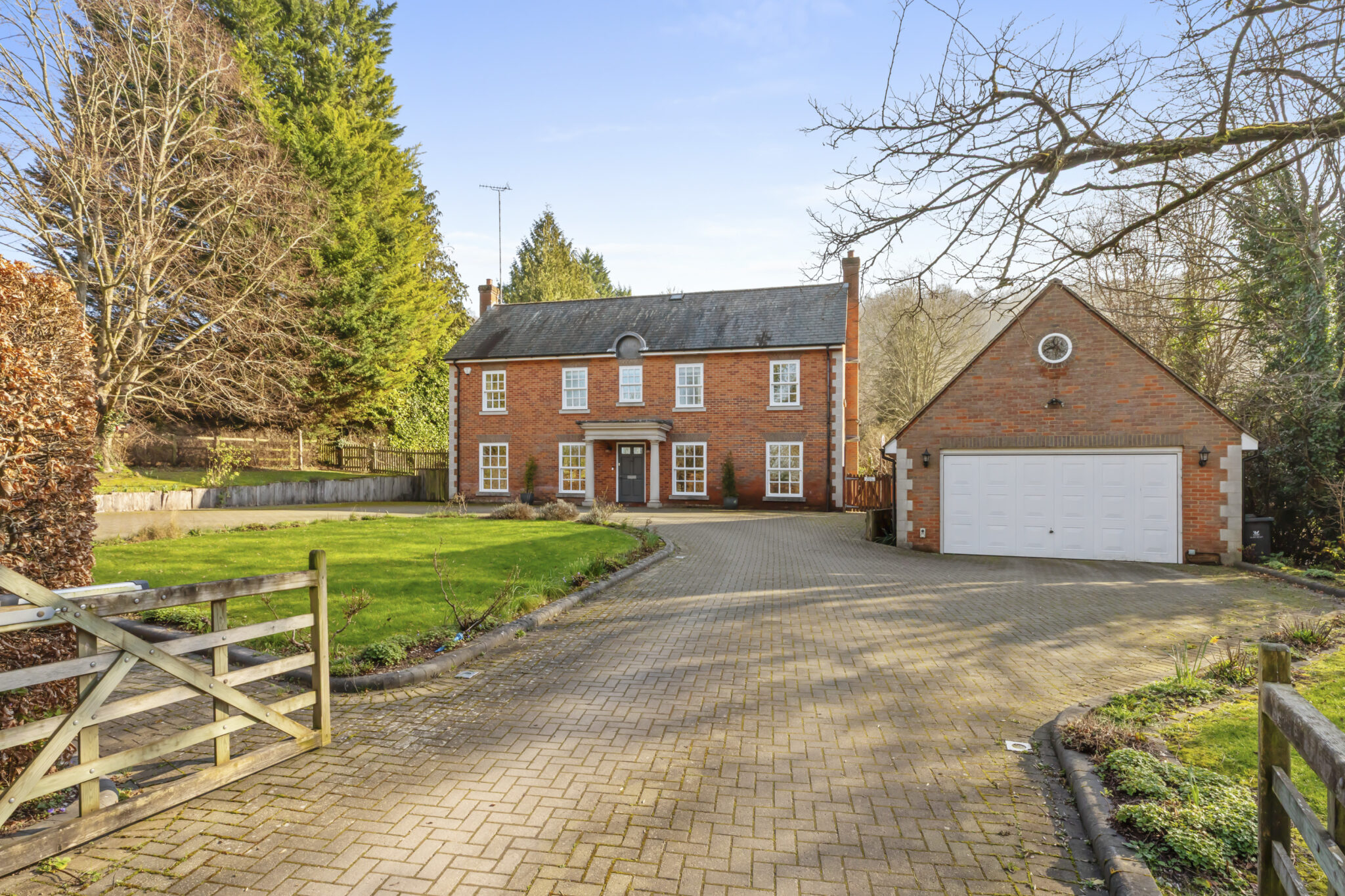 The property is approached via an ‘in and out’ sweeping block paved driveway around a central area of lawn, with comprehensive lighting and electric gates. There is a double garage with room for storage.