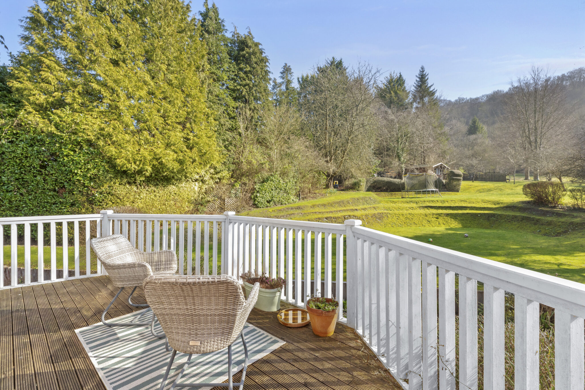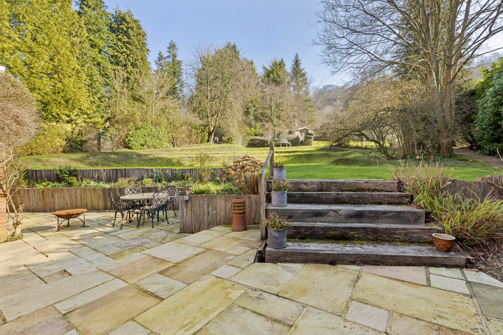 To the rear is a wraparound terrace, imaginatively landscaped with planters and steps up the to garden. The main body of the garden is laid predominantly to lawn with numerous trees, bushes and shrubs, along with garden sheds and a summerhouse. There is access to Coombe Hill which is one of the best walks in the area.
