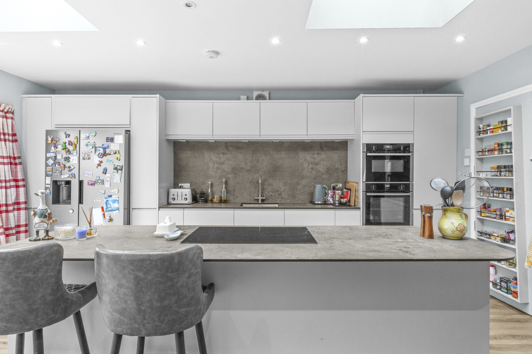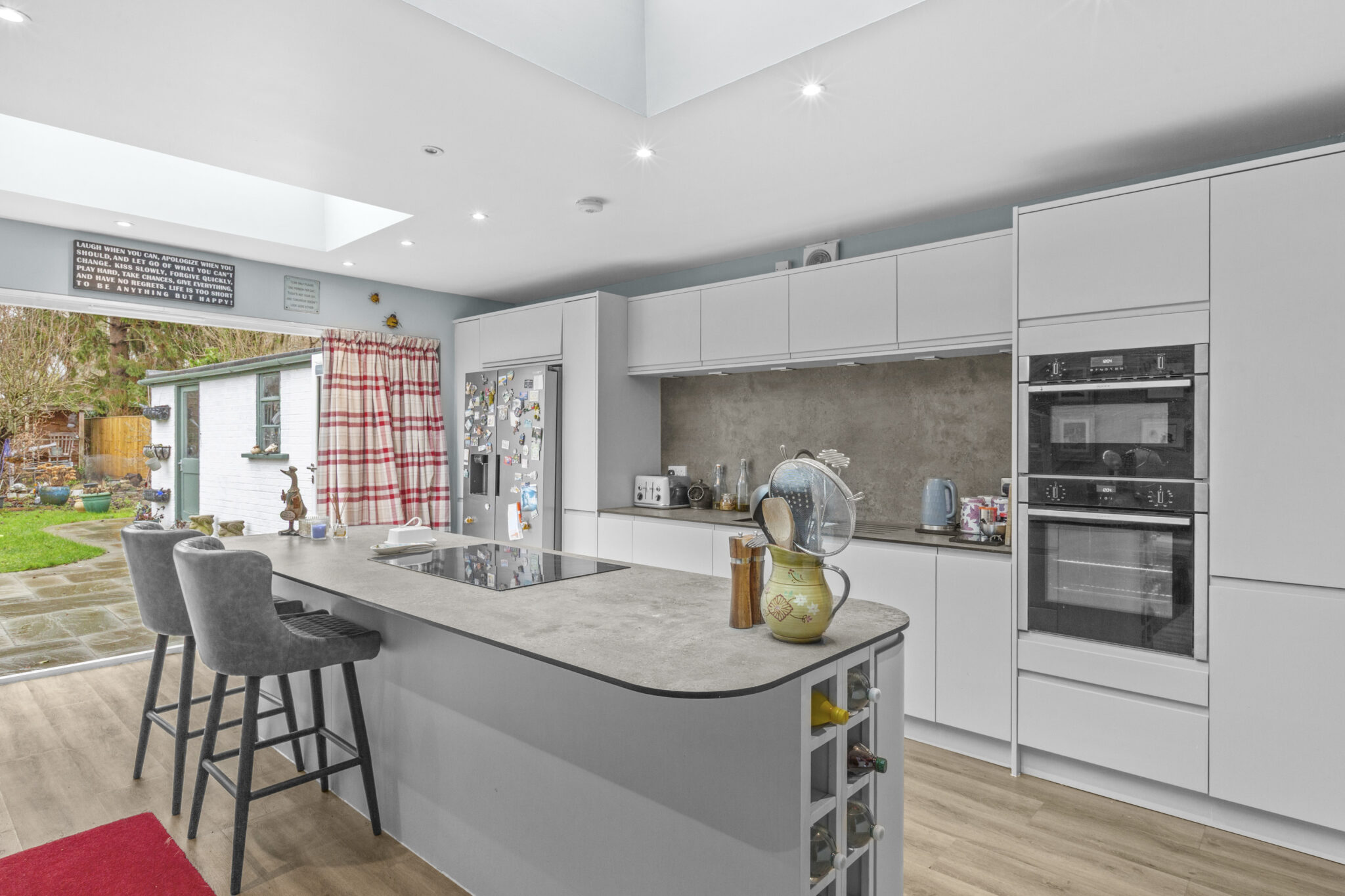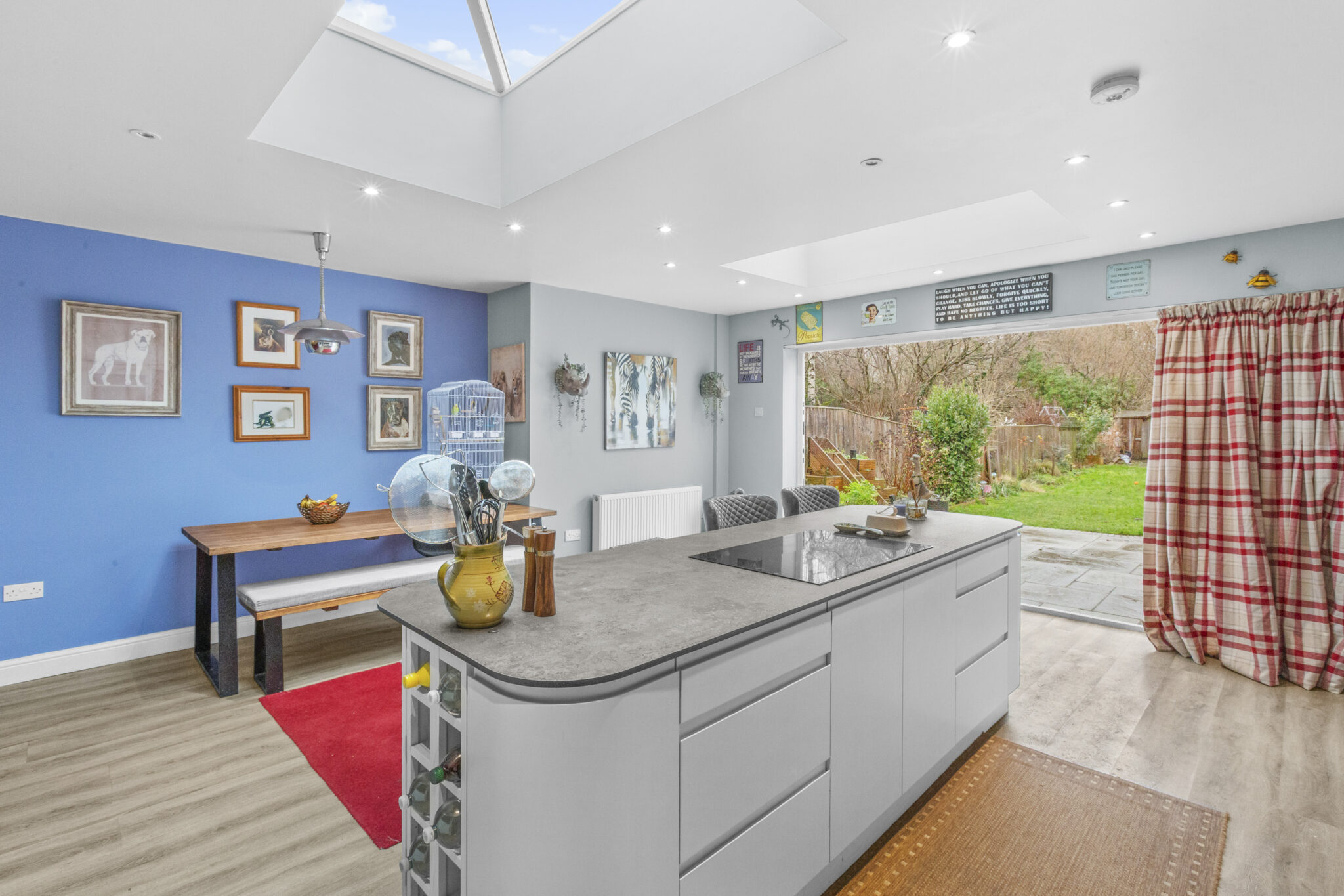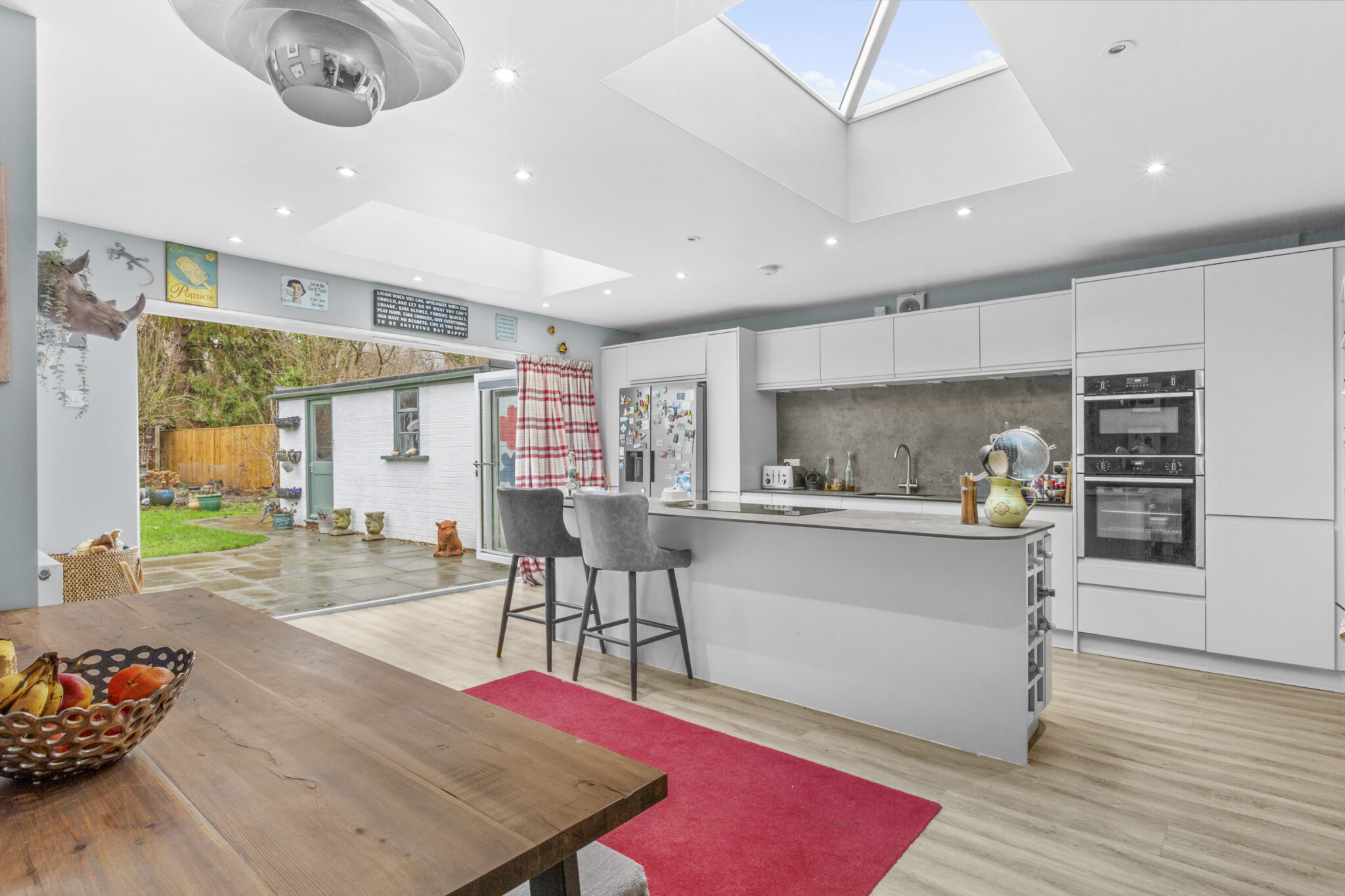 This beautifully presented three-bedroom semi-detached home offers spacious, contemporary living, perfect for families or anyone seeking a modern lifestyle. The ground floor features an impressive open-plan kitchen, dining, and living area, complete with sleek white cabinetry, integrated appliances, and a generous kitchen island with seating. Bi-fold doors, along with expansive skylights, flood the space with natural light and provide seamless access to the rear patio and extensive garden, creating a perfect blend of indoor and outdoor living. A convenient downstairs W/C adds everyday practicality, while two additional reception rooms offer flexible space for relaxation, entertaining, or working from home, each enhanced by large windows, built-in shelving, elegant wood flooring, and a cosy fireplace.