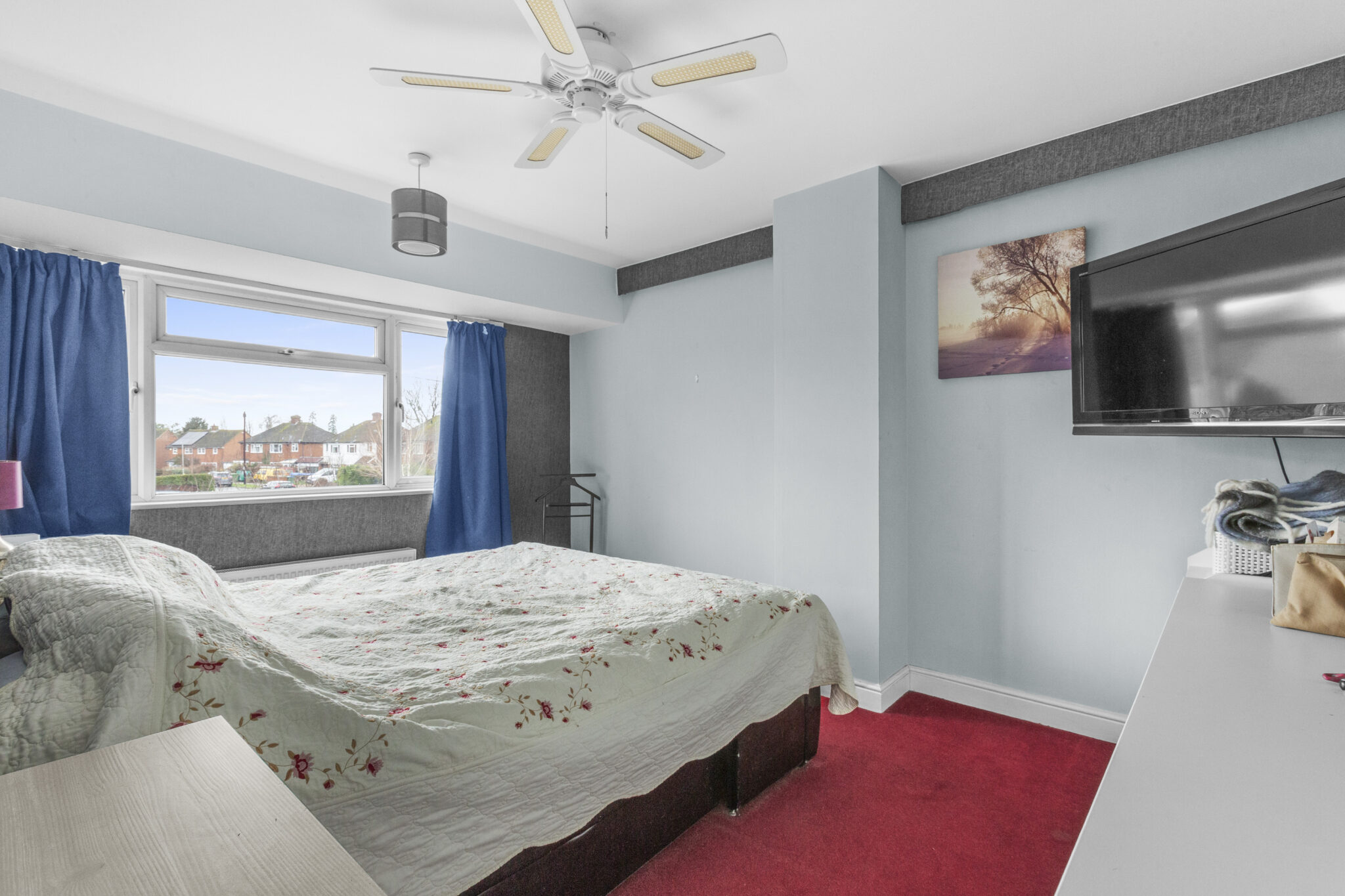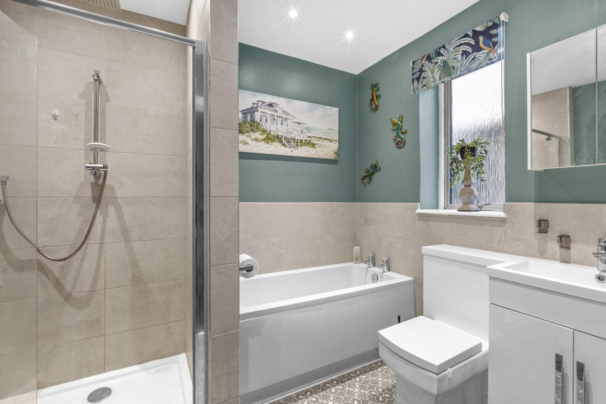 Upstairs, three well-appointed bedrooms provide comfortable accommodation, each with ample natural light, scenic views, built-in storage, and ceiling fans for added comfort. The modern family bathroom is finished with stylish tiling, a walk-in shower, and a separate sleek bathtub, offering a fresh and inviting retreat. The property’s kerb appeal is enhanced by a charming front garden enclosed by a picket fence, a contemporary entrance door, and a well-maintained brick and white-rendered facade.