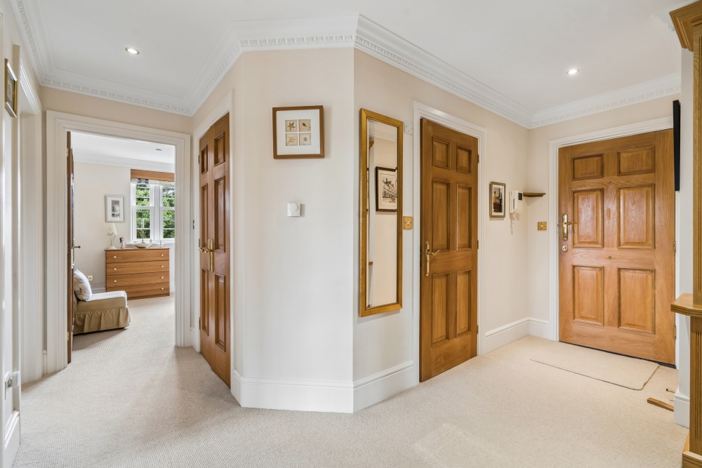 The property is approached via a long driveway with access to the garage block, with the garage being the middle of the five garages situated on the right-hand side. The well maintained communal hallway features an elegant staircase leading to the first floor as well as the benefit of a lift. An entrance porch with coats cupboard lead to a spacious entrance hall with attractive Oak unit plus airing cupboard and access to all rooms, a light and airy living room with feature fireplace, access to a dining area and double doors to a south-west facing balcony.