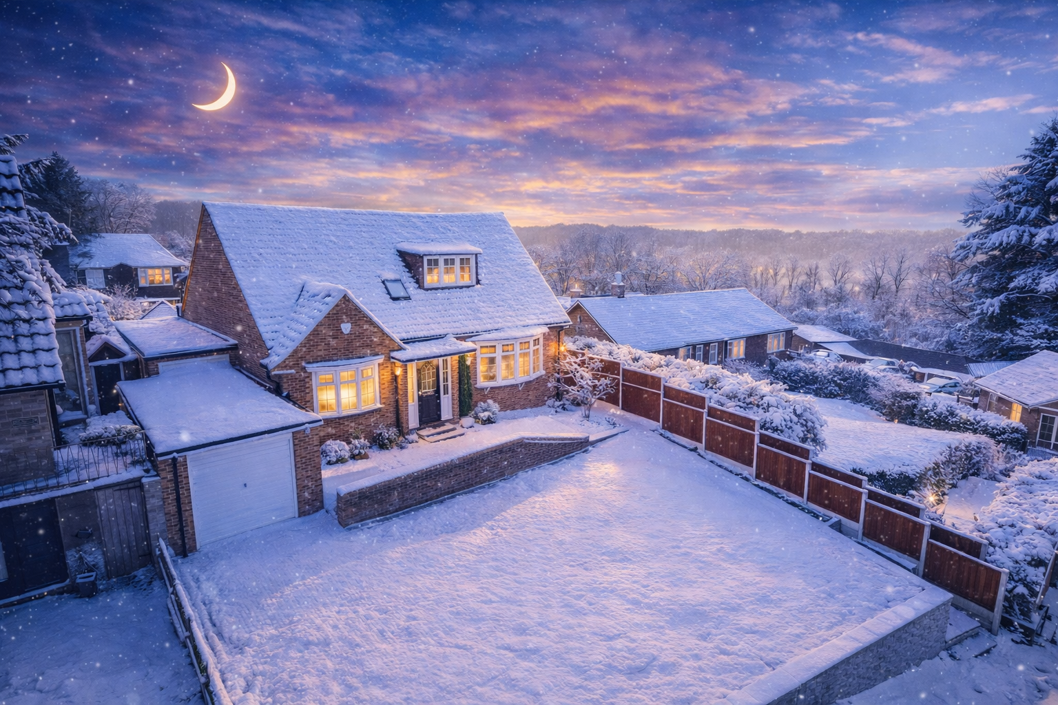 DISCLAIMER - Please note: The winter wonderland image shown has been digitally enhanced using AI to create a festive representation of the property. This image is for illustrative purposes only and does not reflect the actual current appearance of the property.
