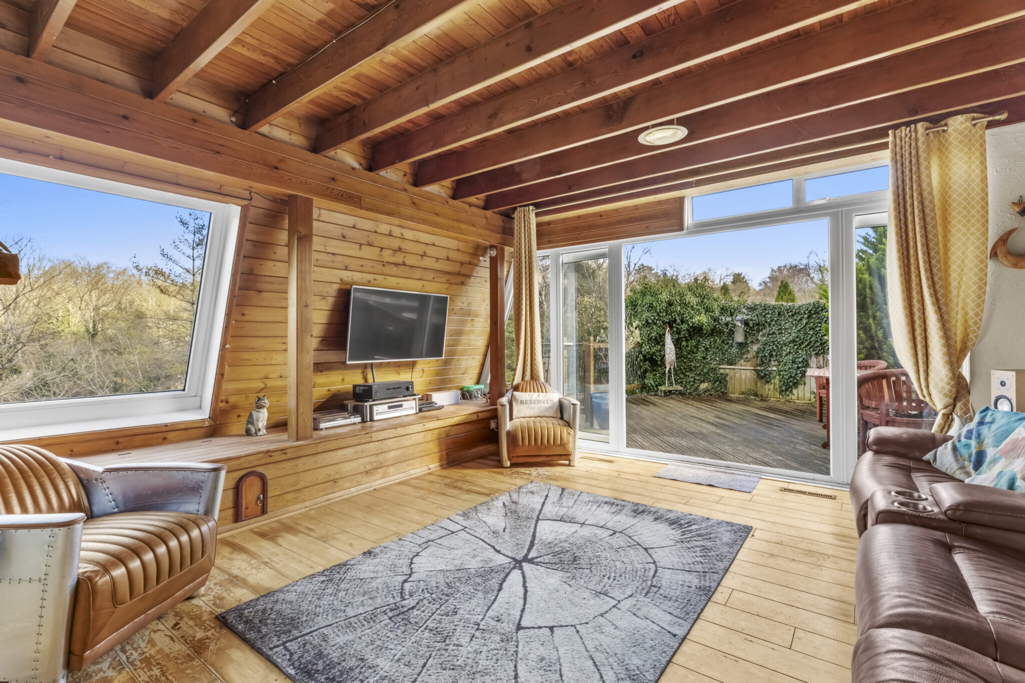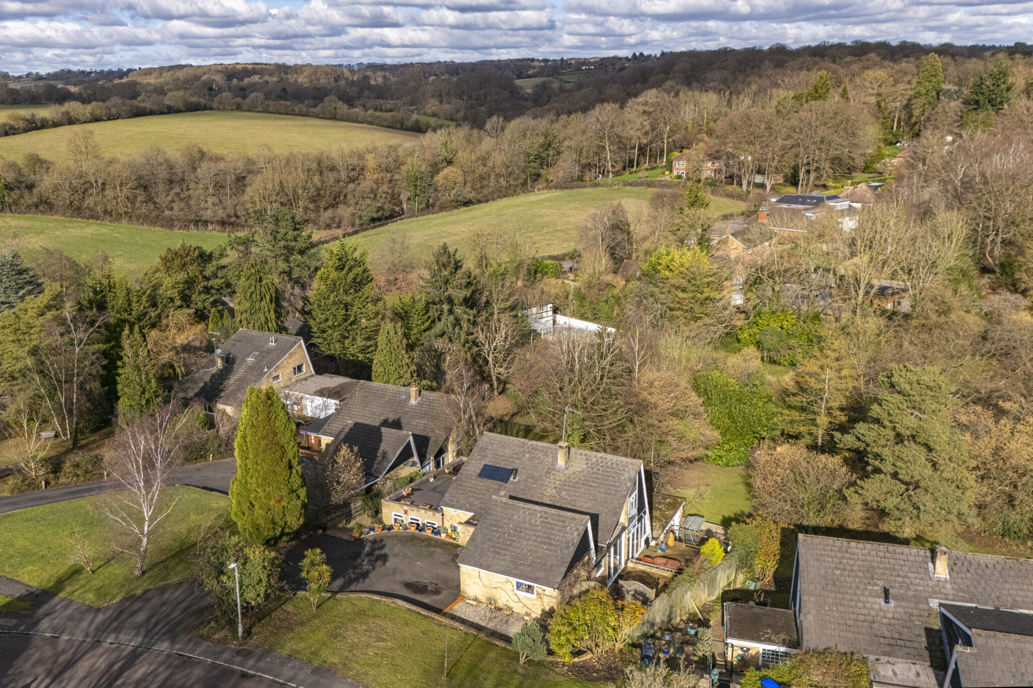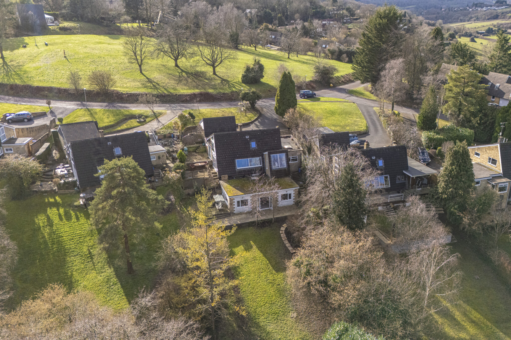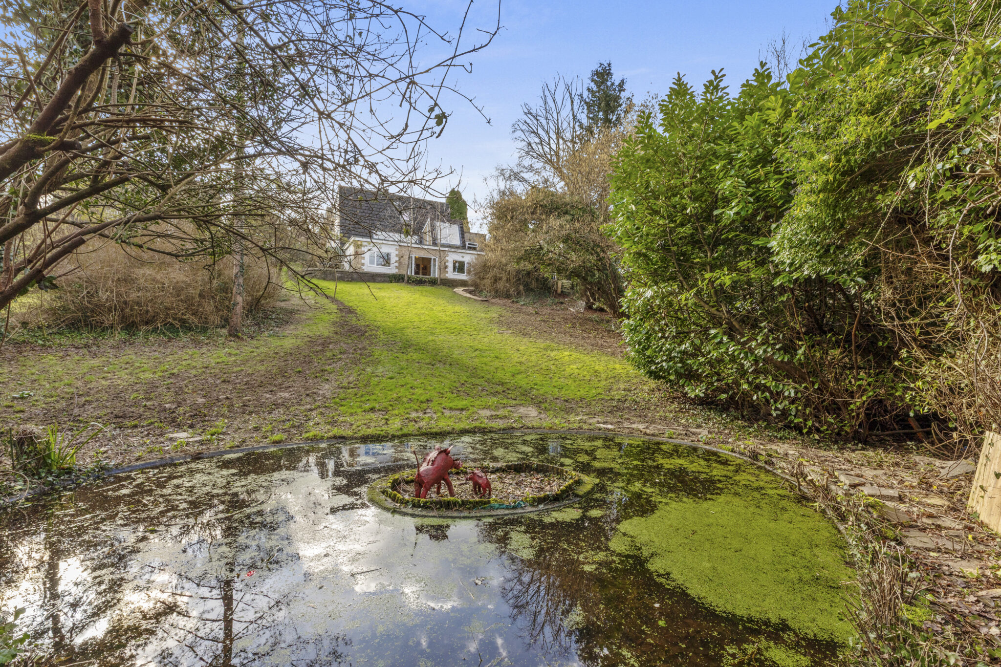 The property is approached via a long driveway leading to a double garage. The southerly side of the house is a patio area which leads down to a further raised patio overlooking the garden. The garden is very natural in its design, with an extensive area of lawn and established trees creating a woodland dell with feature pond at the bottom. The gardens in Hampden Hill are very much open plan with the neighbours, so all can enjoy the vistas across the Conservation Area.