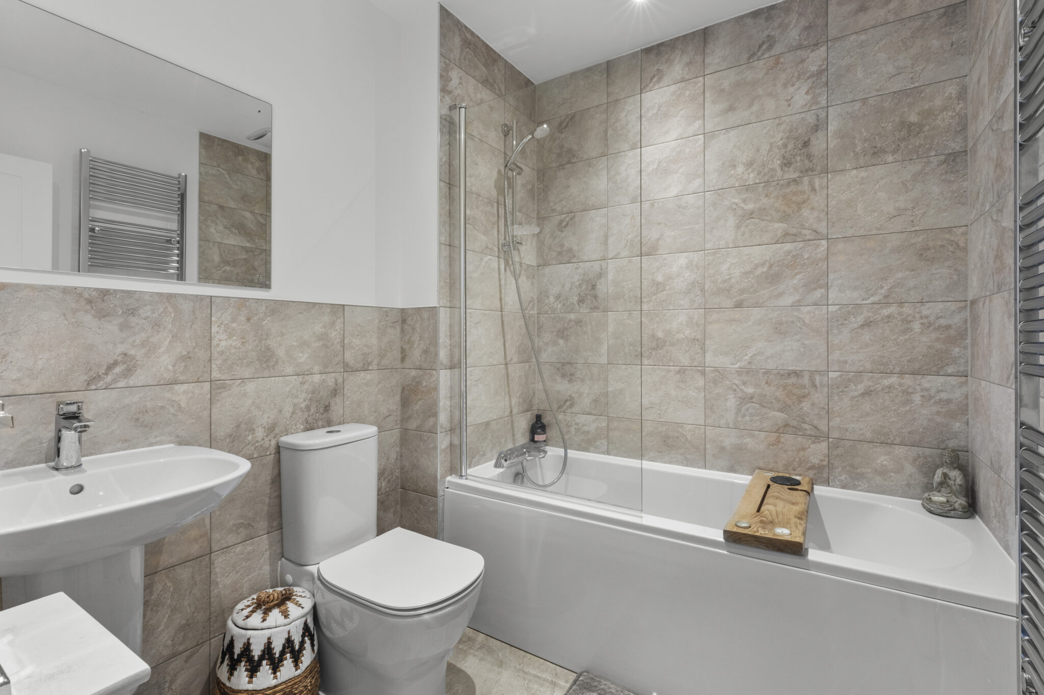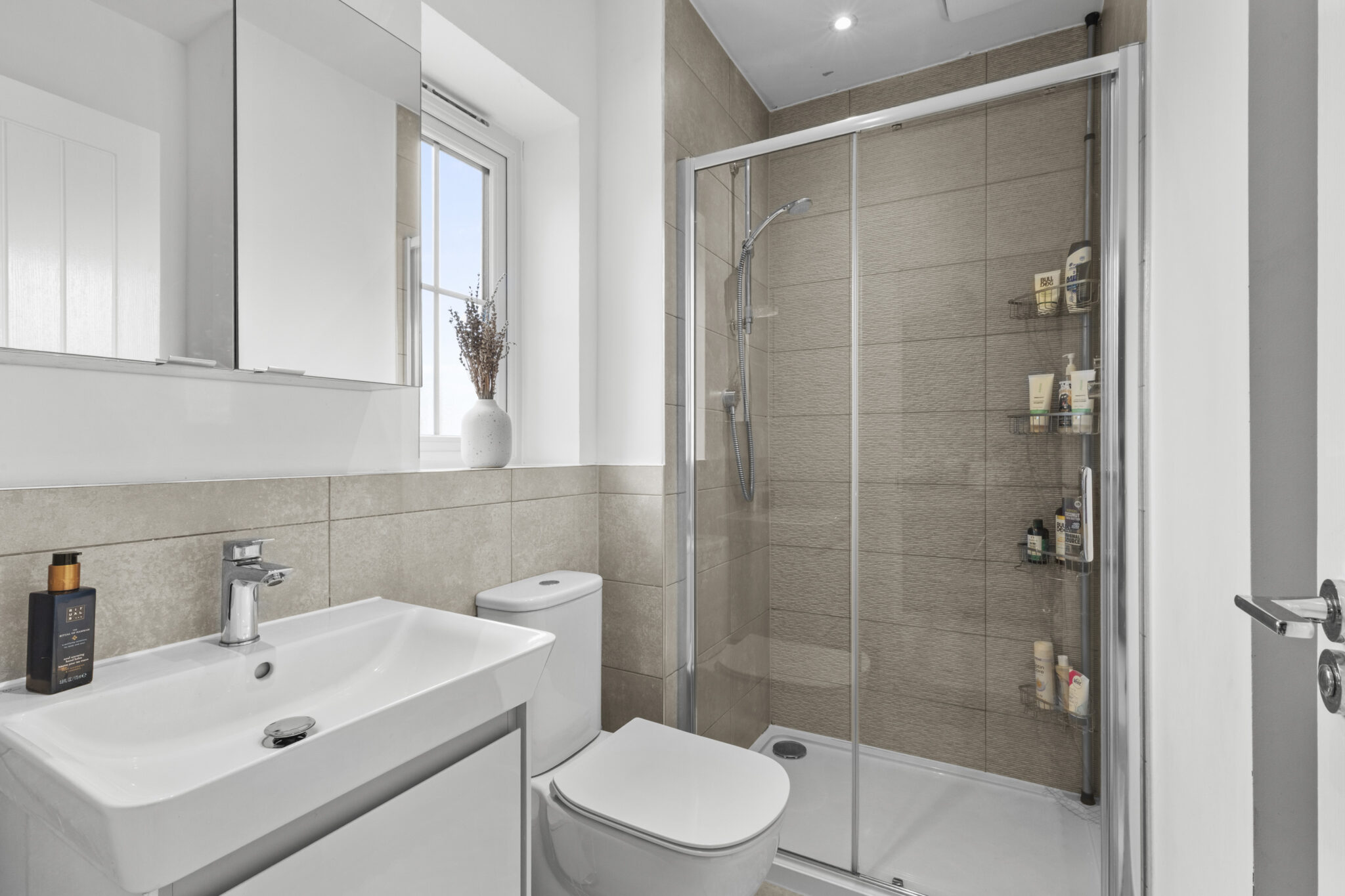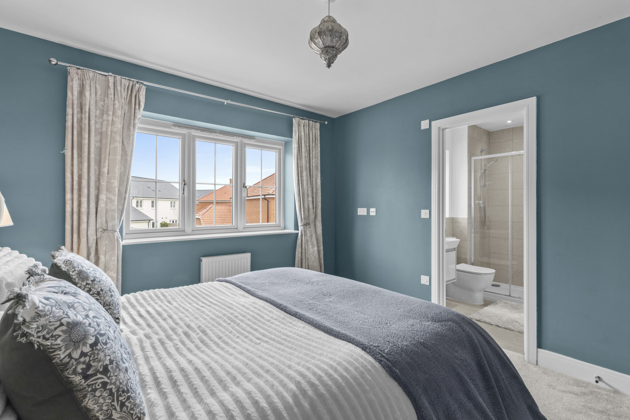 Upstairs, the principal bedroom benefits from its own ensuite shower room, creating a private space to unwind. Two further bedrooms are served by a contemporary family bathroom, making the property well suited to families or guests.