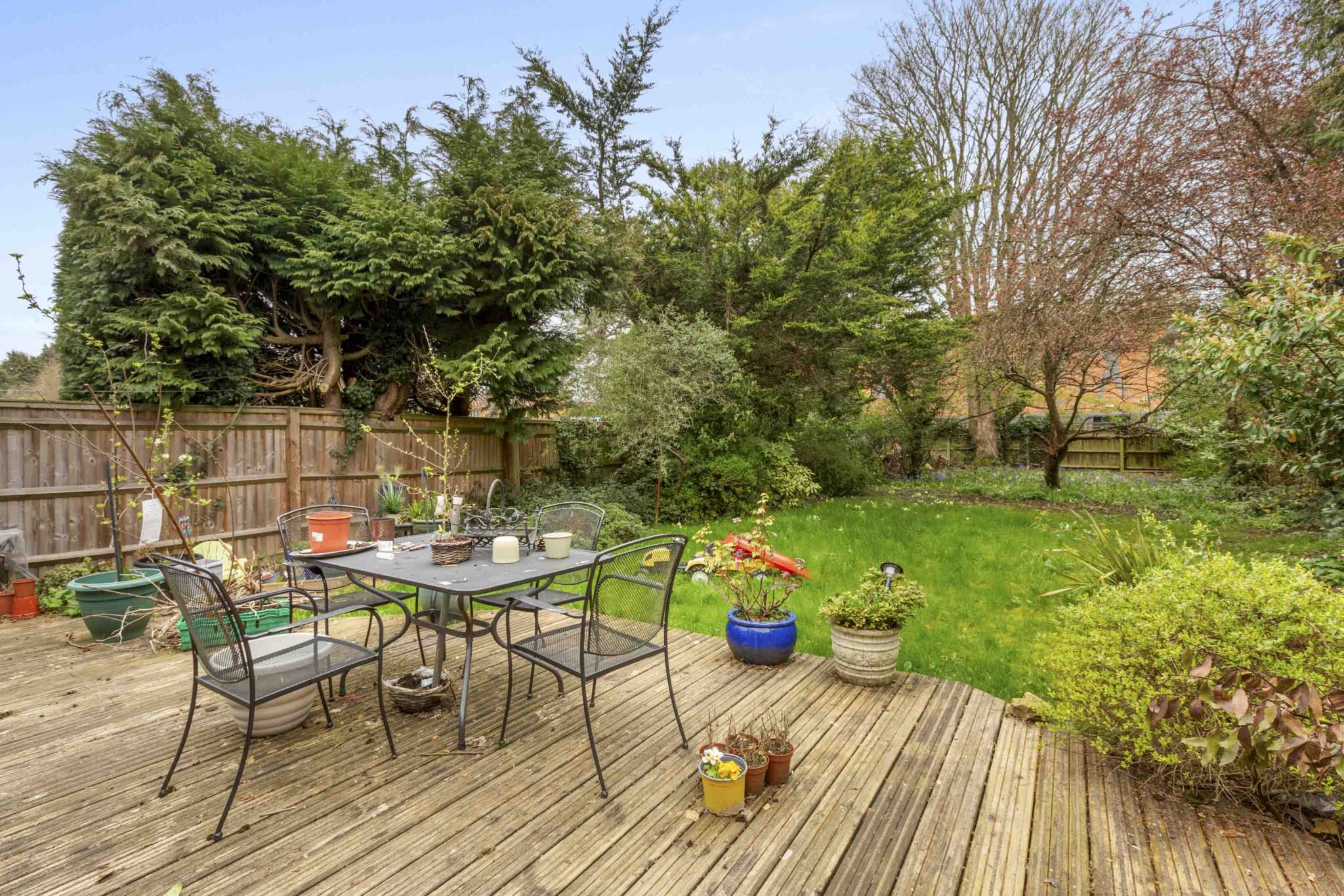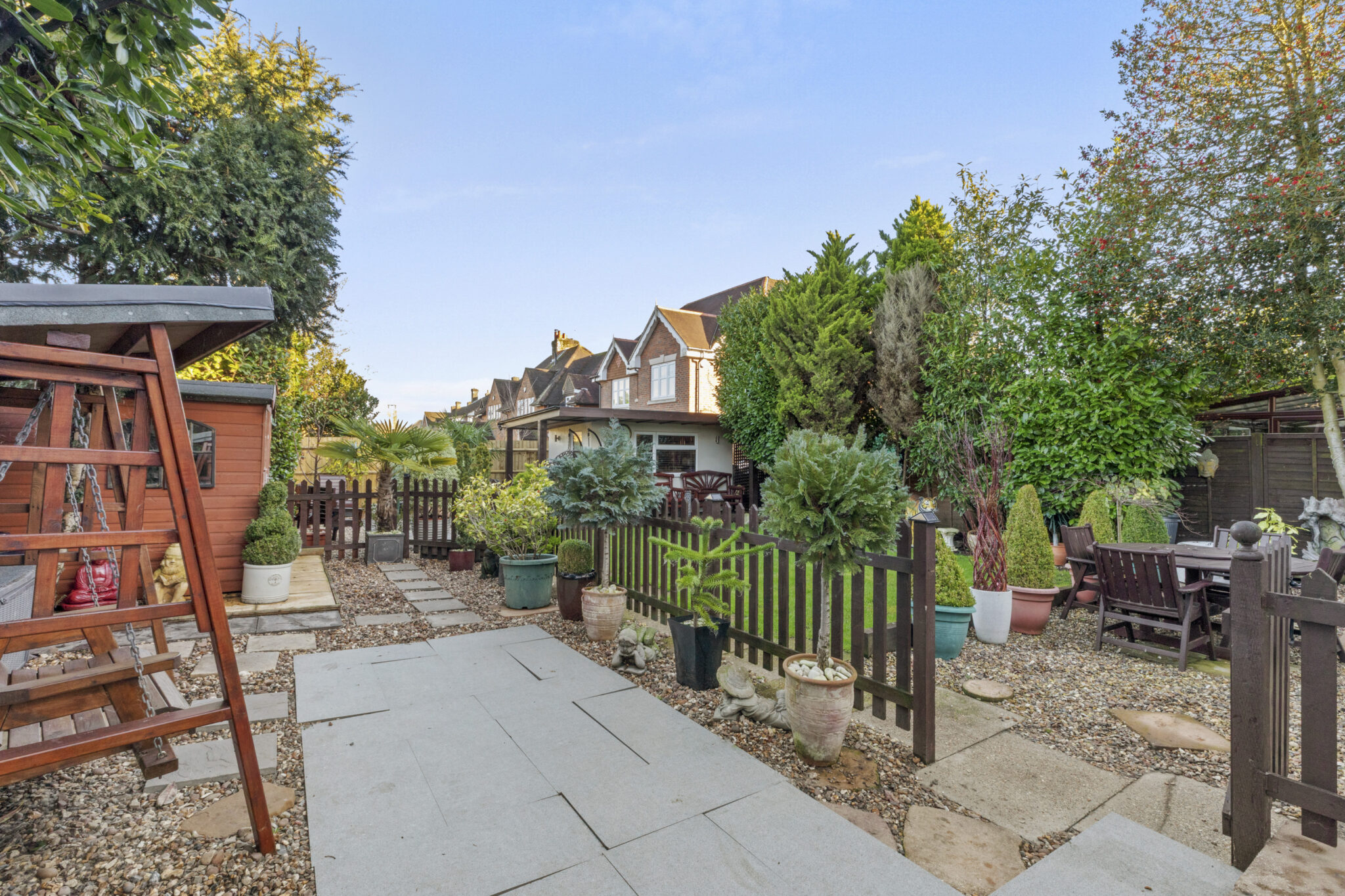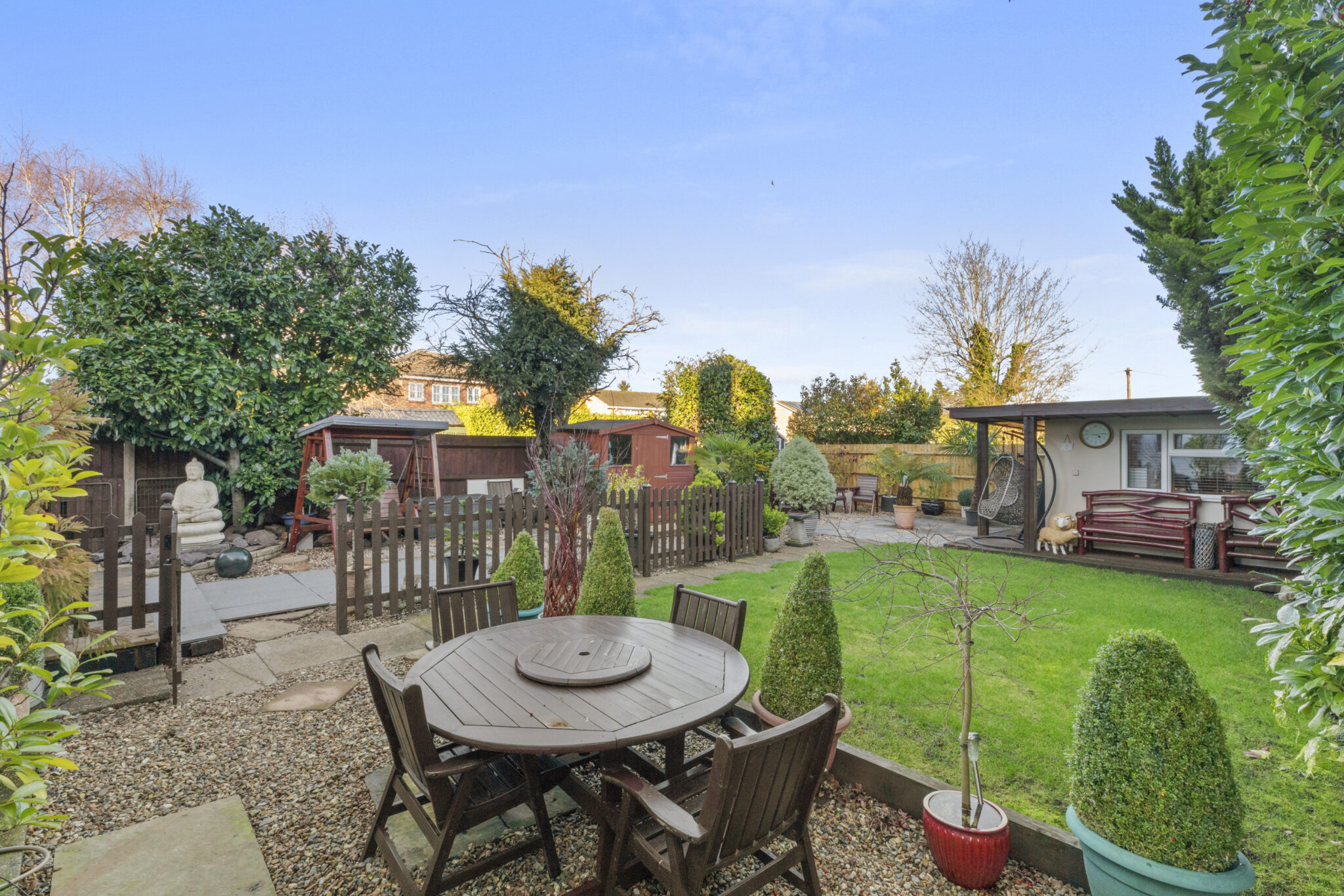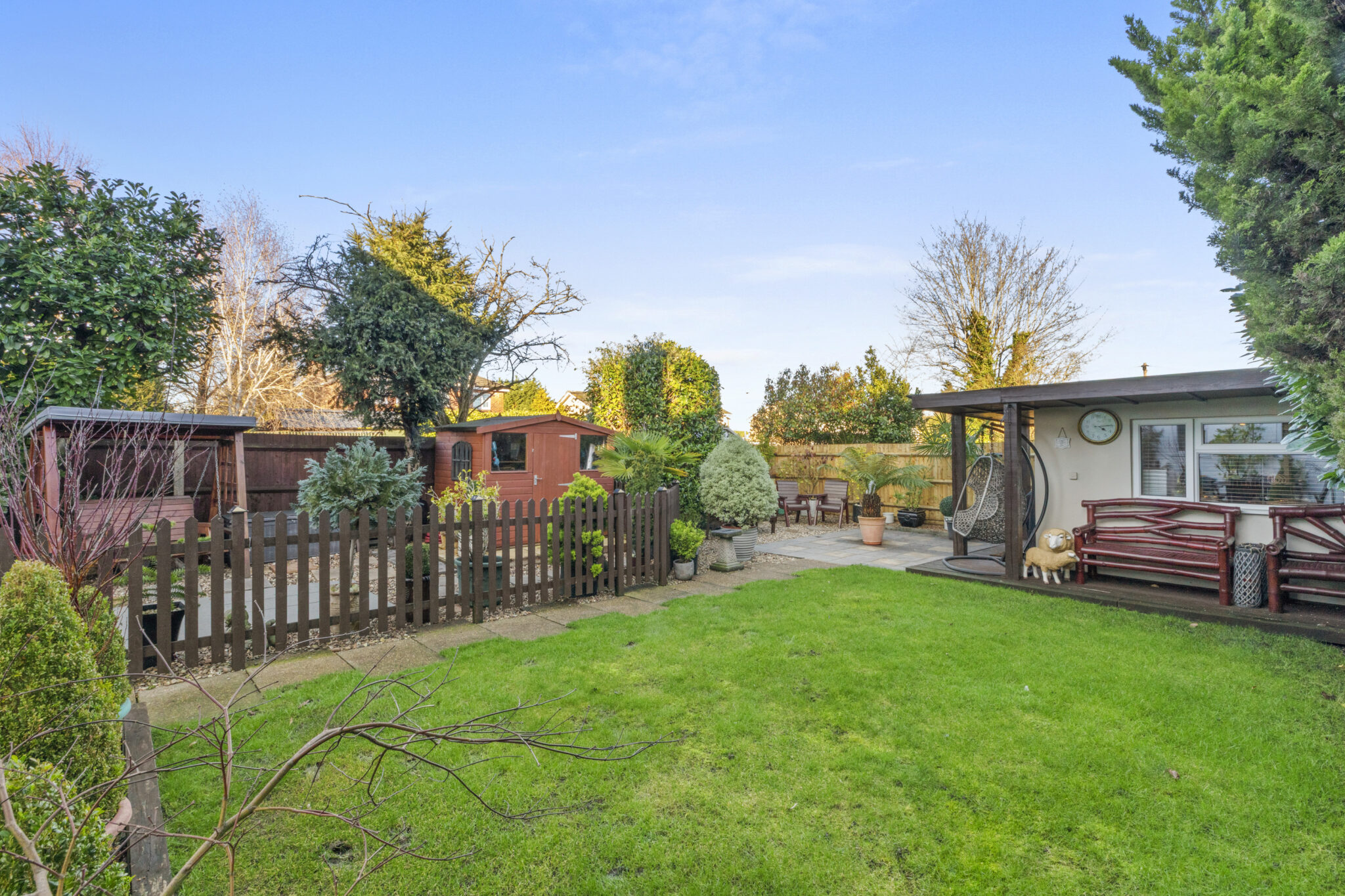 Gated side access leads from both sides of the property to a delightful level rear garden again with shingle terrace and immaculate lawn with mature screening. There is a picket fence dividing from a further shingle area and a good-sized rear patio adjacent to the summerhouse/studio (light and power) with veranda style seating area with lighting and timber deck.