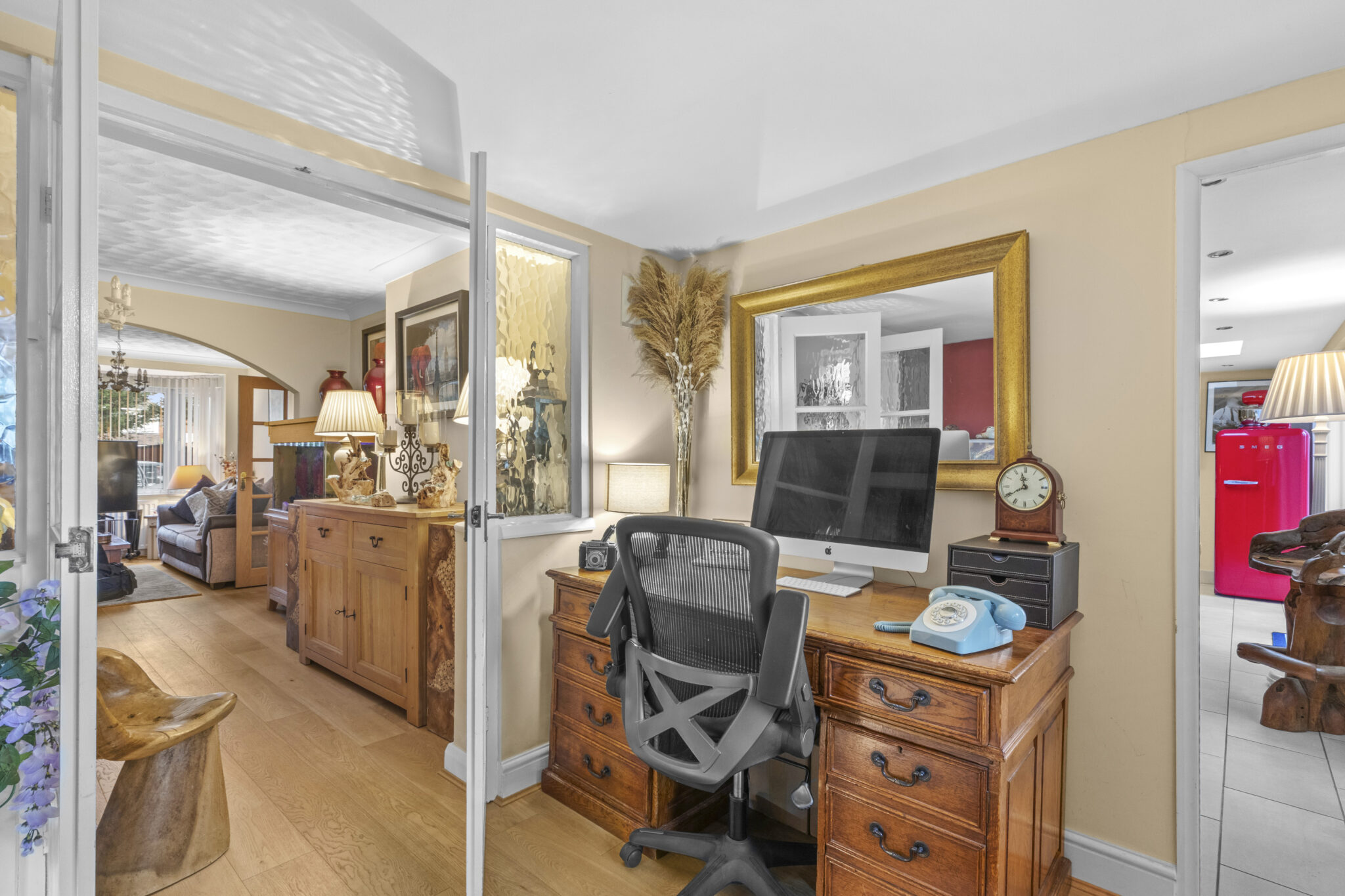 A particularly well presented older-style detached family house enjoying an attractive secluded plot behind electric gates with immaculate level gardens and useful summer house/studio.