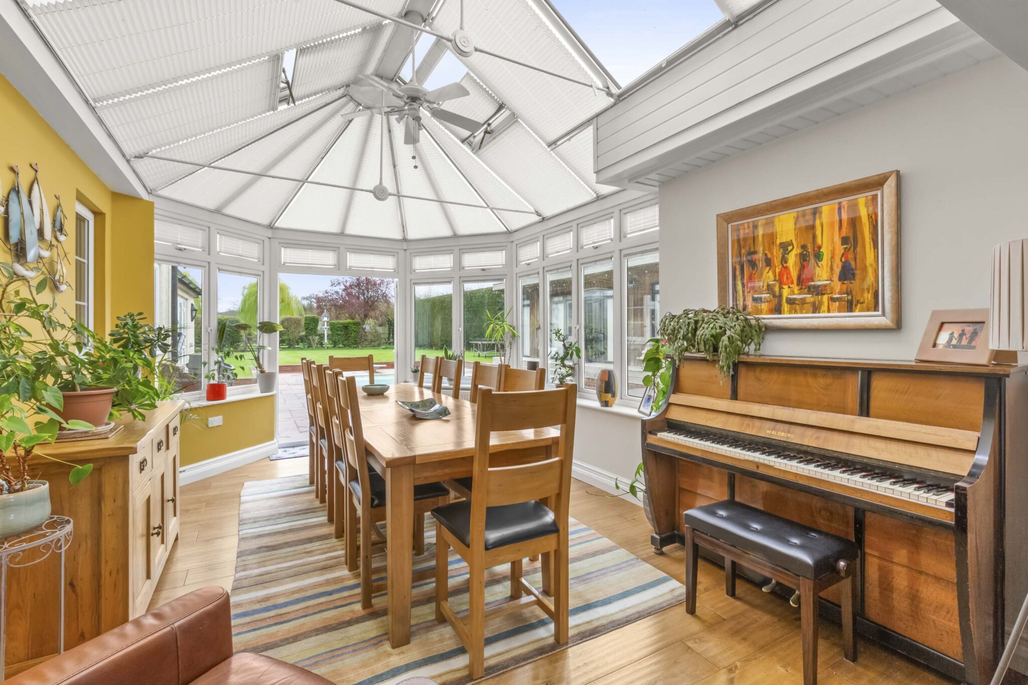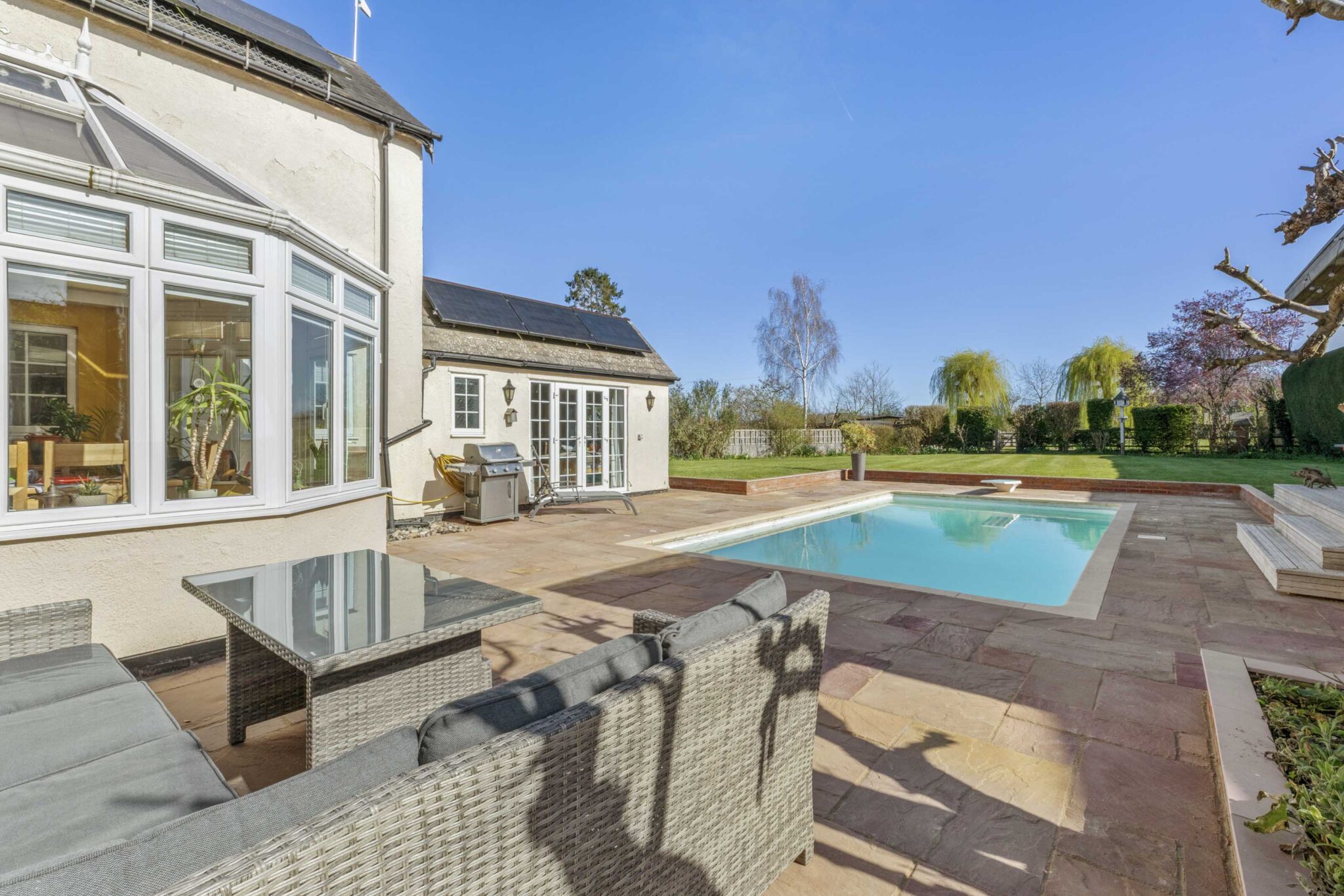 The grounds extend to approximately one acre and are beautifully arranged including formal gardens with an expanse of lawn, complemented by an extensive sandstone patio spanning the width of the house, ideal for outdoor entertaining. Additional features include a natural pond and a separate paddock. A standout feature is the versatile garden room, complete with insulation and its own shower room, offering excellent potential as a home office, studio, or leisure space. A heated swimming pool further enhances the lifestyle appeal. Further outbuildings include two stores, a workshop, and a garden store, providing ample storage and practical workspace. The property also benefits from a double garage and a generous driveway, with an EV charging point. Enjoying uninterrupted countryside views to both the front and rear, and surrounded by an extensive network of rural footpaths, this is a rare opportunity to acquire a home that perfectly balances rural tranquillity with flexible modern living.
