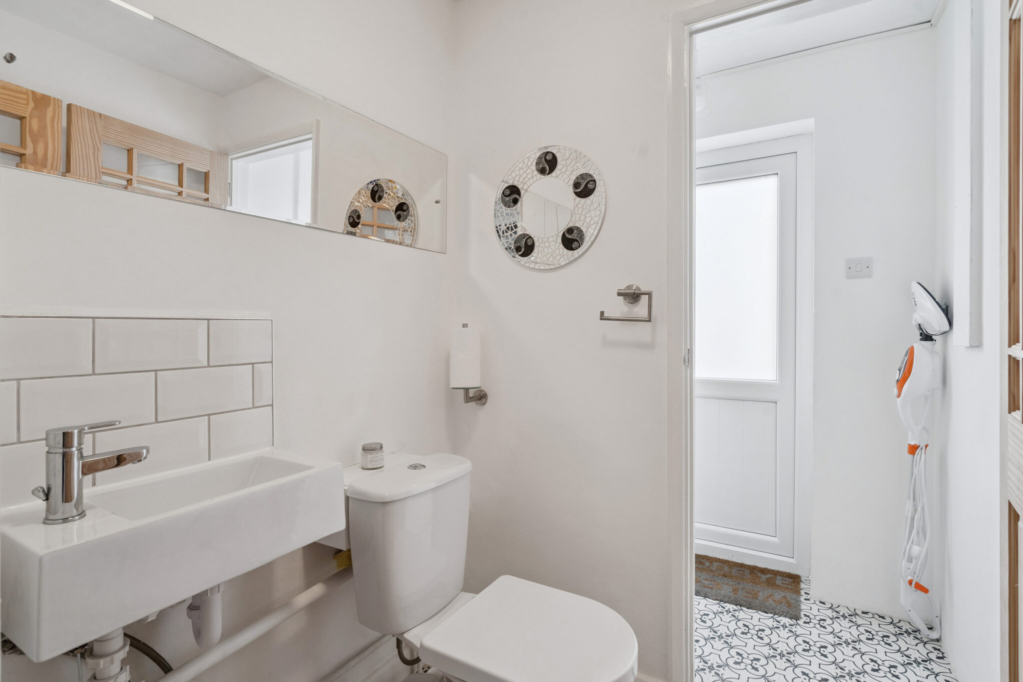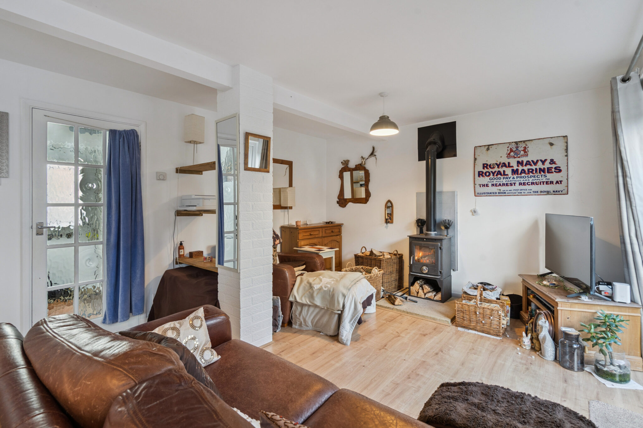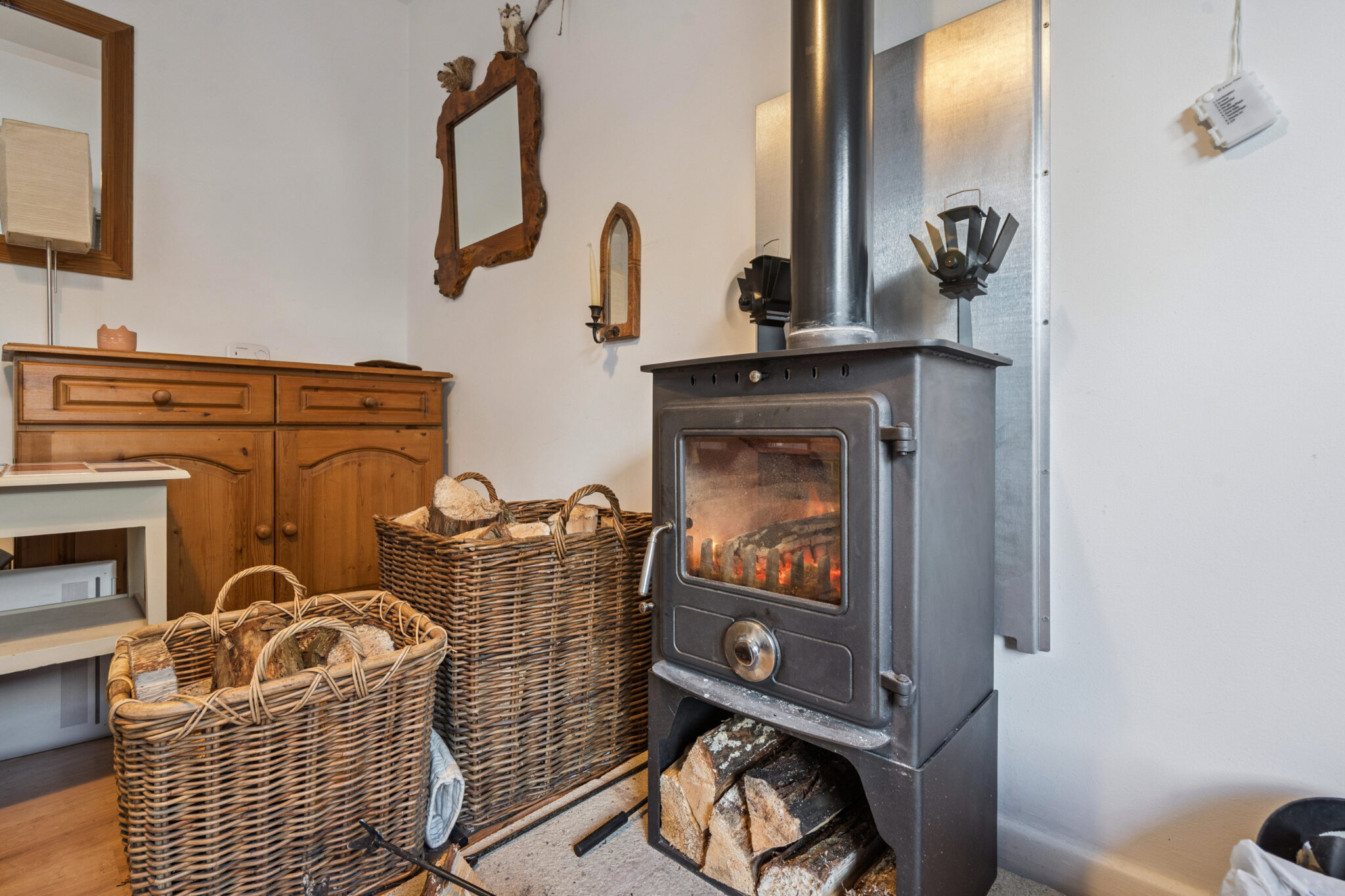 The accommodation is well balanced and practical. An inviting entrance hall leads through to a stylish, modern kitchen and a spacious sitting/dining room, complete with a log-burning stove — perfect for cosy evenings in. Double doors open onto a private, low-maintenance courtyard garden, ideal for outdoor dining and entertaining. A downstairs cloakroom and useful utility area complete the ground floor.