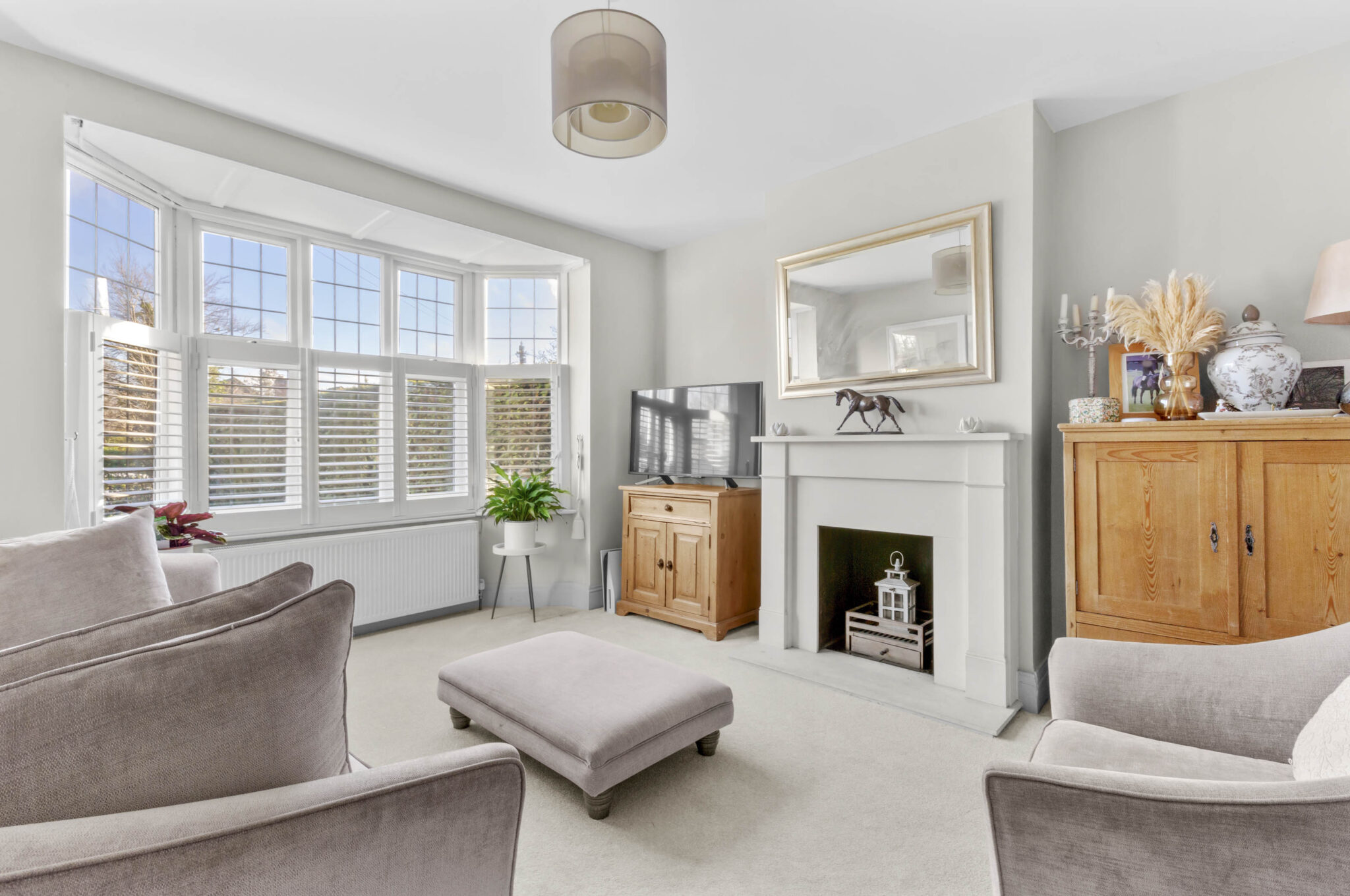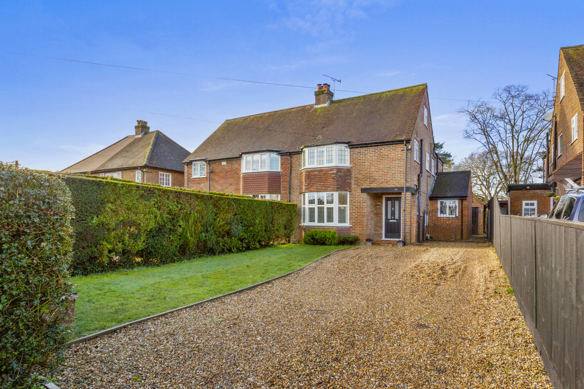 A gravelled driveway provides parking for up to four cars, with a lawned frontage adding to the welcoming feel. Inside, the entrance hall offers useful storage and a downstairs cloakroom. To the front, a comfortable sitting room centres around a working fireplace and bay window, creating a cosy retreat.