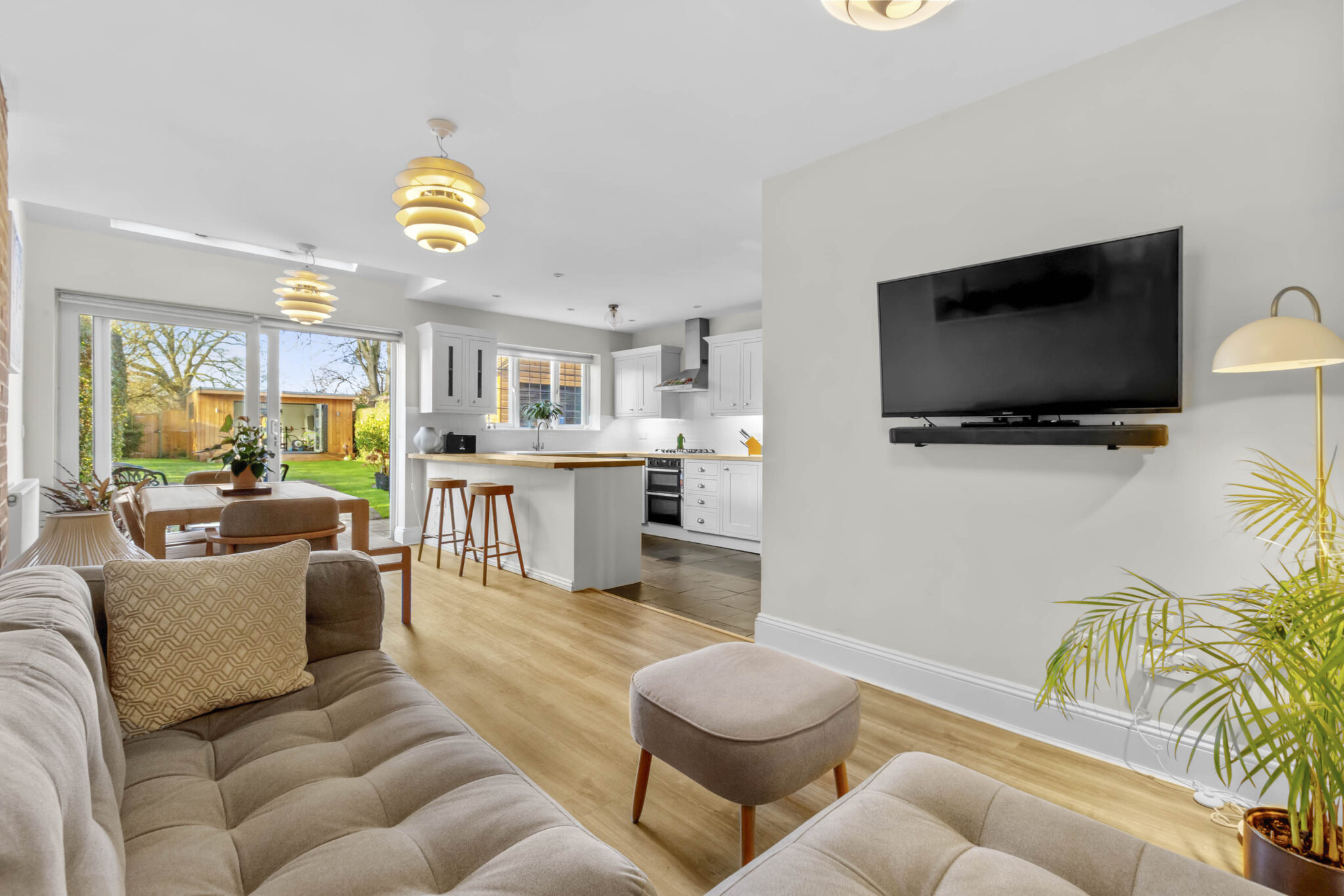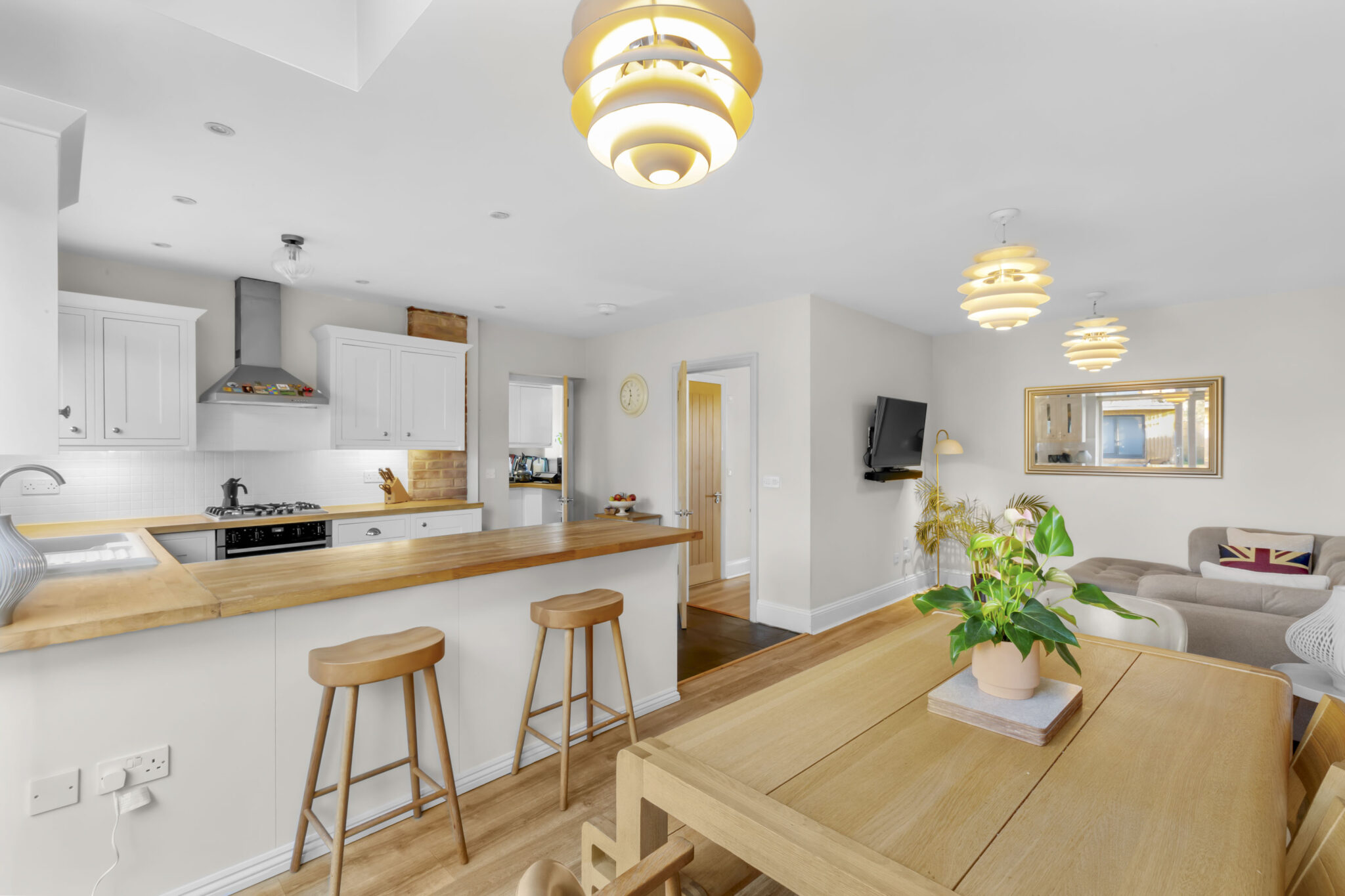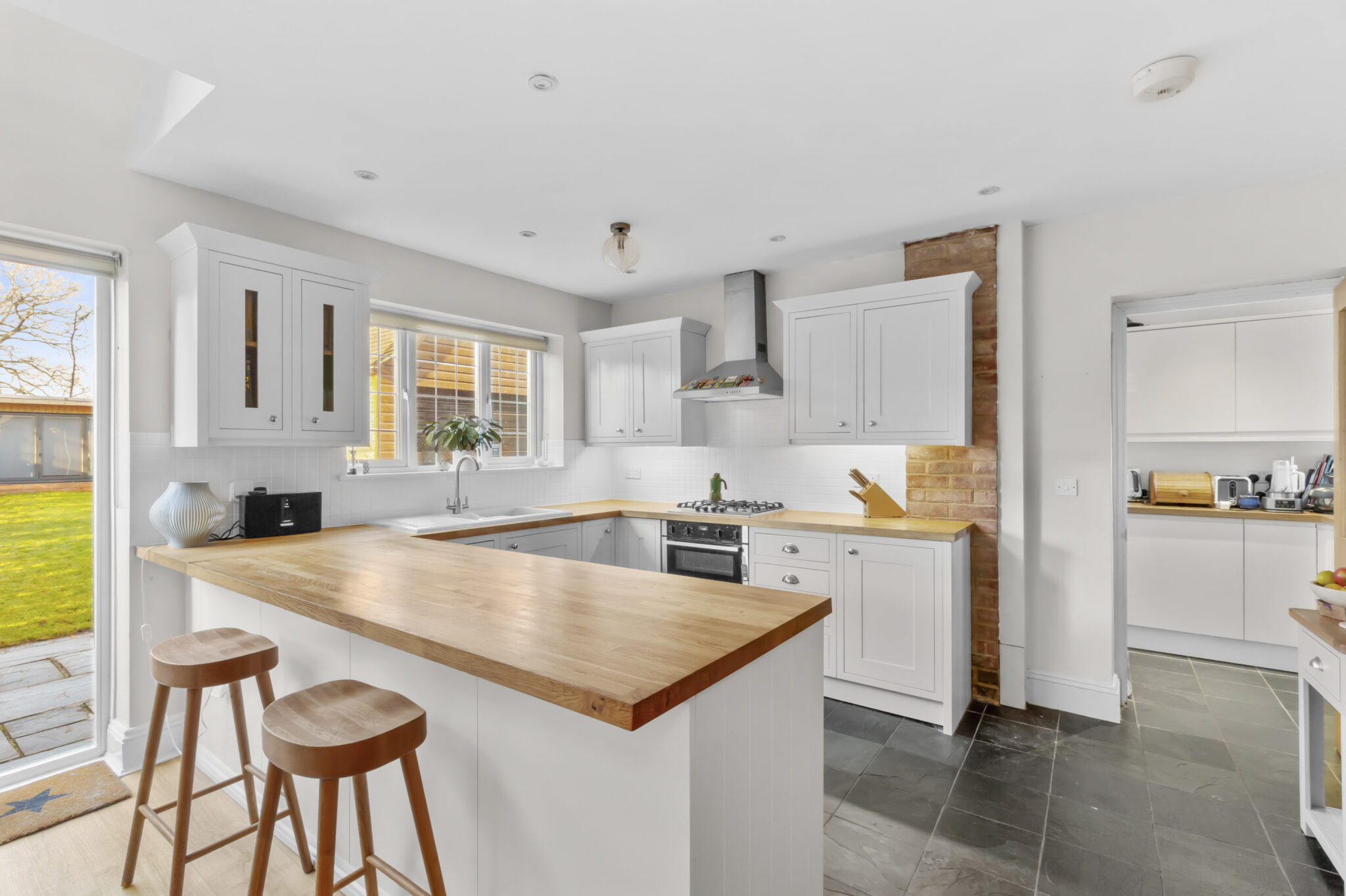 The rear of the house opens into a generous kitchen, dining and family space filled with natural light from Velux windows and wide sliding doors to the garden. Well arranged for everyday living, the kitchen includes wooden worktops, integrated appliances and flows neatly into a practical utility room.