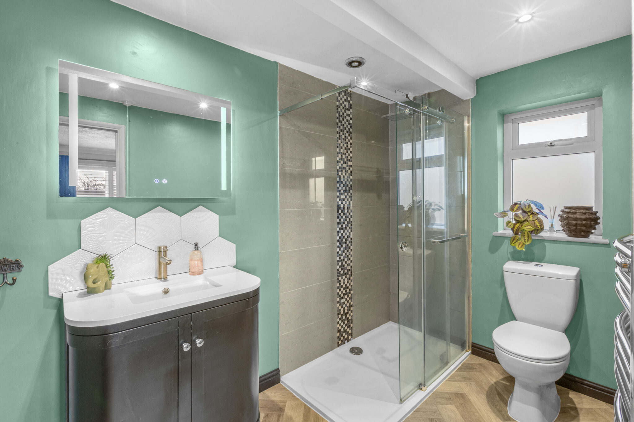 The contemporary fitted kitchen is finished with modern cabinetry, quality work surfaces, and ample storage, making it ideal for family cooking and hosting. Each of the five well-proportioned bedrooms provides versatility for family living, guest accommodation, or home office arrangements, while the principal bedroom enjoys the added luxury of a stylish en-suite. The modern bathroom suite is presented in clean, neutral tones with quality sanitaryware and functional fittings, complemented by a practical utility/WC for added convenience.