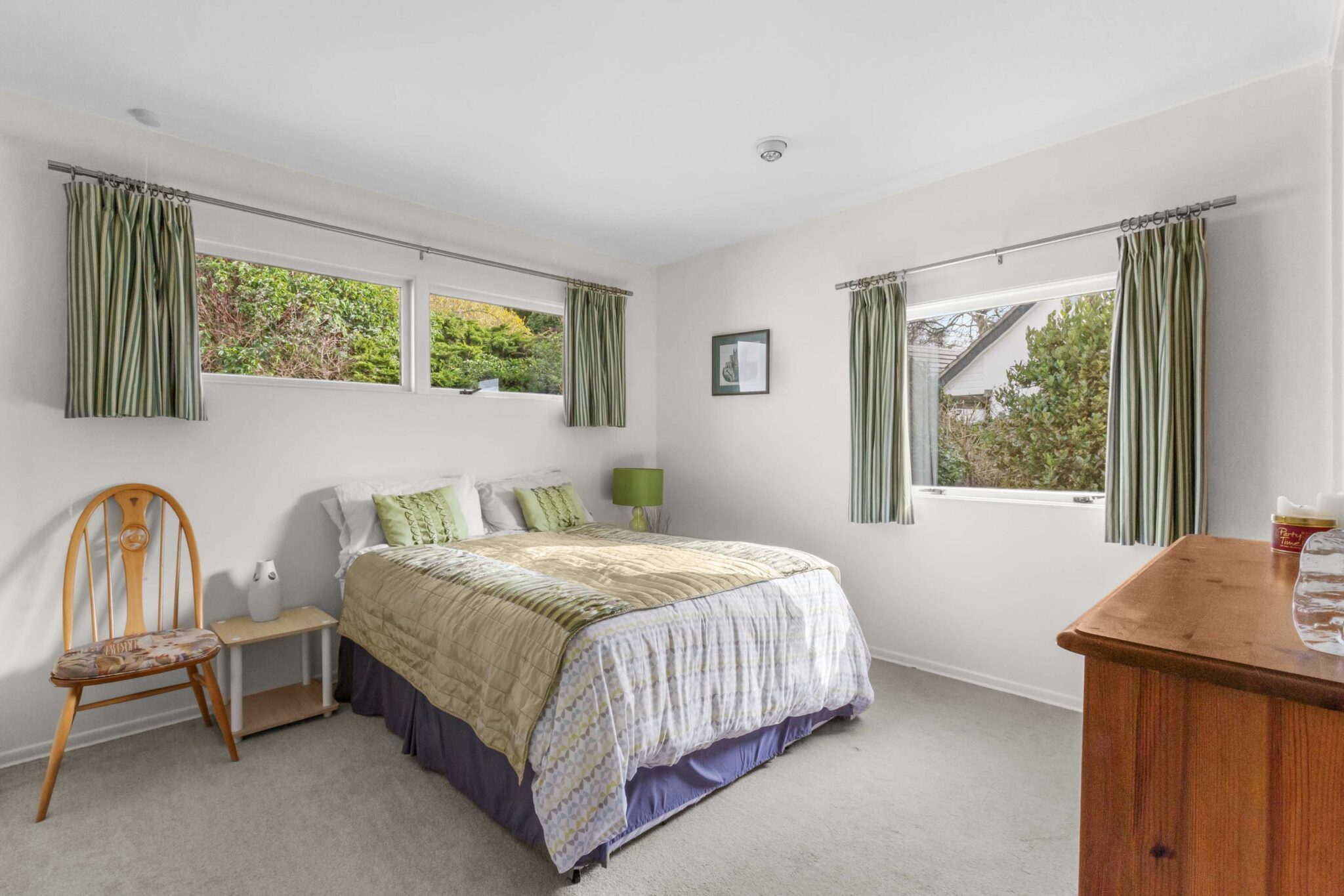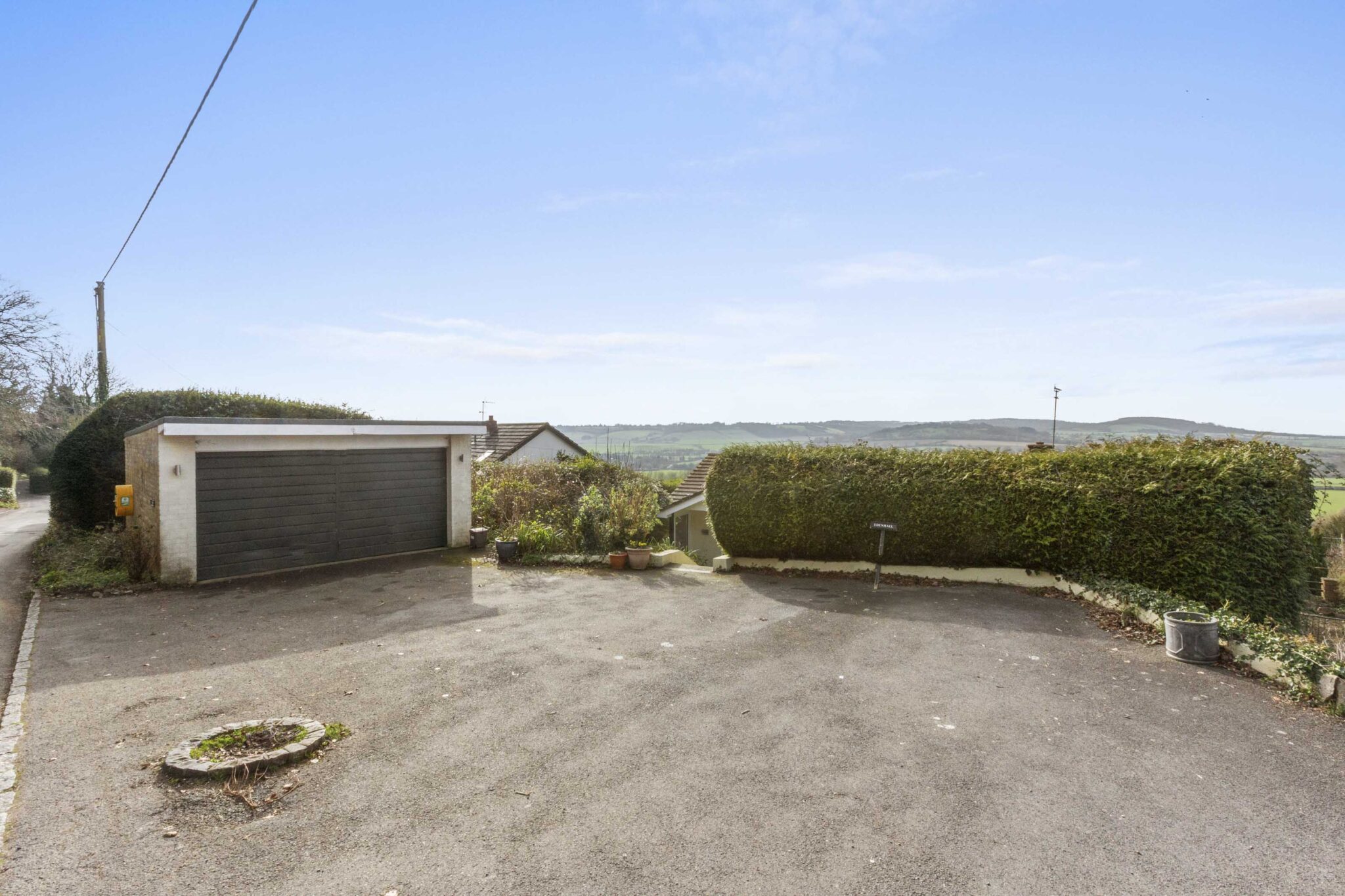 Outside, the attractive garden wraps around the house and is enclosed by neatly clipped hedges. The property is approached via an off-street parking area with space for four cars, in addition to a detached double garage with power, water, and lighting. The rear garden is arranged over three tiers: a paved terrace by the house with impressive views, a lawn with shrub borders, and a lower level that has been landscaped as a natural wild meadow. A private terraced seating area sits to the side of the house, offering a peaceful outdoor space.