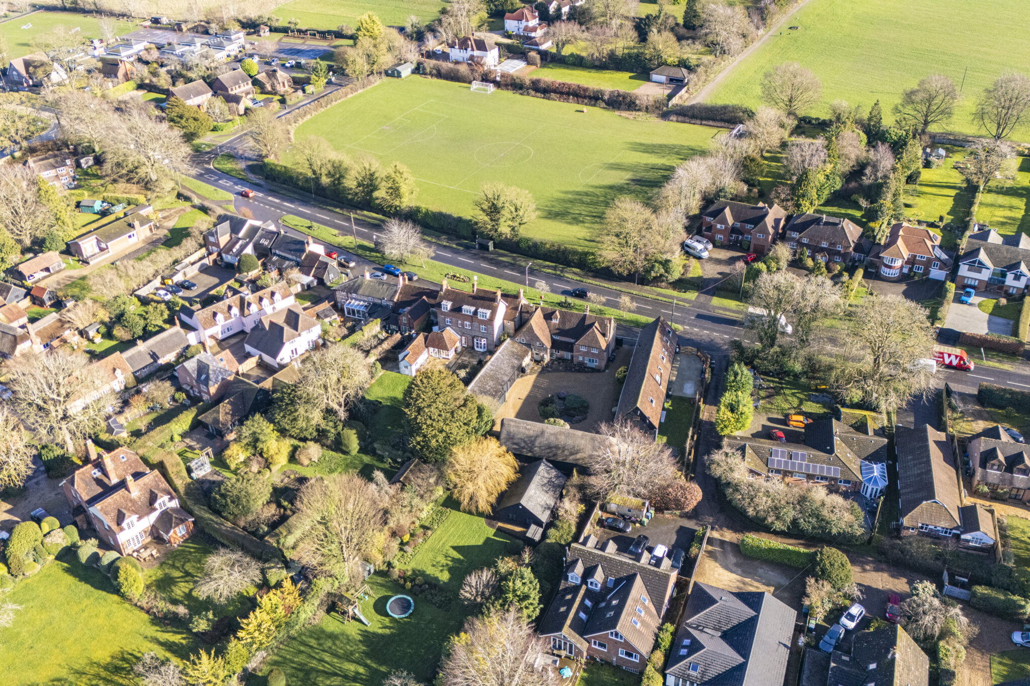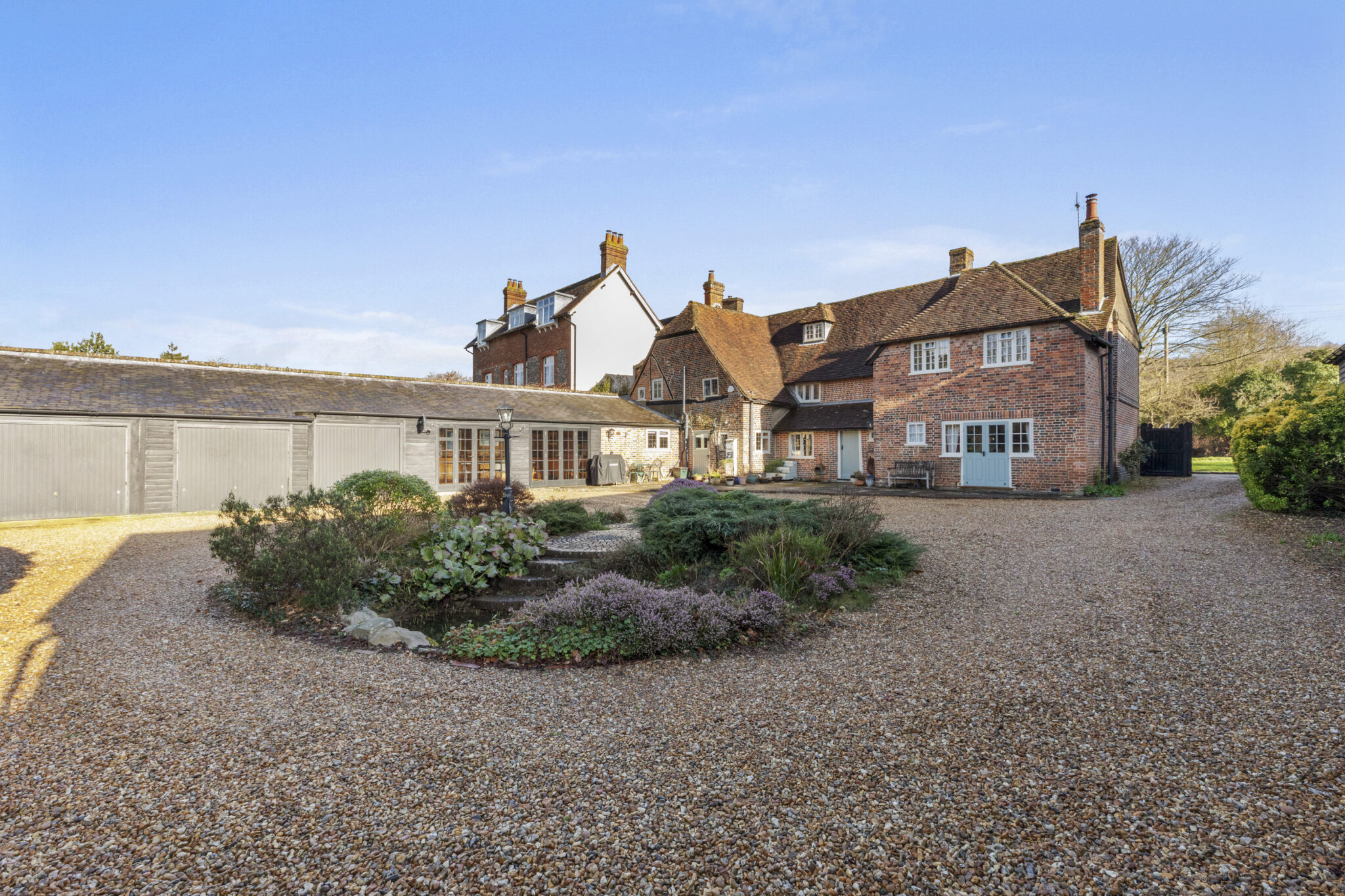 The driveway is to the side and leads round to the private gravel courtyard and a landscaped centre circle with a small pond. This provides ample parking for numerous vehicles as well as the four car garaging.