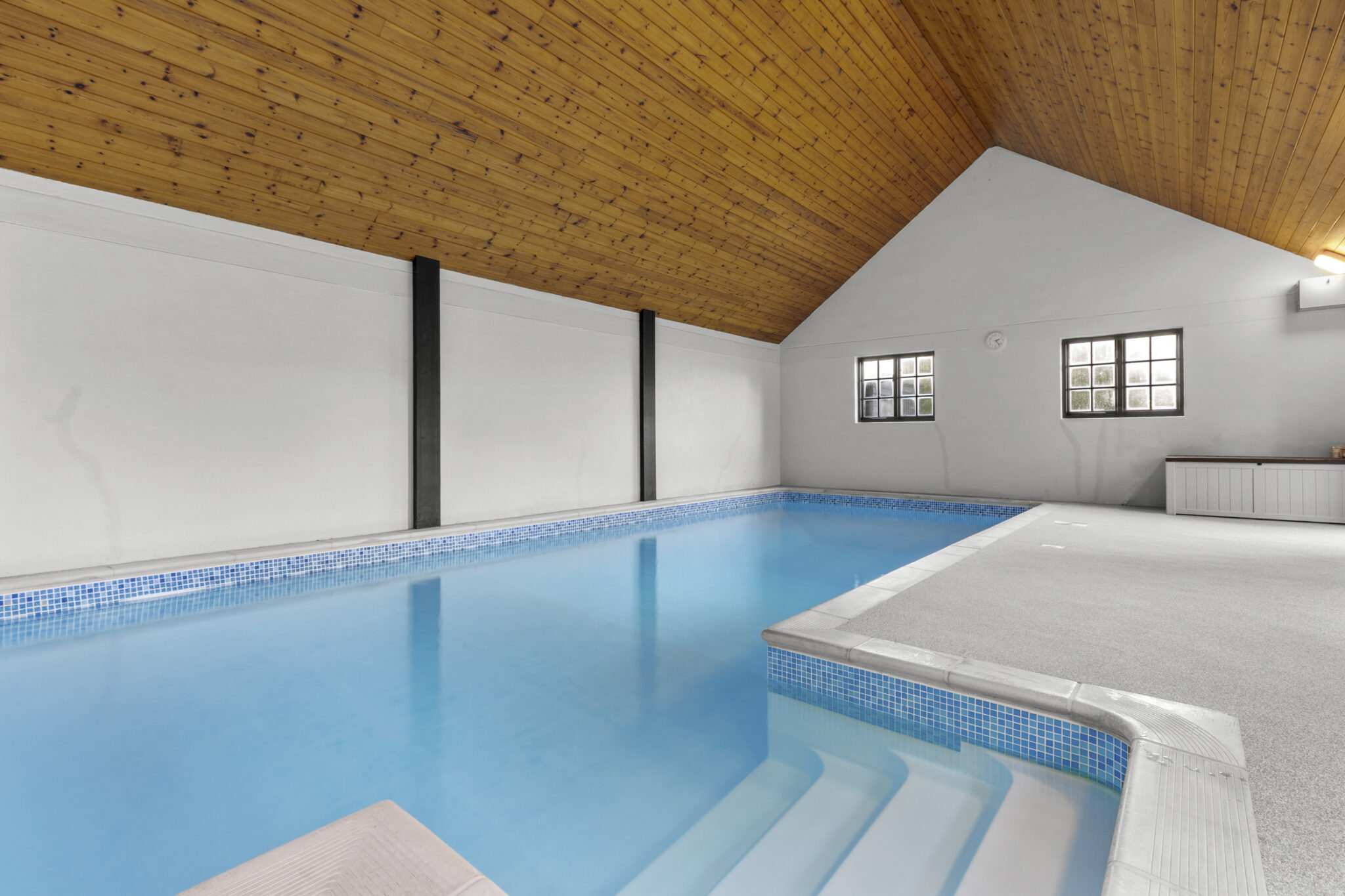 Beyond the barn is the indoor heated pool which is designed in the style of a barn to complement the surroundings.
