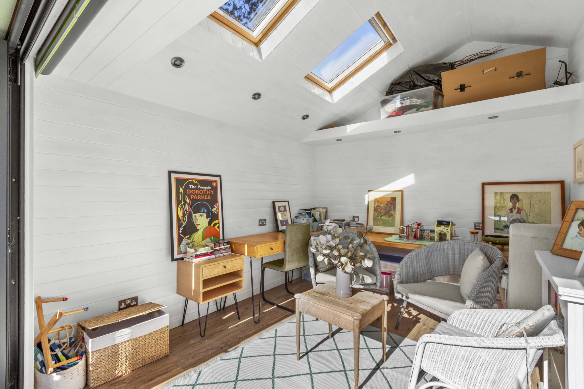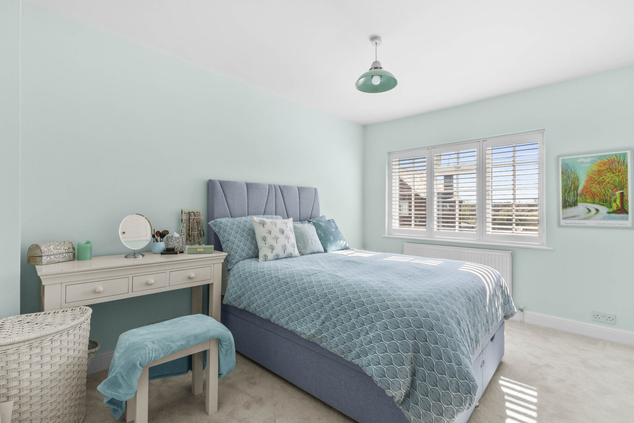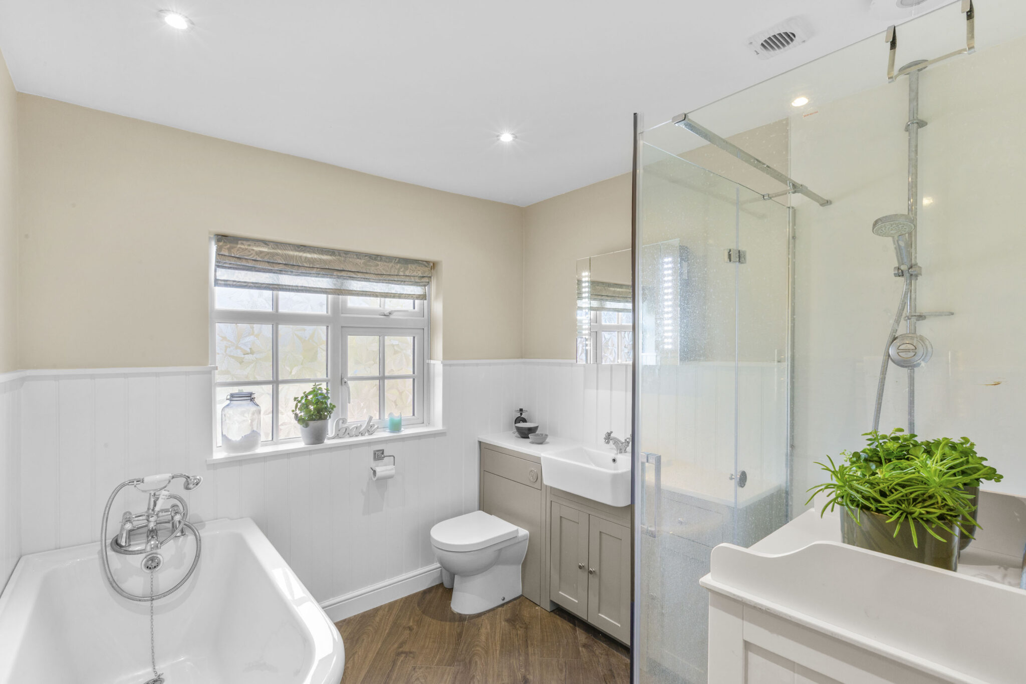 Upstairs, the landing gives access to an airing cupboard, two well-proportioned bedrooms, and a beautifully appointed bathroom. The main bedroom benefits from built-in wardrobes, with the second bedroom also featuring additional storage. The bathroom is particularly striking, fitted to a high standard and featuring a classic clawfoot bath and a separate shower.