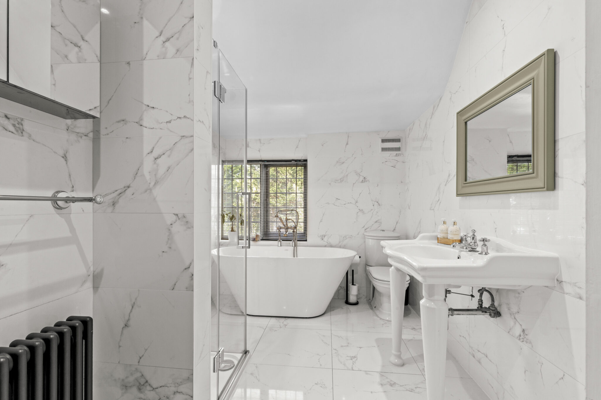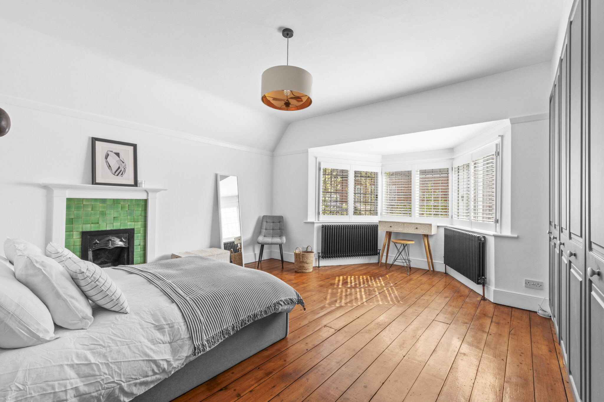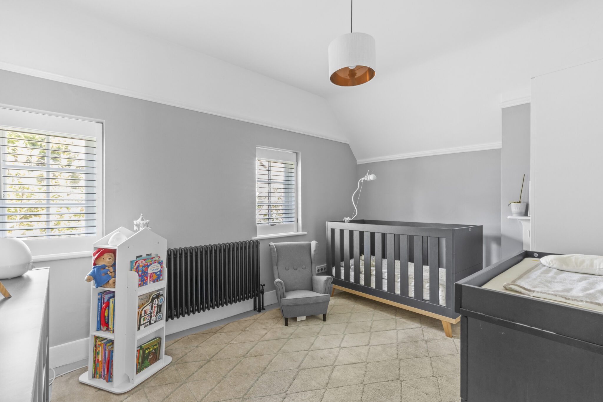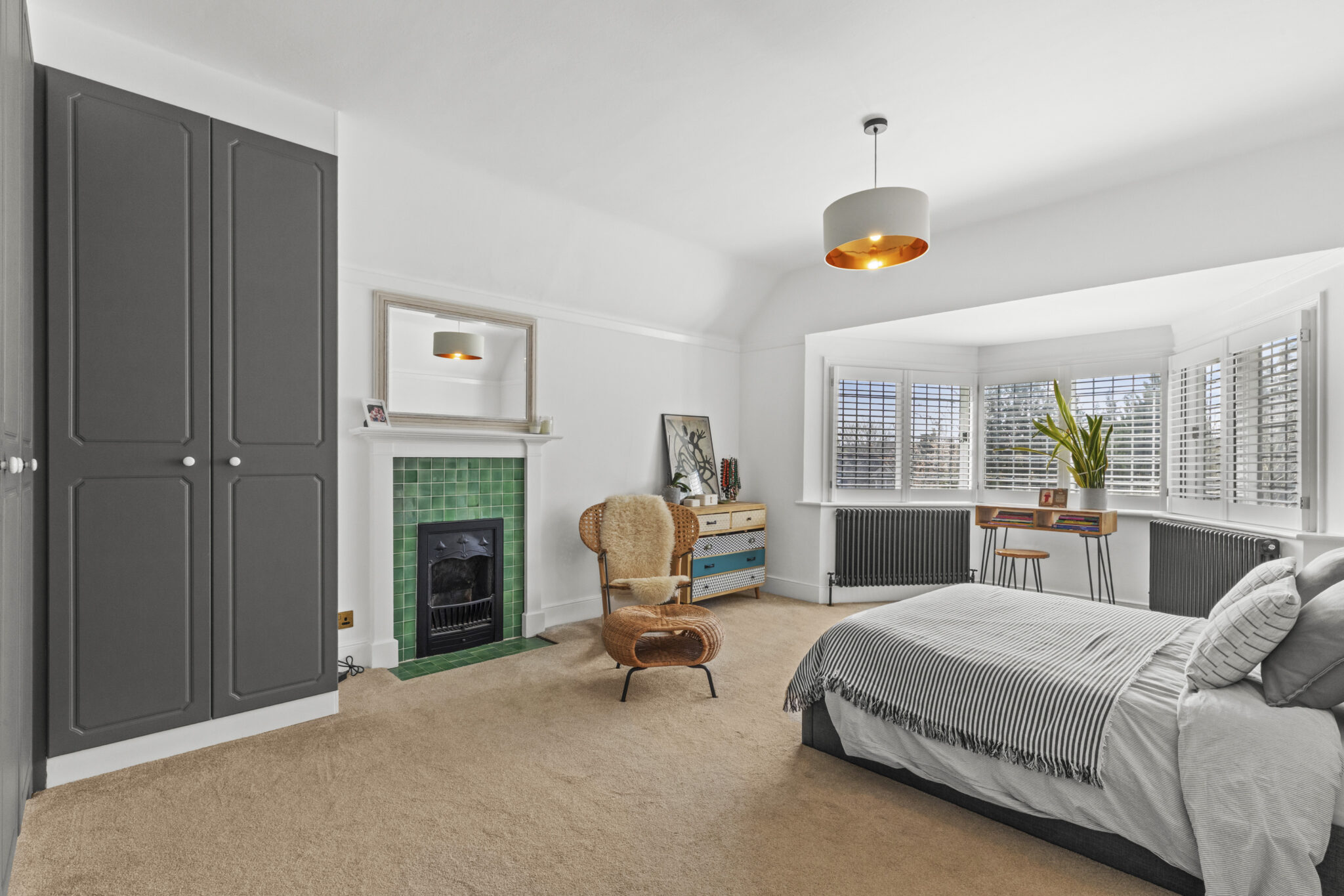Ascending to the first floor, a spacious landing leads to the principal bedroom, which enjoys far-reaching views, fitted wardrobes, and a decorative fireplace for a touch of grandeur. A connecting doorway provides access to the fifth bedroom/nursery room and a luxurious ensuite bathroom finished in Carrara marble, offering both privacy and versatility. Three further double bedrooms, each with their own period fireplaces - two of which benefit from fitted wardrobes - are served by a beautifully refitted family bathroom, also in elegant Carrara marble.