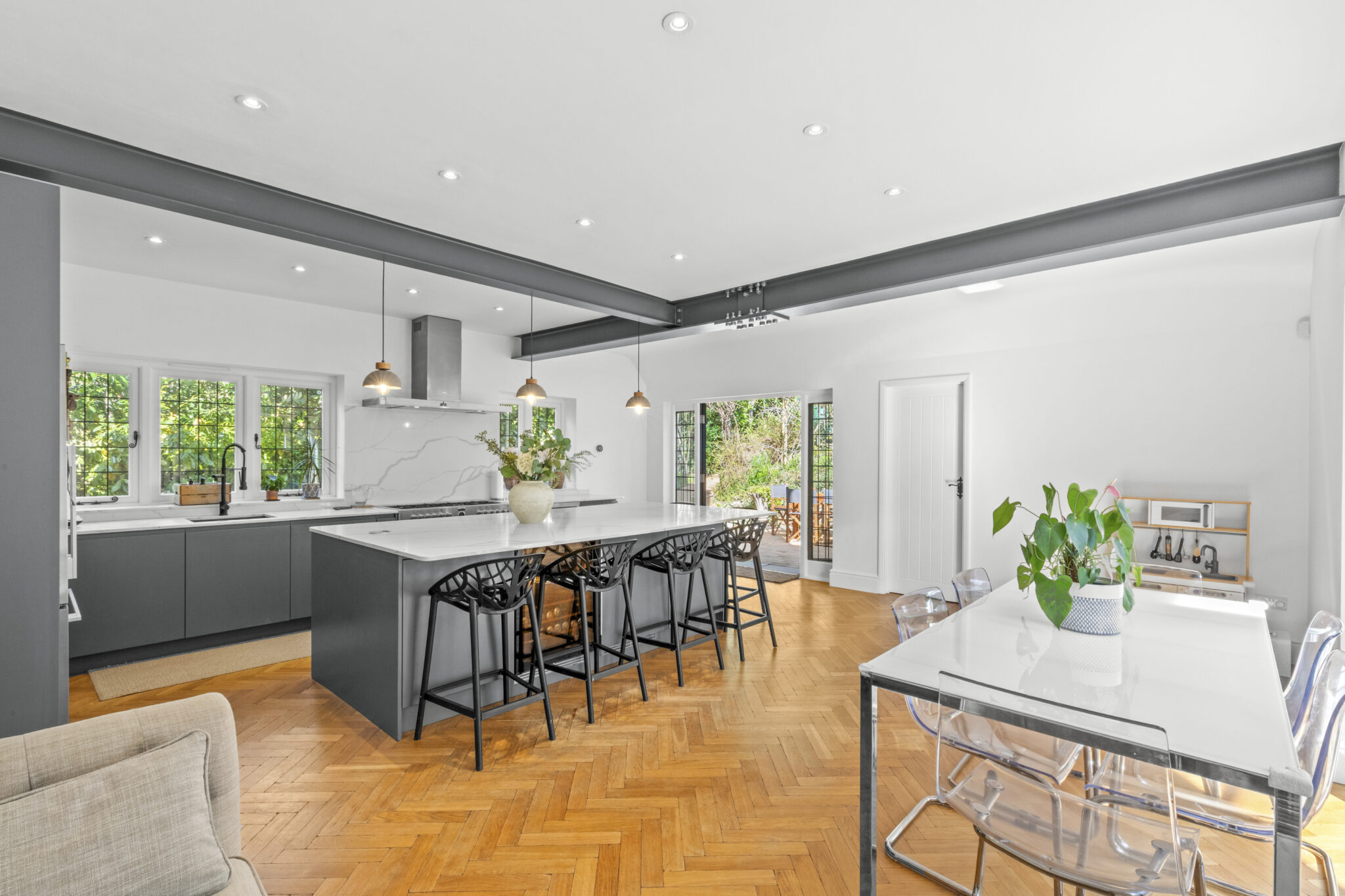 Spanning over 2,900 square feet, the property welcomes you with a grand reception hall featuring a striking wood burning stove and a comfortable seating area, setting the tone for the impressive accommodation beyond. The two principal reception rooms exude elegance, each boasting fine bay windows that flood the spaces with natural light, as well as exquisite period fireplaces that add warmth and charm. The heart of the home is the stunning kitchen/breakfast/dining room, where a bespoke contemporary kitchen is beautifully appointed with a central breakfast bar island, granite worktops, quality integrated appliances, and the comfort of underfloor heating, making it an ideal space for family gatherings and entertaining. Double doors lead to a private side patio, further doors to functional utility room and gardens.