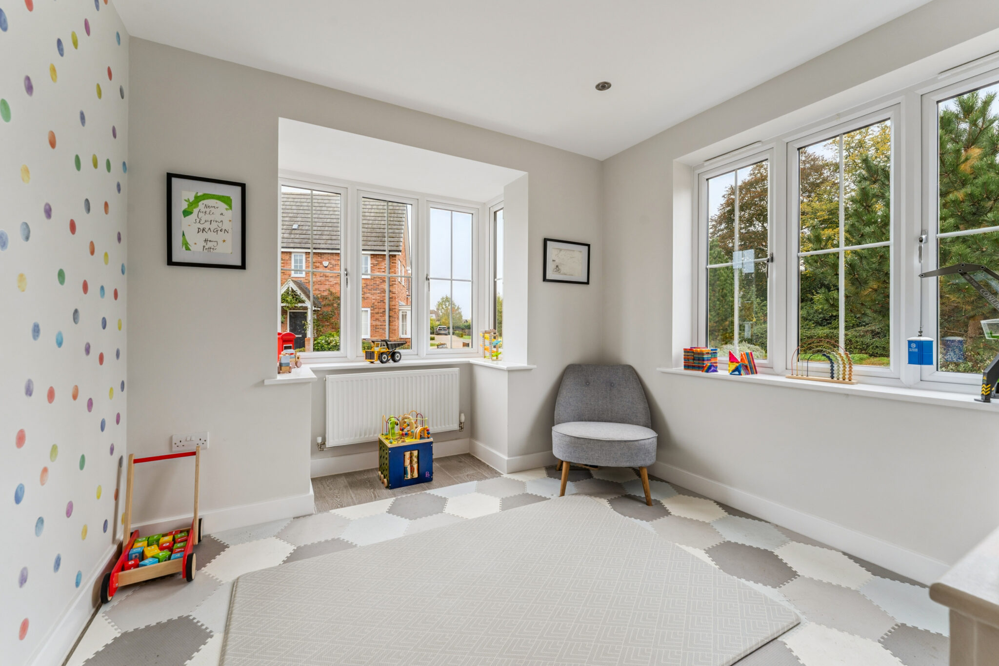 The spacious ground floor offers a welcoming entrance hall, leading to a bright sitting room with feature fireplace, and a versatile dual aspect study/playroom. The heart of the home is the stunning open-plan kitchen/dining/family area—ideal for modern family living—complemented by a separate utility room. The cloakroom completes the ground floor.
