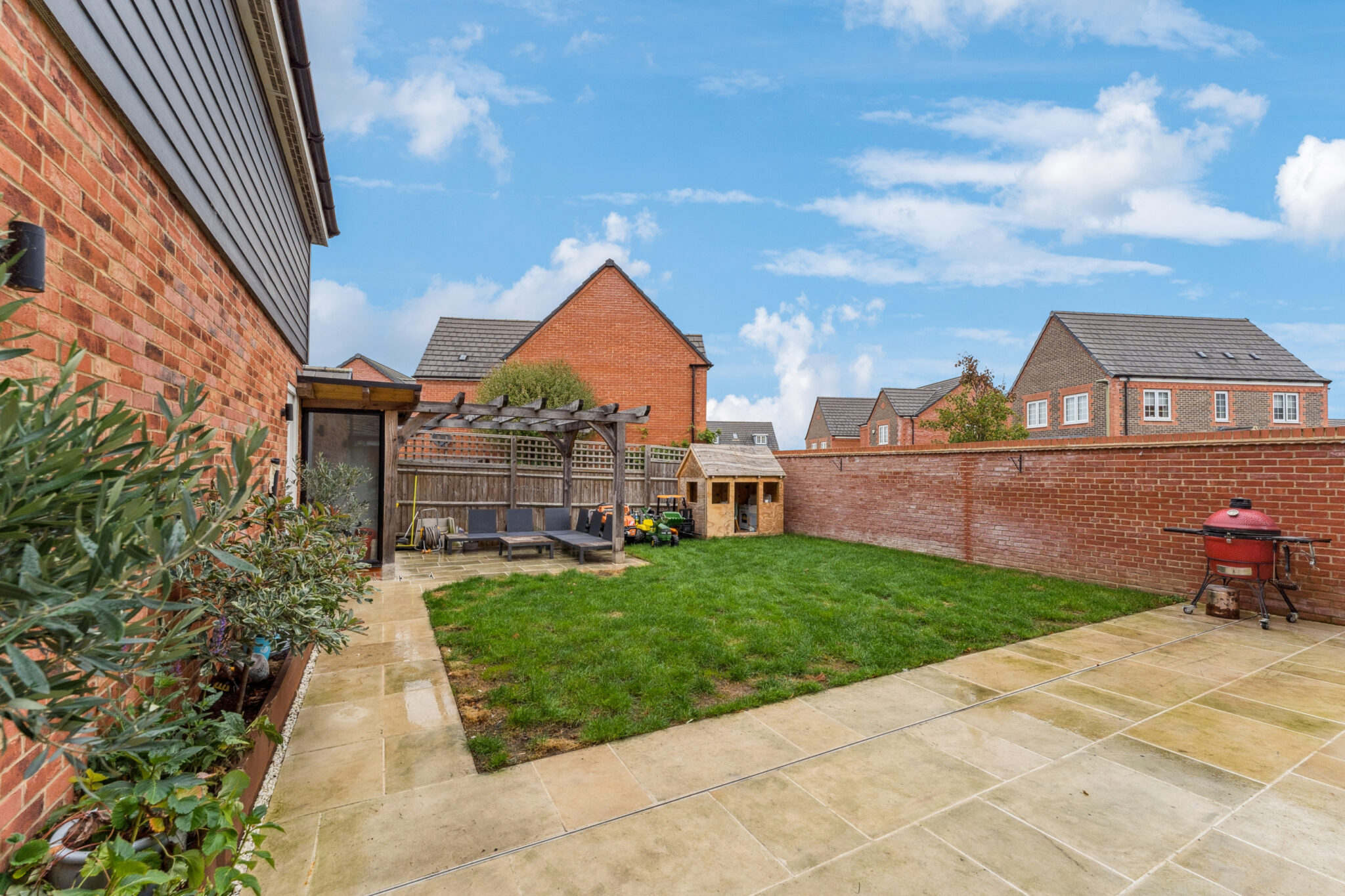 The well-maintained rear garden is a fantastic space for relaxing and entertaining, featuring a patio terrace, lawned area, and a home gym.