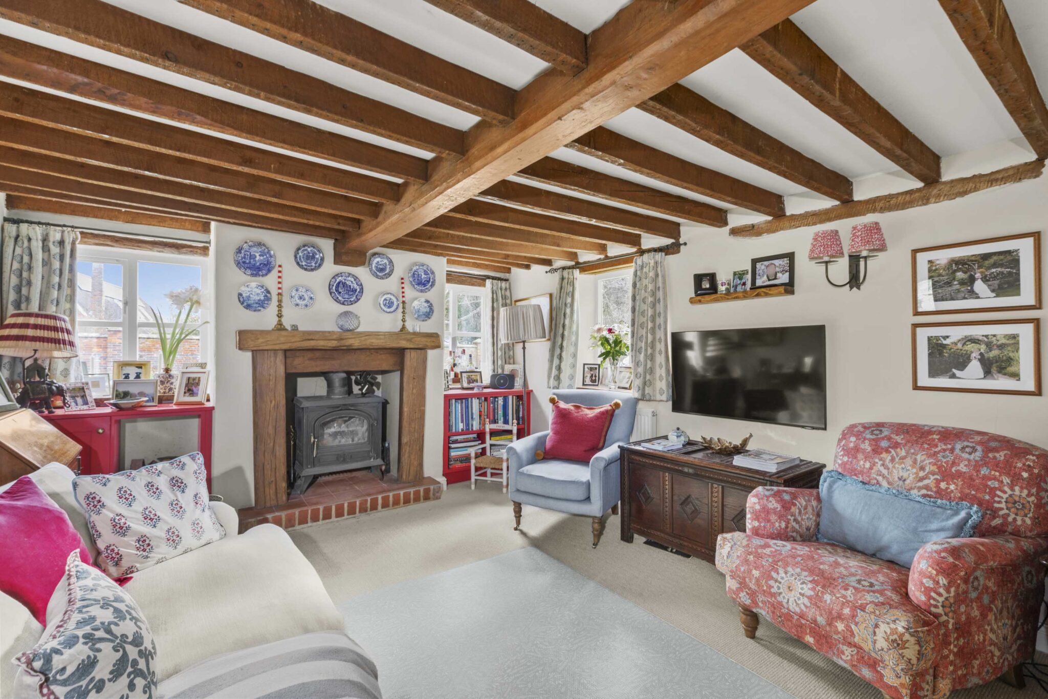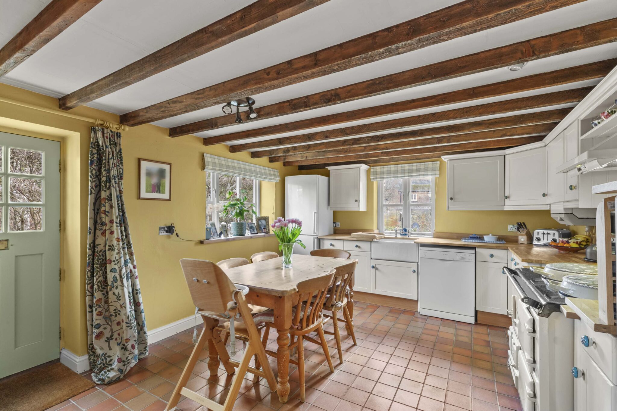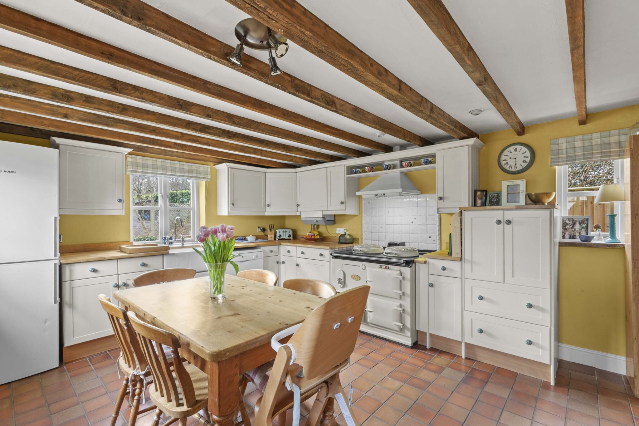 Character features have been carefully retained throughout, including exposed beams, solid oak window sills and solid wood internal doors with traditional iron latches. A recently installed main front door opens into a delightful triple-aspect kitchen/breakfast room featuring a tiled floor, classic Aga oven, butler sink and integrated dishwasher creating a warm and welcoming heart of the home. The dual-aspect sitting room centres around a solid oak fireplace with a wood-burning stove, and benefits from access to the utility/cloakroom as well as a door leading directly to the rear garden. On the first floor are three bedrooms and a stylishly refitted family bathroom, upgraded in recent years to include a modern suite with shower over the bath, while retaining its Velux window. The principal bedroom also benefits from a fitted double wardrobe, providing excellent storage. The property further benefits from access to a secure and boarded loft space, offering additional storage and enhancing the home’s practicality.