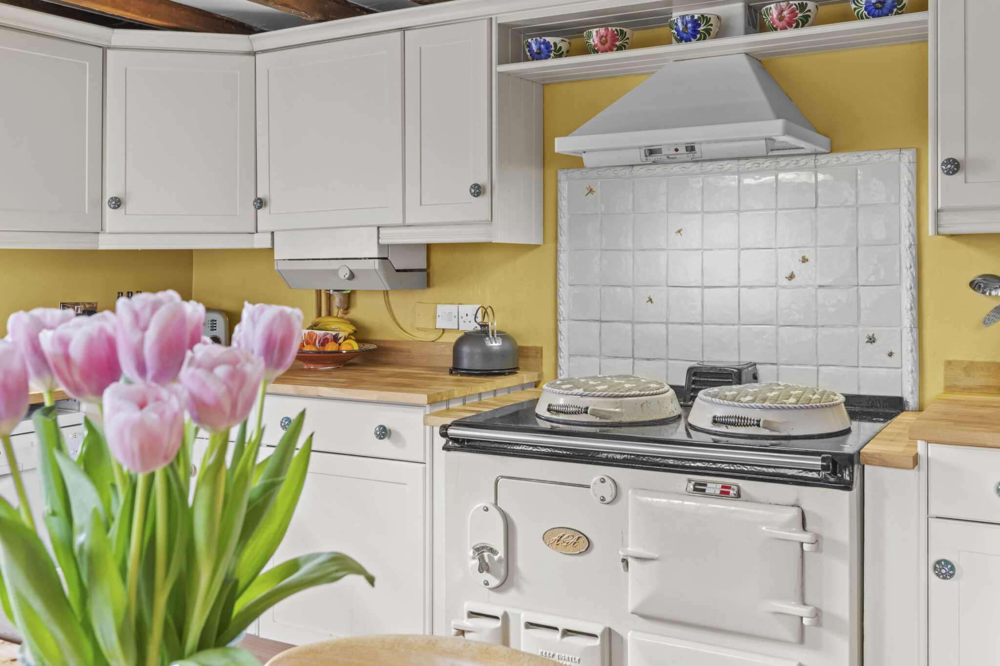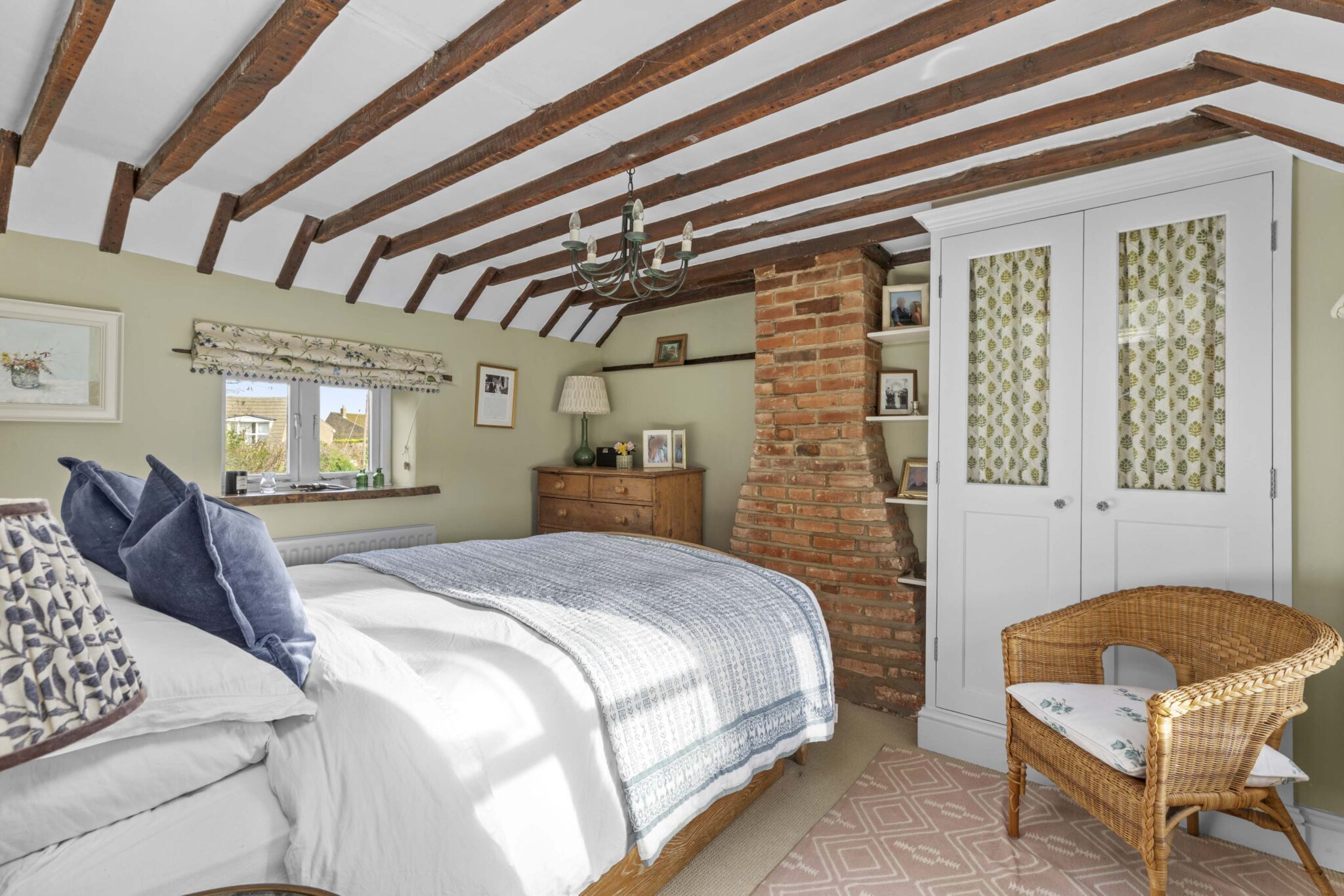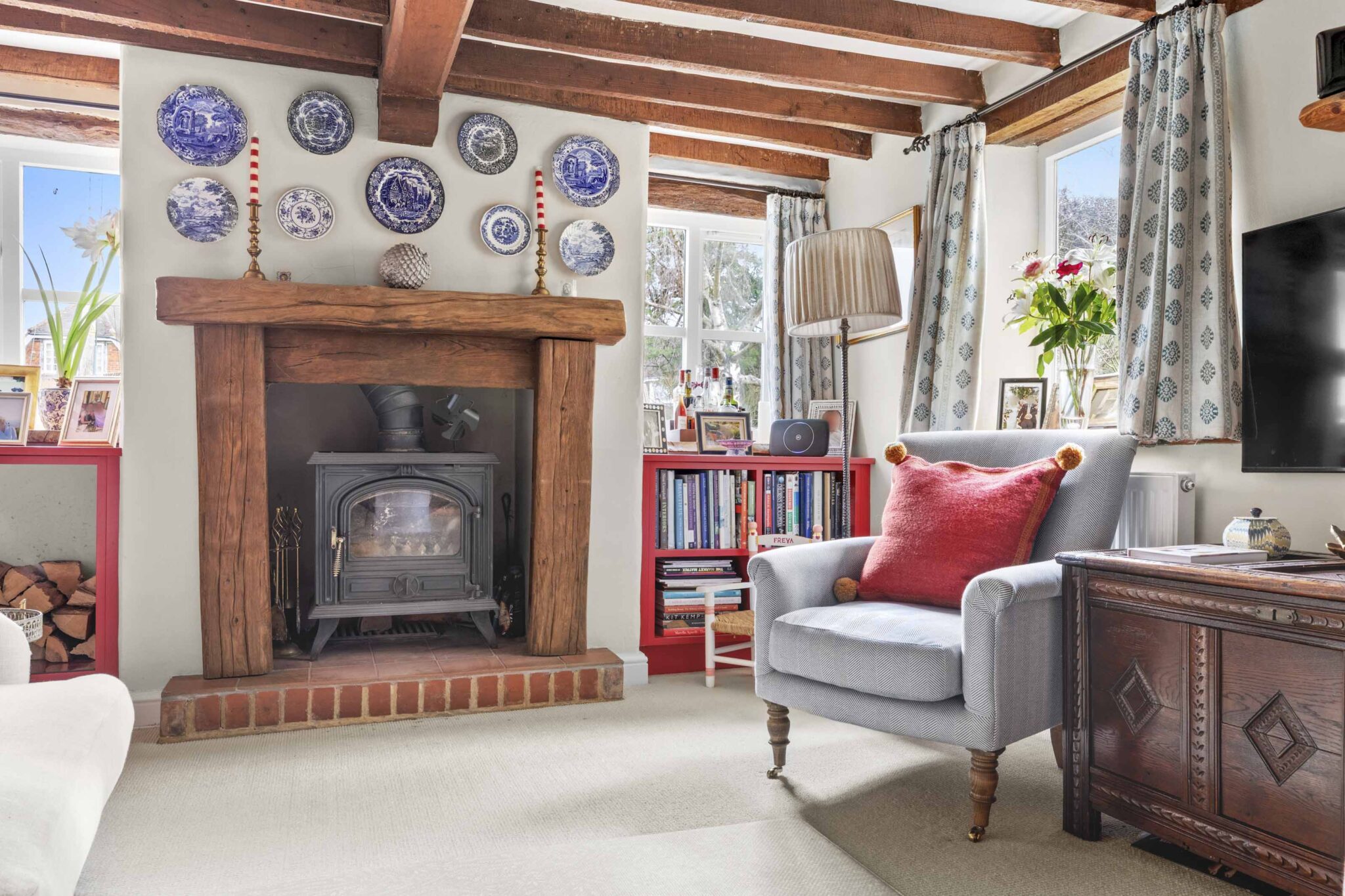 Character features have been carefully retained throughout, including exposed beams, solid oak window sills and solid wood internal doors with traditional iron latches. A recently installed main front door opens into a delightful triple-aspect kitchen/breakfast room featuring a tiled floor, classic Aga oven, butler sink and integrated dishwasher creating a warm and welcoming heart of the home. The dual-aspect sitting room centres around a solid oak fireplace with a wood-burning stove, and benefits from access to the utility/cloakroom as well as a door leading directly to the rear garden. On the first floor are three bedrooms and a stylishly refitted family bathroom, upgraded in recent years to include a modern suite with shower over the bath, while retaining its Velux window. The principal bedroom also benefits from a fitted double wardrobe, providing excellent storage. The property further benefits from access to a secure and boarded loft space, offering additional storage and enhancing the home’s practicality.