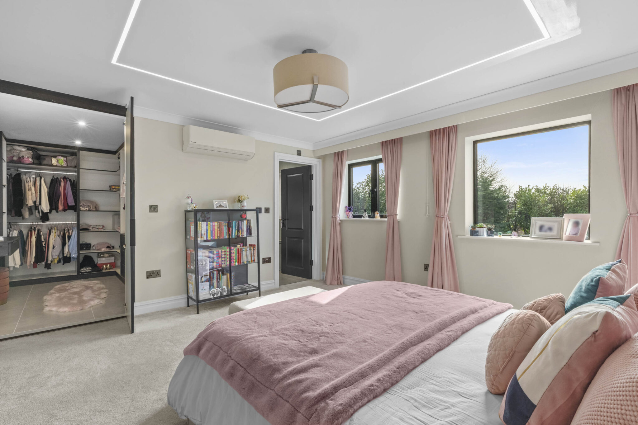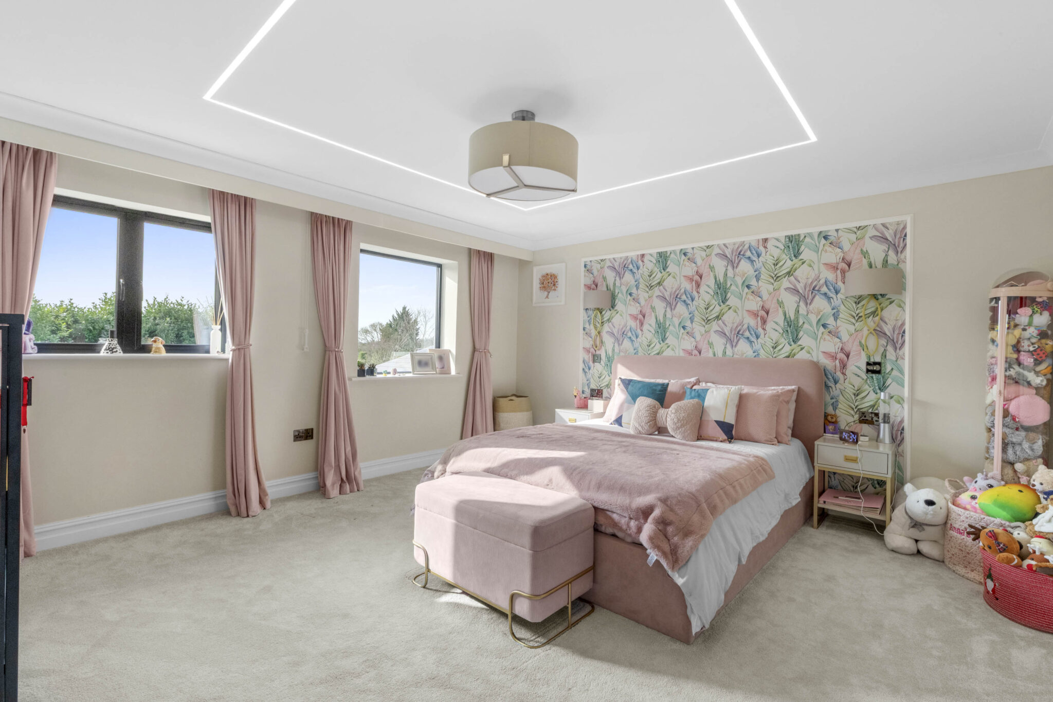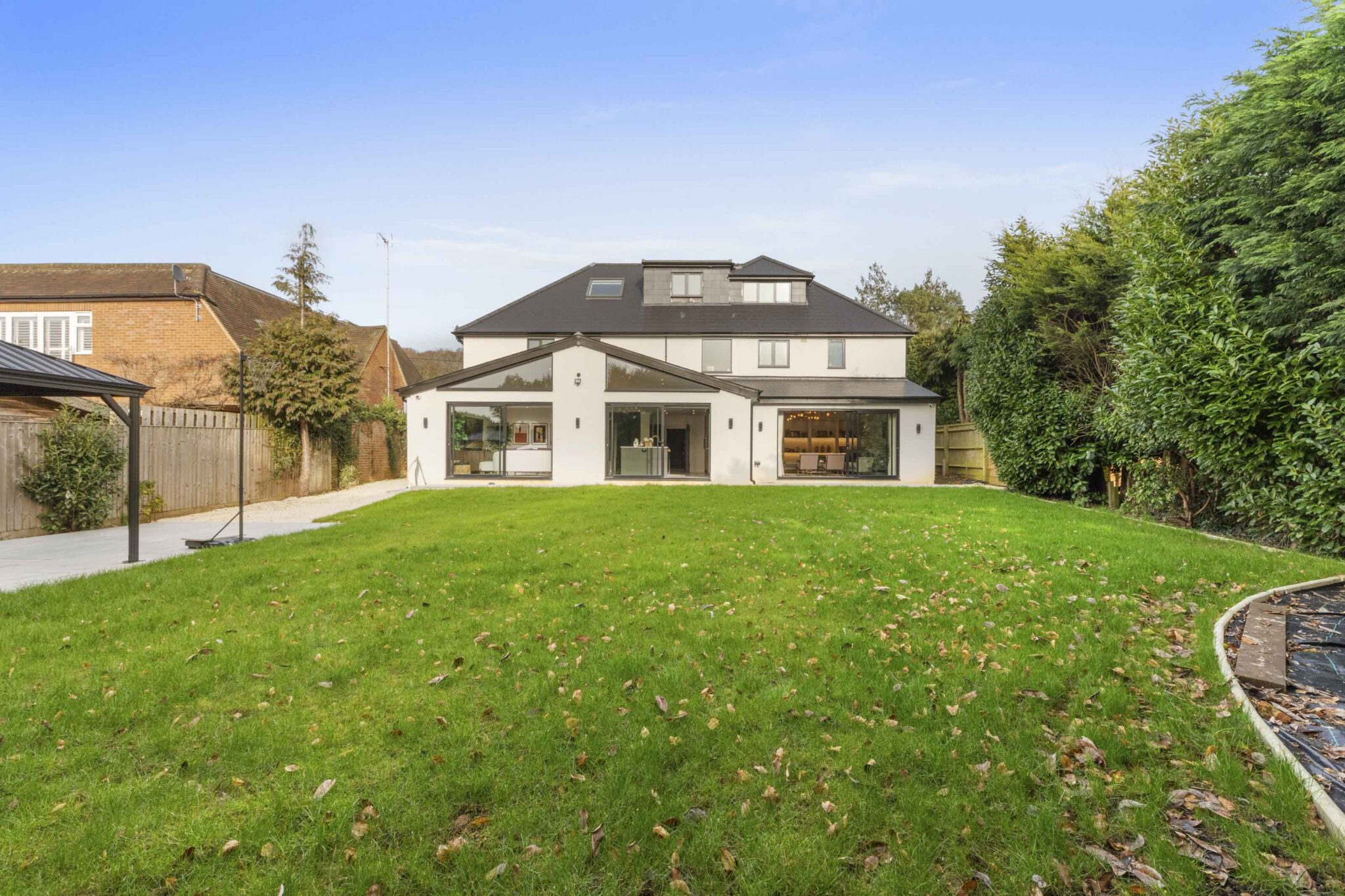 The heart of the home is a stunning open plan kitchen and living area, featuring sleek cabinetry, a contemporary kitchen island with integrated appliances and stylish gold fixtures. Expansive bi-fold and sliding doors provide effortless access to the beautifully landscaped rear garden, maximising natural light and creating seamless indoor-outdoor living perfect for entertaining or relaxing with family. The garden itself offers a generous lawn, paved patio, and a stylish pergola, all surrounded by private fencing to ensure a tranquil retreat for outdoor activities or al fresco dining. Each of the five bedrooms is thoughtfully appointed, with large windows, plush carpeting, and modern furnishings. The master suite stands out with an elegant wallpaper feature wall, spacious walk-in closet, and luxurious ensuite bathroom. Additional bedrooms offer ensuite facilities, decorative accents, and built-in storage solutions, ensuring comfort and practicality for every member of the household.