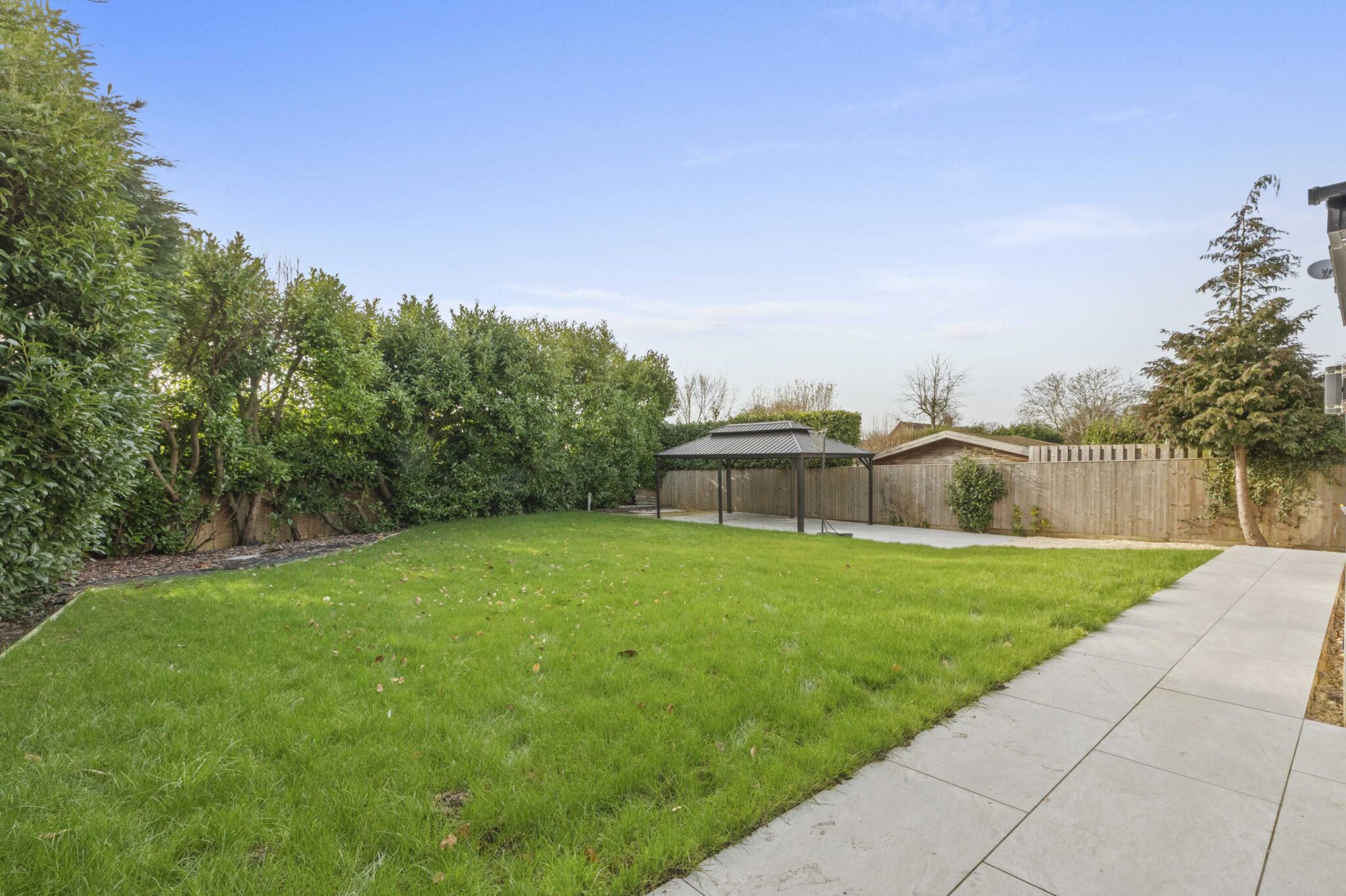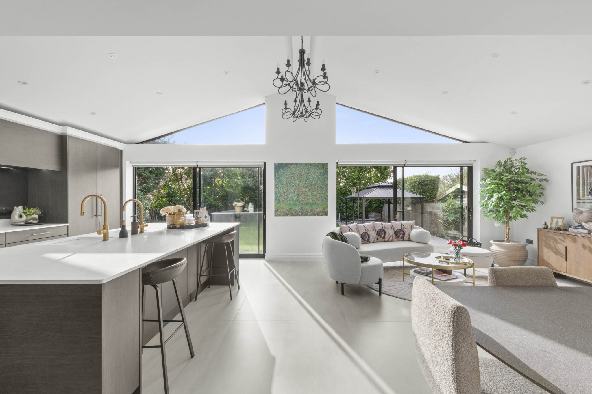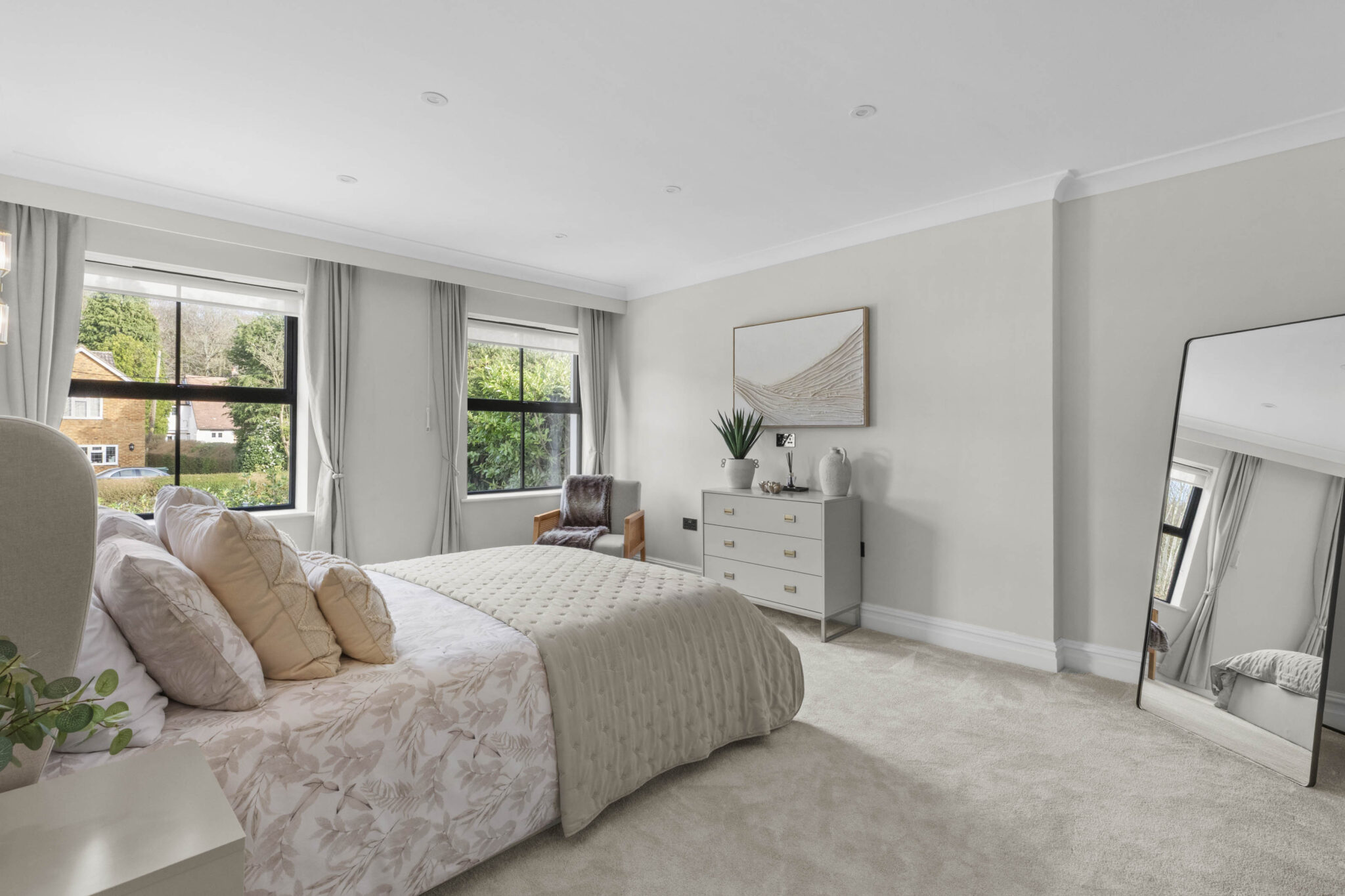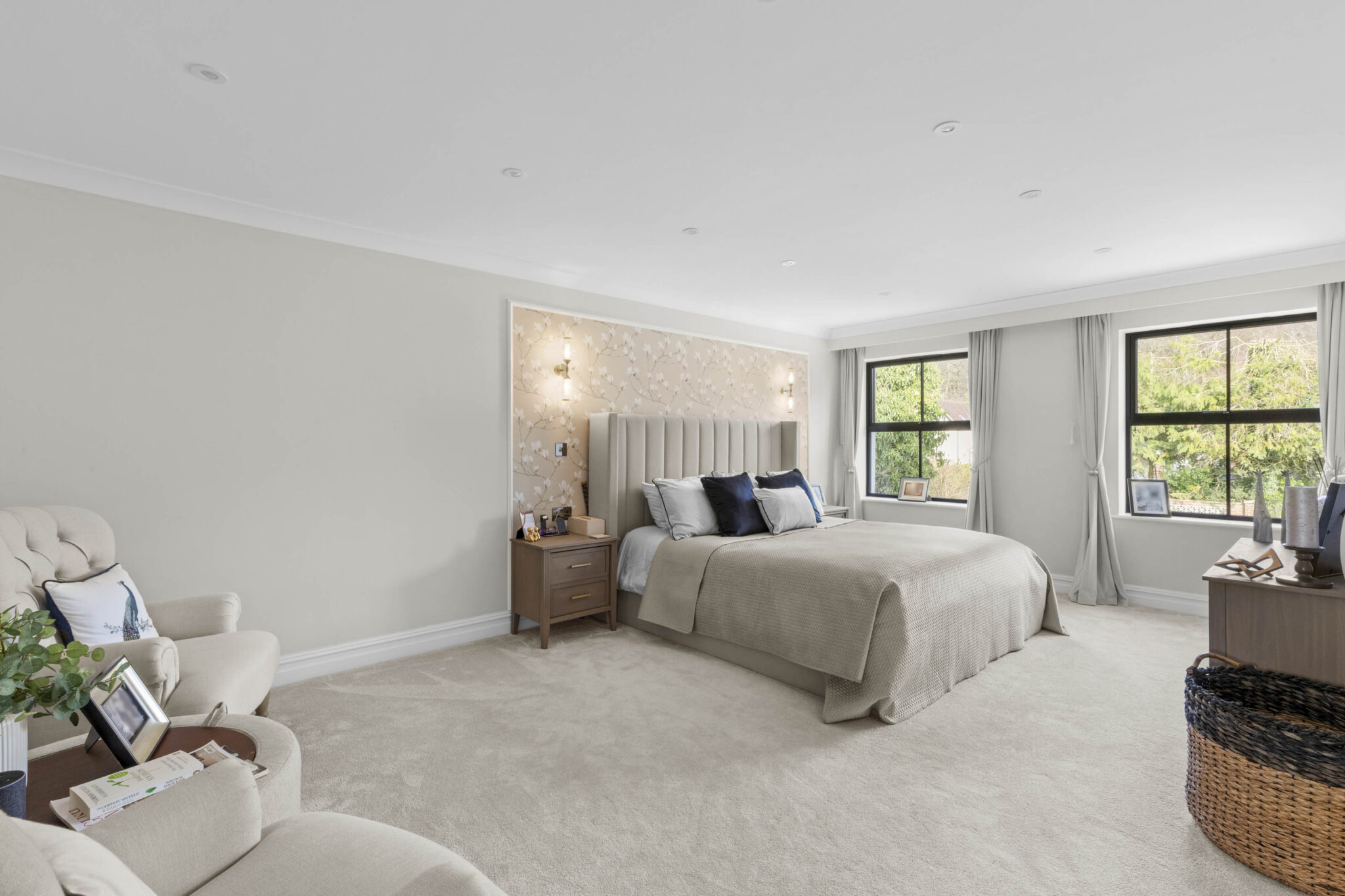 The heart of the home is a stunning open plan kitchen and living area, featuring sleek cabinetry, a contemporary kitchen island with integrated appliances and stylish gold fixtures. Expansive bi-fold and sliding doors provide effortless access to the beautifully landscaped rear garden, maximising natural light and creating seamless indoor-outdoor living perfect for entertaining or relaxing with family. The garden itself offers a generous lawn, paved patio, and a stylish pergola, all surrounded by private fencing to ensure a tranquil retreat for outdoor activities or al fresco dining. Each of the five bedrooms is thoughtfully appointed, with large windows, plush carpeting, and modern furnishings. The master suite stands out with an elegant wallpaper feature wall, spacious walk-in closet, and luxurious ensuite bathroom. Additional bedrooms offer ensuite facilities, decorative accents, and built-in storage solutions, ensuring comfort and practicality for every member of the household.