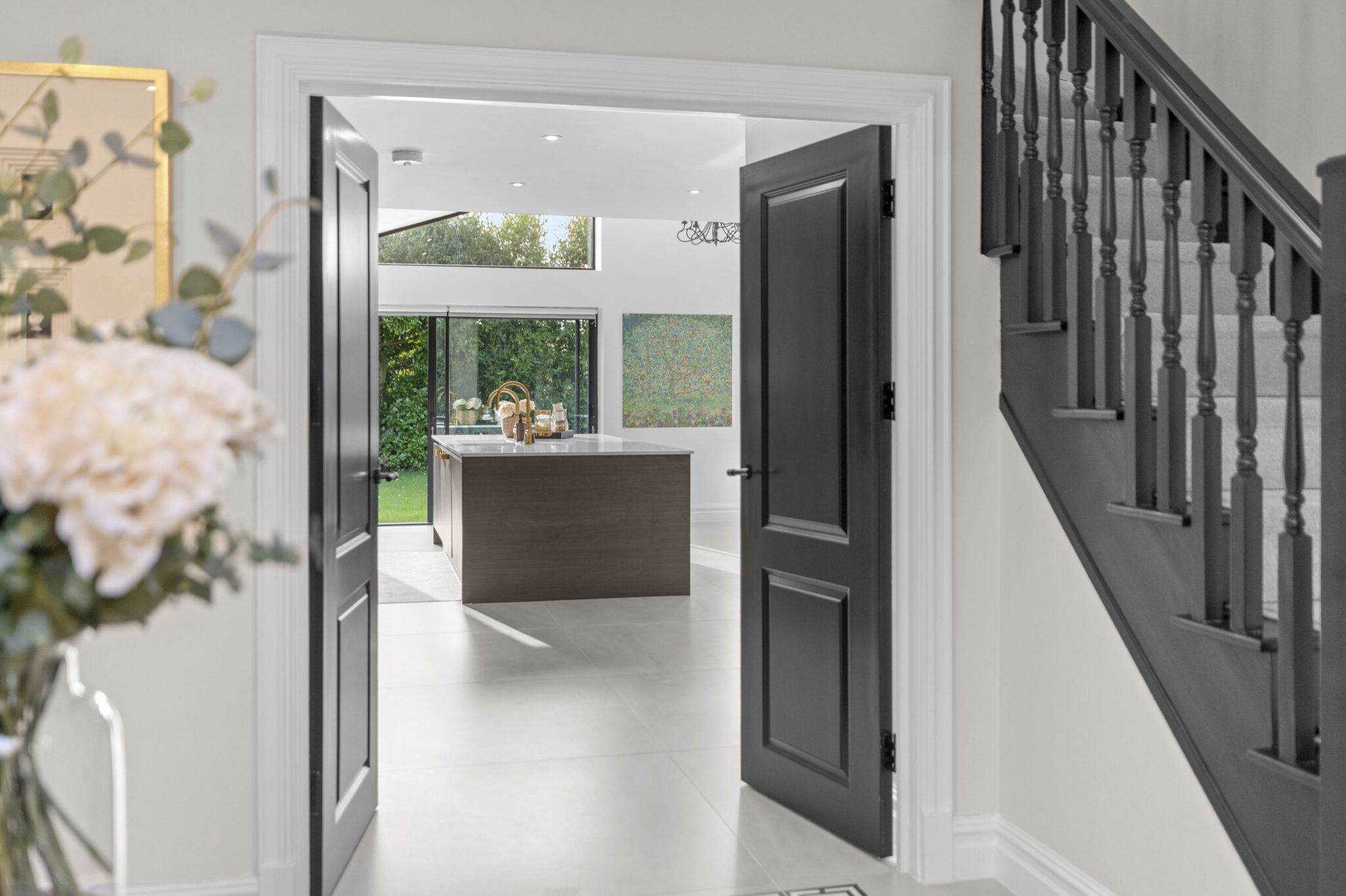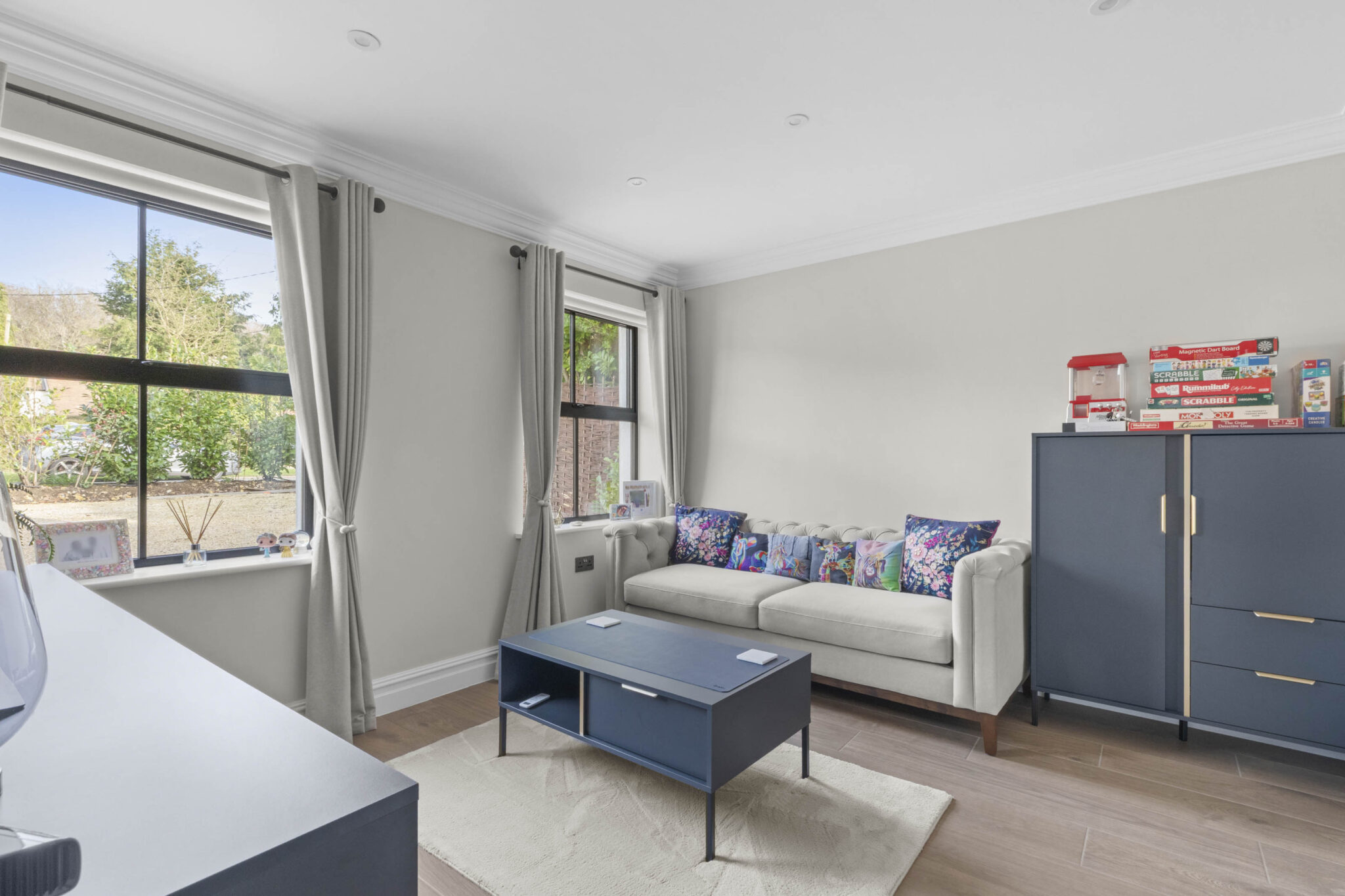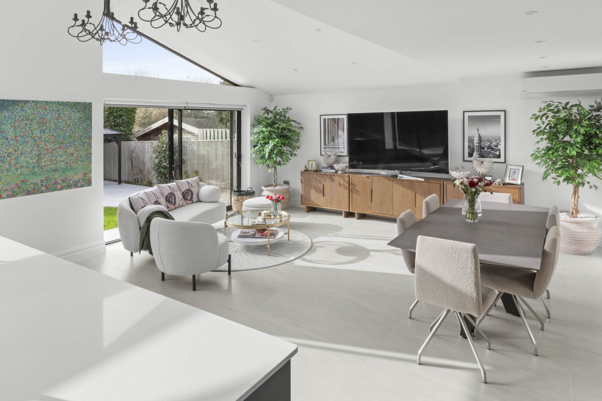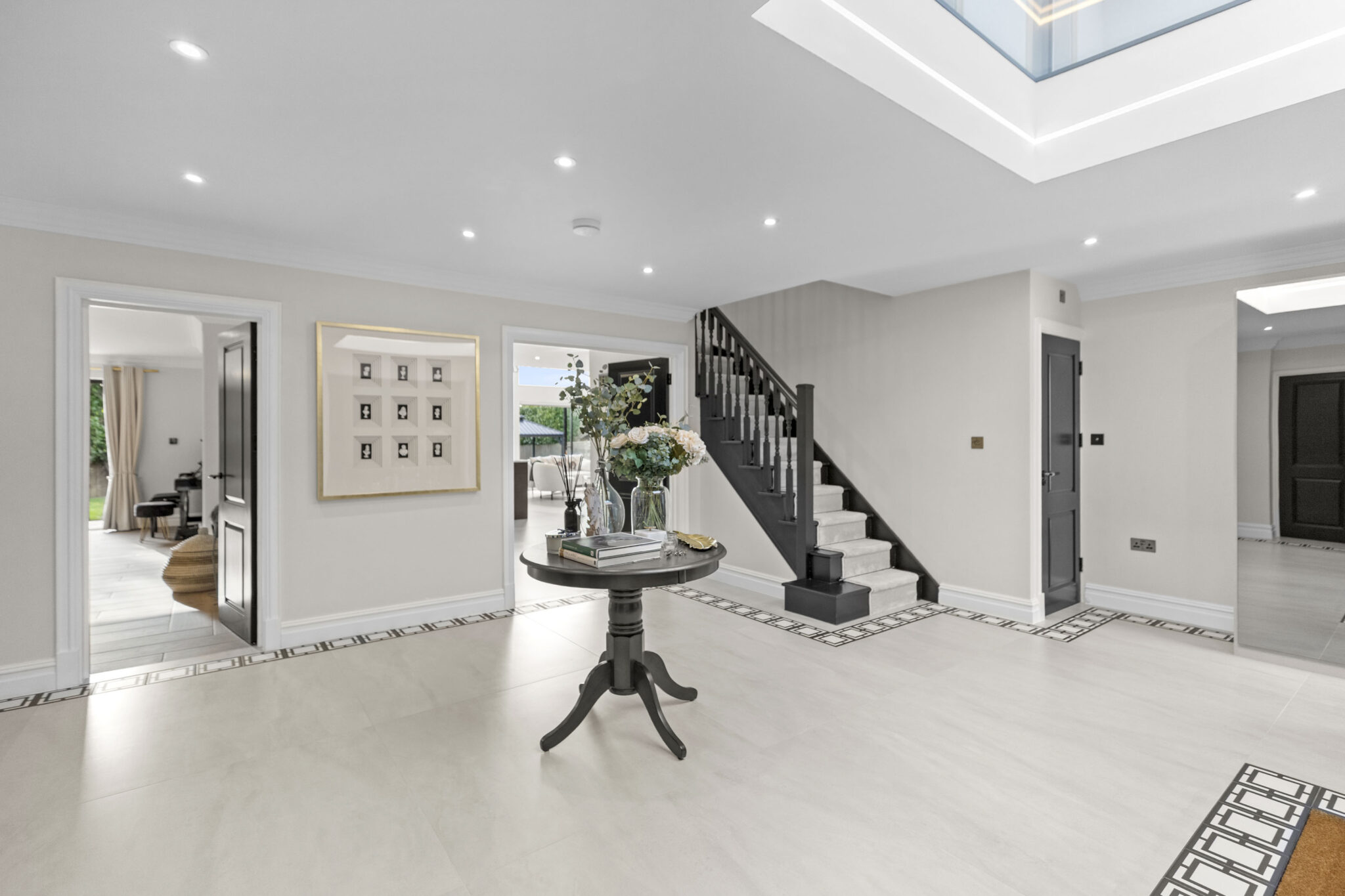 This exceptional five-bedroom, four-bathroom detached house offers a contemporary and luxurious family lifestyle, thoughtfully designed across generous proportions. Upon arrival, the property’s striking modern exterior is complemented by a spacious driveway, double garage, and beautifully landscaped front garden, providing ample parking and impressive kerb appeal. Step through elegant double doors into a welcoming entryway, bathed in natural light from a dramatic skylight and enhanced by sophisticated recessed lighting. The open plan layout seamlessly connects a series of spacious reception rooms, each adorned with modern decor, large windows, and elegant wooden flooring, creating a bright and inviting atmosphere throughout.