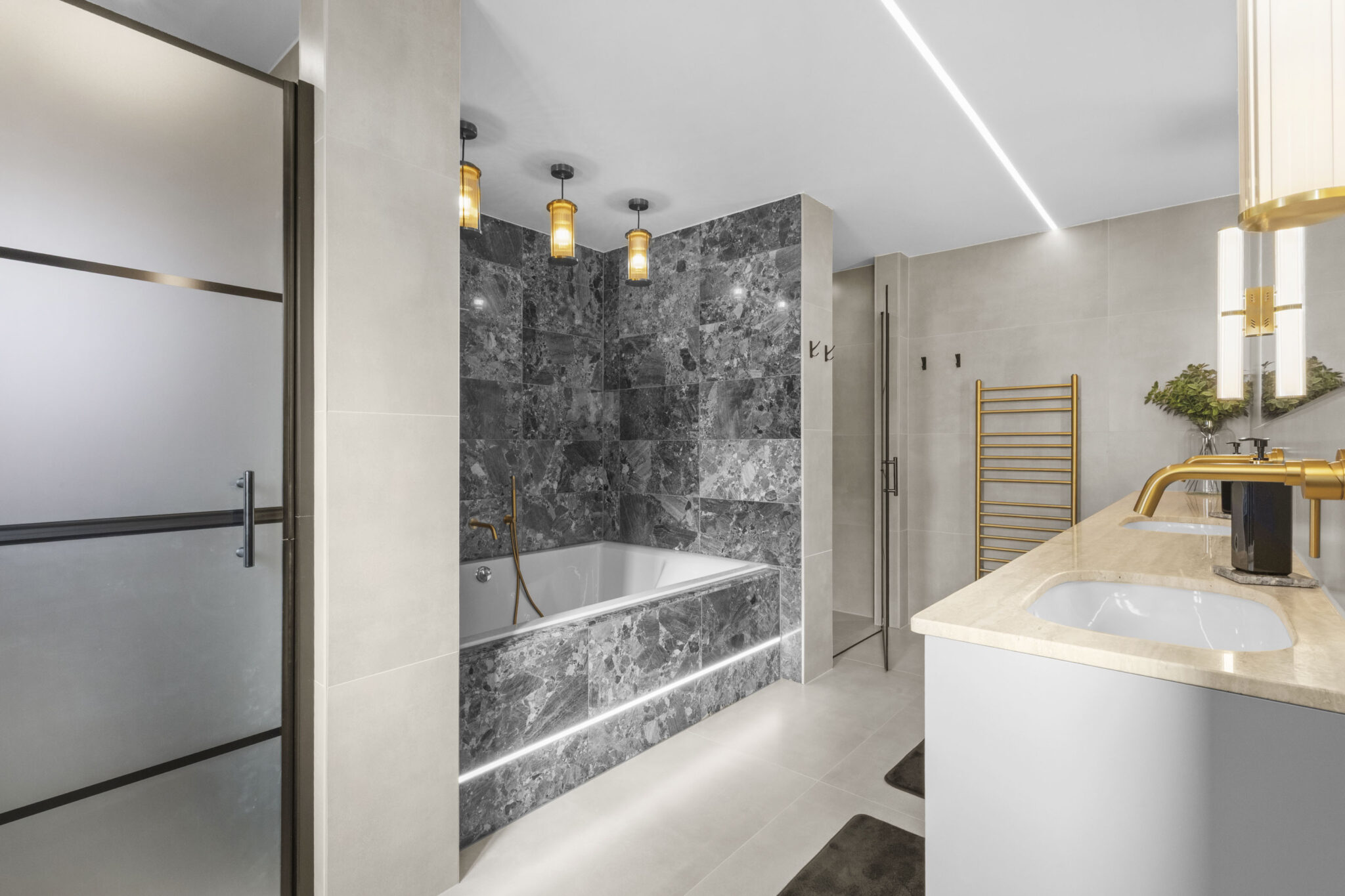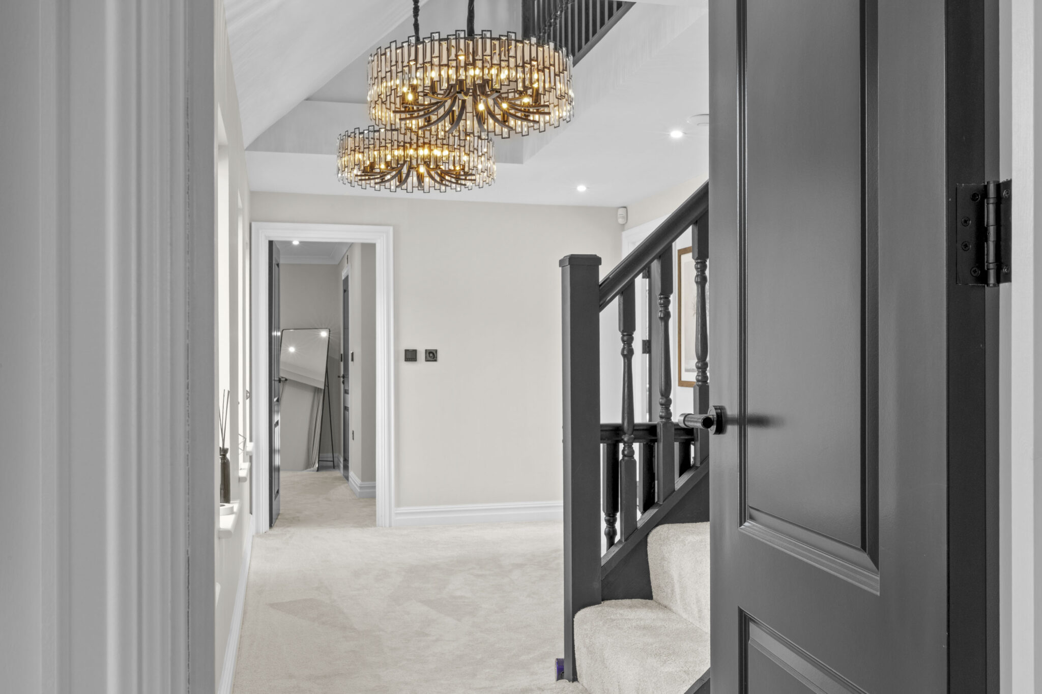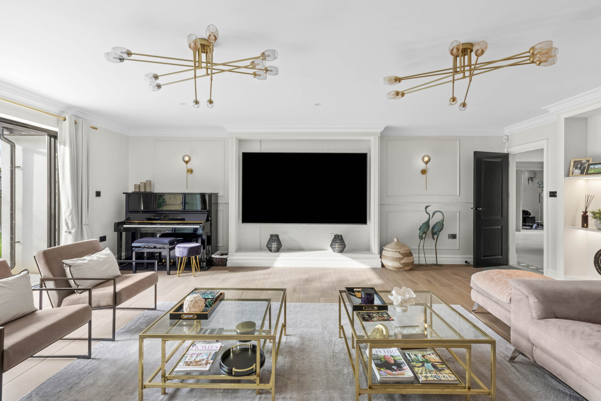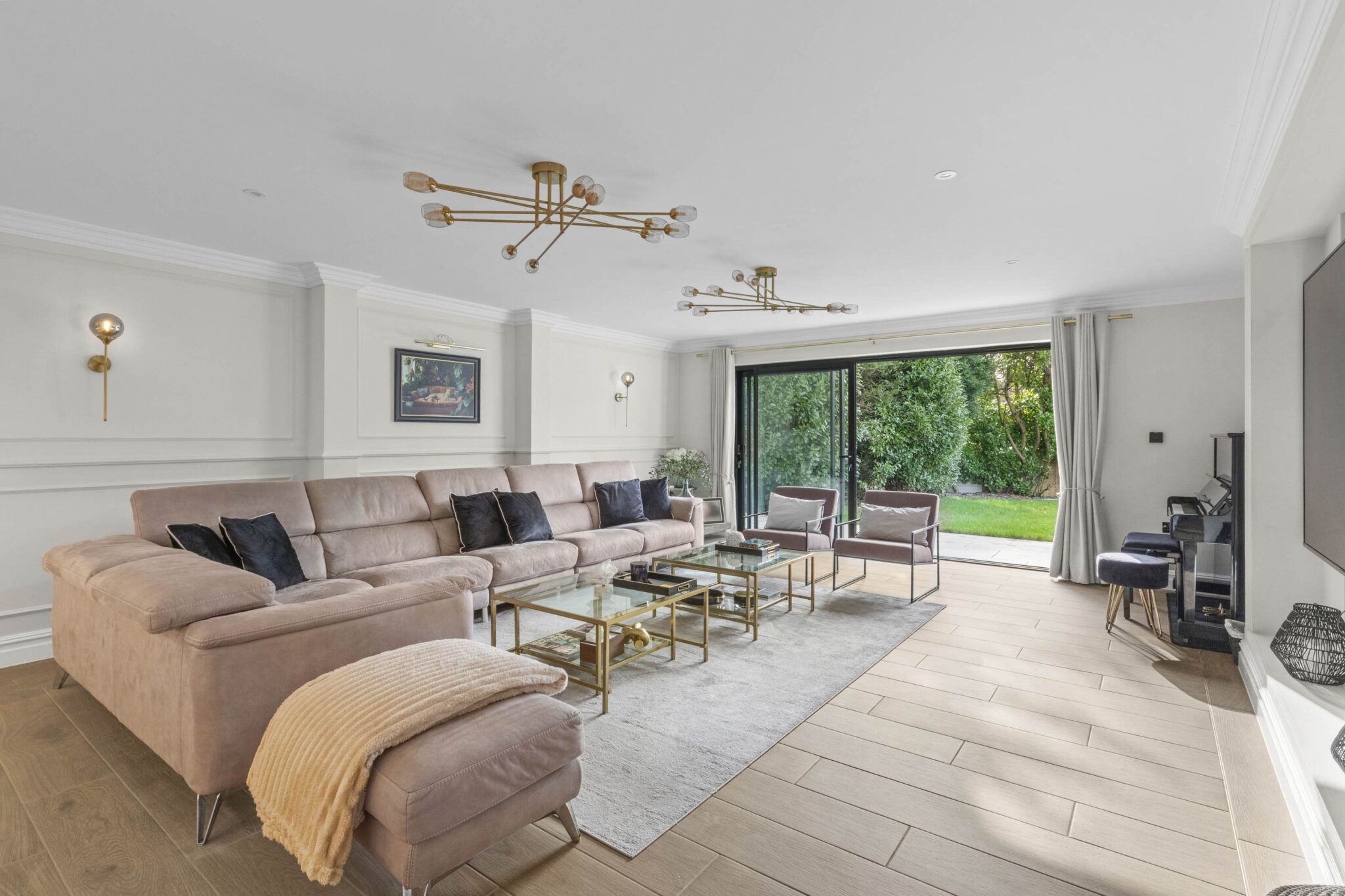 Further enhancing this contemporary home are the four exquisitely finished bathrooms, including spa-inspired features such as walk-in showers, floating vanities, dual sinks with gold accents, heated towel rails, and ambient lighting. The property boasts a series of thoughtfully designed living spaces, including a stylish reception with a grand piano, modern lighting fixtures, and a large wall-mounted TV, perfect for both entertaining and family gatherings. Practical features such as air conditioning, abundant built-in storage, and an integrated garage add to the overall convenience and appeal. Modern chandeliers, elegant staircases, and neutral colour palettes throughout contribute to the home’s sophisticated and welcoming ambience. This outstanding detached residence combines contemporary style with functional family living, offering a sanctuary of comfort, space, and luxury.
