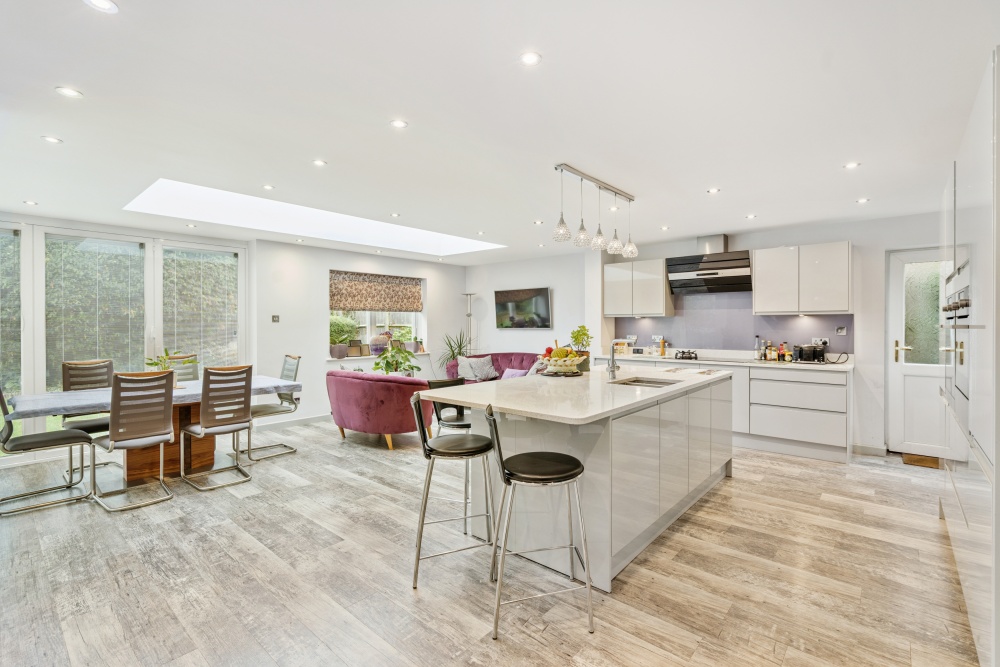 The current owners have thoughtfully extended and updated the property to create an impressive open-plan kitchen/dining room featuring a central island and a separate utility room. The ground floor also includes a dual-aspect sitting room and a versatile reception room which could serve as a home office, playroom, or an additional bedroom, with the adjacent cloakroom offering potential for an ensuite conversion.