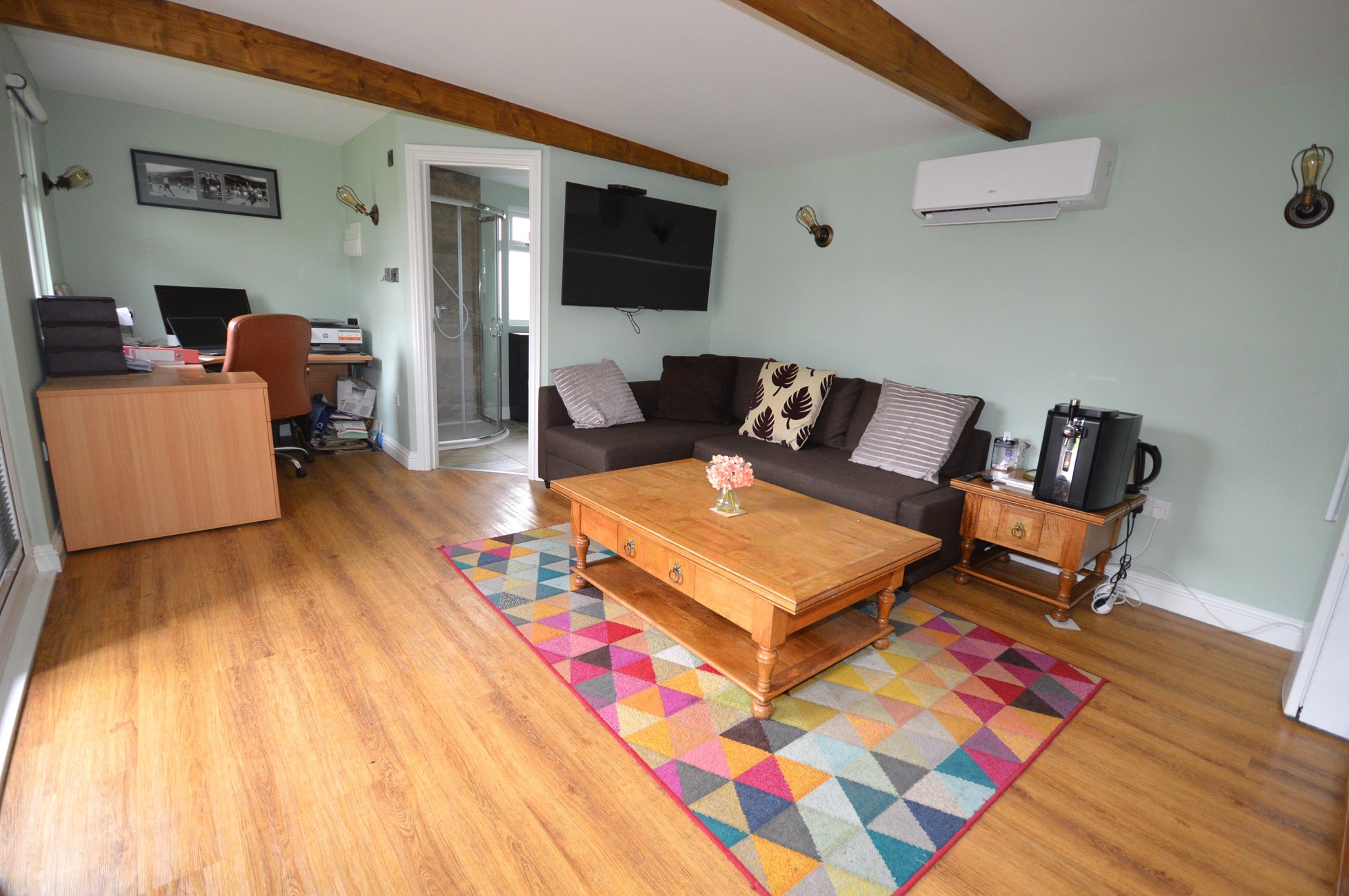 A highlight of this property is the garden room with a shower room, offering a tranquil retreat for relaxation or hosting guests. The enclosed rear garden provides a private outdoor oasis, perfect for al fresco dining or enjoying the fresh air.