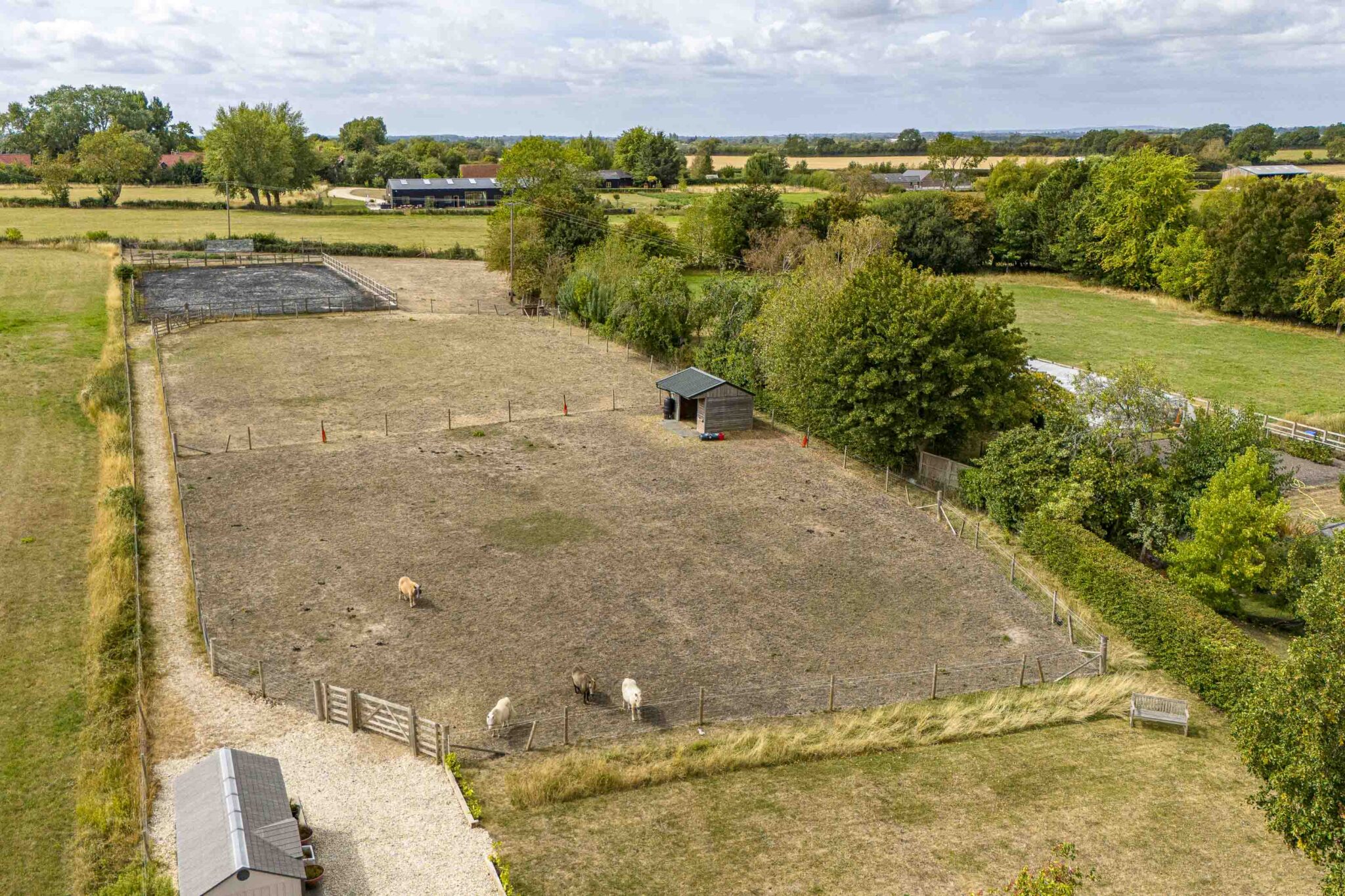 Outside, a large lawned garden with mature trees and a terrace provides an inviting space to relax. Side gated access leads to the well-planned equestrian facilities, comprising a stable yard with three loose boxes and a tack room, along with three paddocks—one with a field shelter—making it perfectly suited for keeping one or two horses at home.