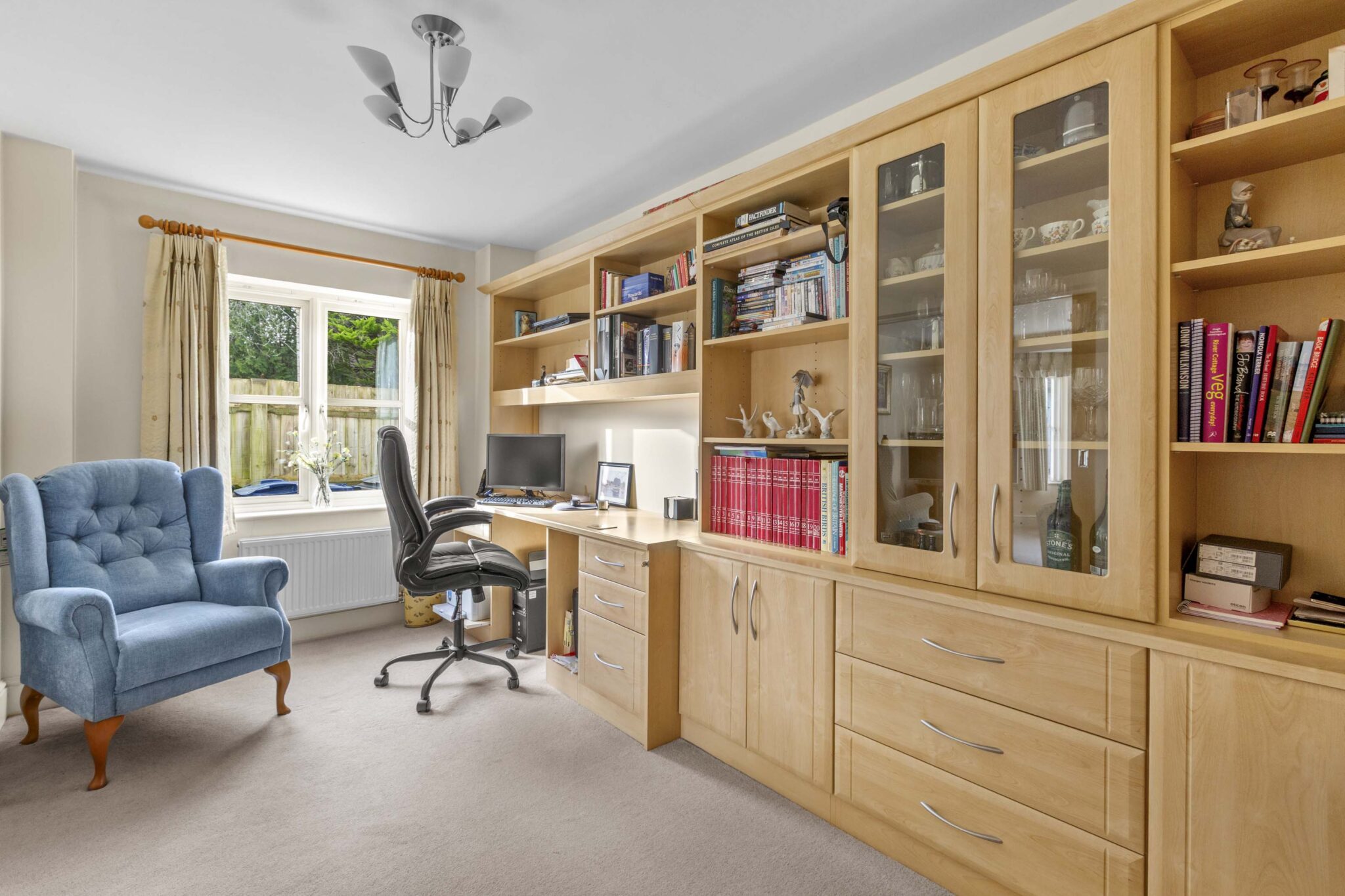 A covered porch opens into a welcoming hallway, setting the tone for the rest of the house. The main living space enjoys excellent natural light from the bay window at the front, with an attractive fireplace creating a cosy focal point. Sliding doors at the rear allow the space to flow easily into a generous study, offering flexibility for home working or additional living space.