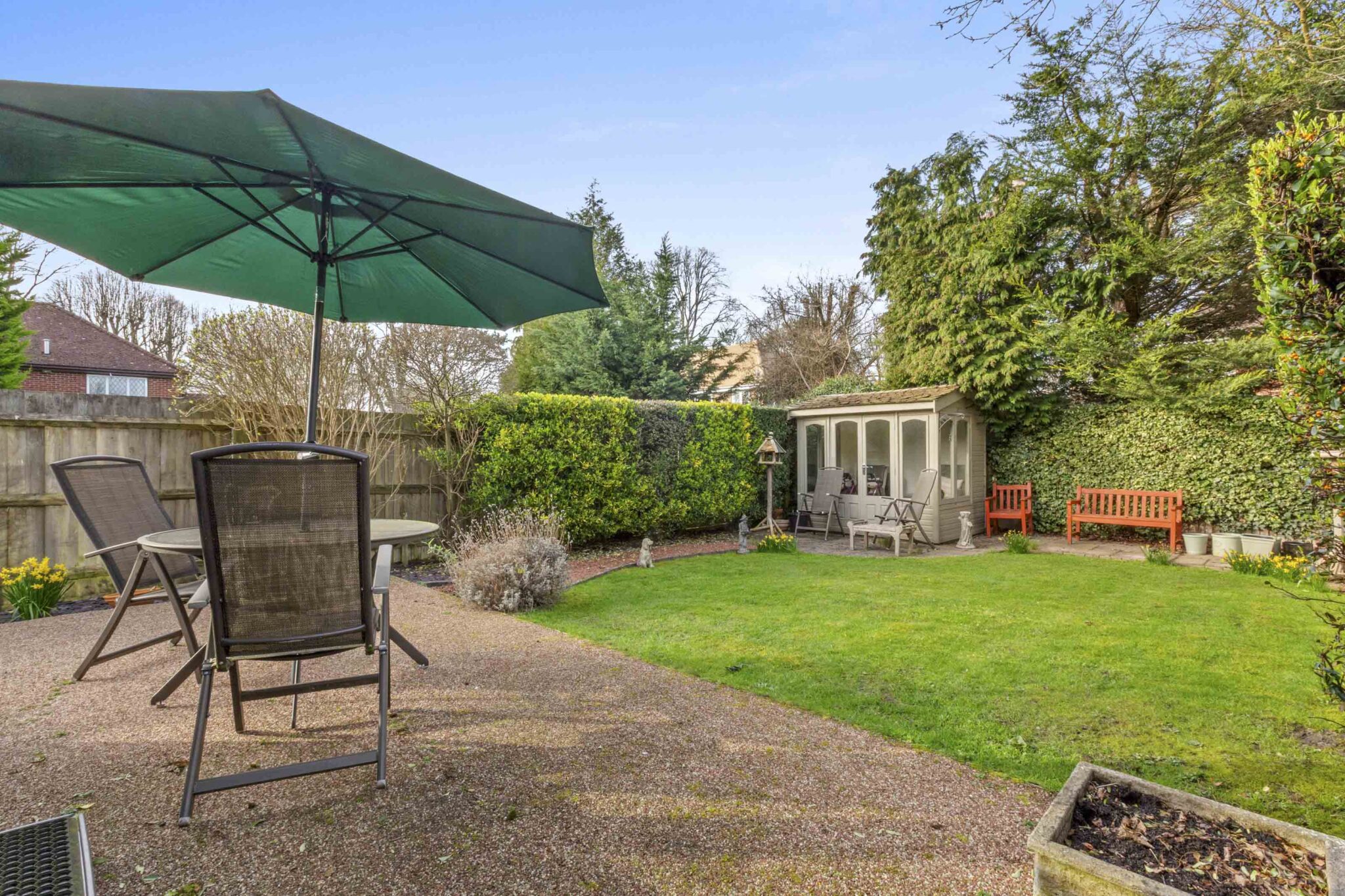 The rear garden feels private and secluded, mainly laid to lawn with a patio for outdoor dining, and residents also enjoy access to the communal grounds. Outside can be found off-street parking.